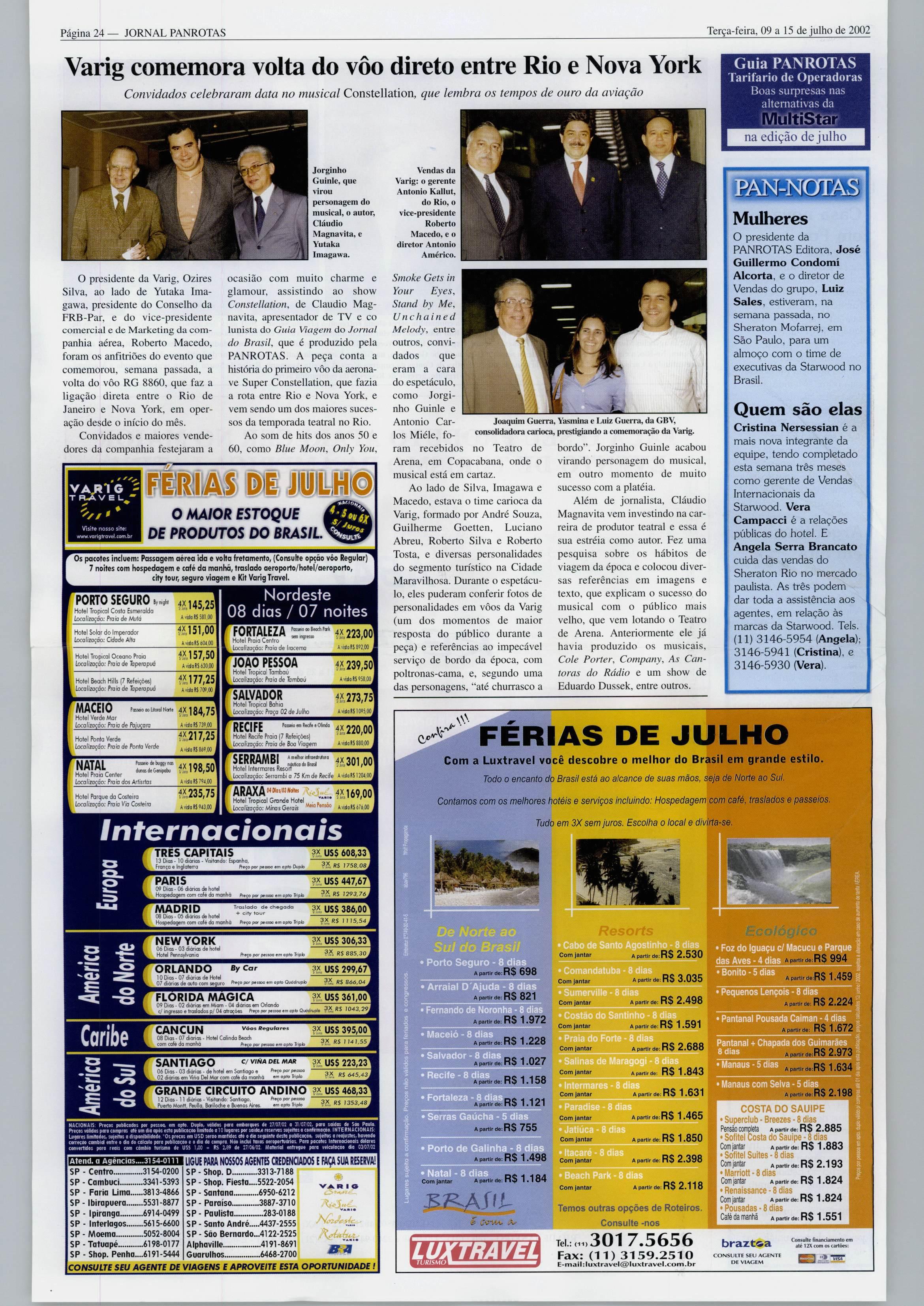 PORTO SEGURO Bímaki 4x i^c 95 Motel Tropical Costo Esmeraldo Locofizoçóo.' Píoio deMutó ' ® Nordeste 08 dias / 07 noites Hotel Sobr do Imperador f 151,00 l«:o)izflçflo;OdadeA/(o ' FORTALEZA ' f?'223,00 noi'íl rcj'". L'iiMiu LocüIÍZüLUü. PiJ.O /.UCirniQ .'i.i PI Hotel Tropical Oceono Proia f^.1 57/50 Loco/(zoçóo:piowde íjperopoá A.iáofl5í3000 JOÃO PESSOA 239,50 Hotel Tropico Tantbau : Locolizoçáo.' Proio de Tombou * Hotel Becsh Hilis (7 Rsfeiqôes) fí, 177,25 tDcoIizaçdo; Prnio de Tbpempuó 4 SS ]0> CO SALVADOR 4^(273,75 Hi^tel Tropical Bahia l.ú';o''izacÓ3: P'aca 02deJui'fK3 A.iaiRSIC''í:'ijú MACEÍO Pbwoi»litoralNcrt« 4X184 75 Hclel Verde Mar '' kico(i2ocáo; Proiode Paiucflu i-dalT3'00 RECIFE Olinda 4X220,00 Hotel Recife Praia (7Refeiç6es| ^ iocijfí7ocòo' de 6ooViagem AviáoRS 660,00 Holei Ponto Verde fí.217,25 Localização; Proio dePonio Verde j 'doflS8ti°ijO natal «198,50 Hotel rrao Center Localiwçdo; Praiados Artisrtos » iSuSíí^jOO SERRAMBI «301,00 Motel InteffTKifes ResoíT LoccIíílxüo.' Set;ü;r)bjo 75 K/íi c/e f^ecíte I Hotal Parque da Costeiro 235,75 loco/iTBçdo; Proio Via Cosleiro .viSaM543.00 ARAXA"™^'"'''^'" fM69,00 Hoiel Tropical Grandehotel Ioco!Í2oçóo: Minas Gerais '^eioPensao Internacionais TRES CAPITAIS 13 Oios - 10 dionos - vlstando. bponho francae Ingloteiro poroessoc PARIS 09Dias- Oó dcanas de hot«l Hoseedaqsm comcofedo monho ft.co MADRID Dioi - OS diatias de hotef osnedagert rsm coIa NEW YORK Oc» Oio£ - 03 diorioi de notei HofeI PennsvI/onia ORLANDO sy cor 10 Dioi - 07 dicjfius deHotel 07 diflfiosde outo com seguro FLORIDA MAGICA 0^ Dias - 02 diOfiQS ôti Miam - 04 danos em OHondo ^ inqri?s.-c-f traslodos p' Od otrocoçs CANCUN Vôos ff»9u/0r«$ Oia^ - 0" dsonos - Hotel Cdindo B«3th cofâ do niíinha Aece oof muoc em opto Tnpb SANTIAGO VINADÍLMAR yx usj 223,23 06 Didí 63 dianas -dehotelem Sontiagoe .||'JÍ|-J-. ei- '•n'i L'=l MJI '"'111 .1.1 t-' no"» 3X USS 608,33 pto Oupto RS 1758 08 USS 447,67 RS I?93,76 USS386,00 3* RS II J5 54 USS306,33 3*. RS 885,30 USS 299,67 RS 866,04 USS 361,00 CAj 0>x*J'tple 3;k rs 1013.29 USS 395,00 3X RS; M 55 RS 645 GRANDE CIRCUITO ANDINO 3X USS 468,33 •-•ir-ord- ^Cln^Puç'f.. .v..iiin F'-i'l B^jtibi Iv; .f -jres t RS HACtONAIS PiK«s iMblcaMs por ptssMi m ii|itD DvM, nltf«s pae tmbnquK di 77V/ftl t 31''07'0:. p«g soMk it Soa Pauli. Ptkqsvoltdasp<rscomfrK otevin4i<ivosKMpul>llco(aeltniit84ee10liisgrt;p»r soiilo4mervg:»|cin!«unftin(a>. INTERNACIONAIS: llmiHHit!. w|«itDS a dismiliiHikHlc 'Oipr«c*scniUSDMraemaFlWK Á odnsegunKfKlspiAlicorat. wiiitts arM|ustc$>lwycadt cerrKMcanbld entree tfa do calculo »orii pubUcacot < o dlo <oconpra Hoo inckil tocos dMopaituvIas. Pan pocstes IntiraiKloatIs Wsns convertidos poro r««is com còmblo turismo de USS 140 ^ ItS it 27 060? Mot«rlal «rtnfve pai< vtiailocco Ao 01D7.t2 Atend. a Agéncias.^.3154-0111 SP - Centro 3154-0200 SP-Combud 3341-5393 SP Faria Lima 3813-4866 SP- Ibirapuero 5531-8877 SP- Ipiranga 6914-0499 SP- Interlagos 5615-6600 SP - Moema 5052-8004 SP-Totuapé 6198-0177 SP• Shop. Penha....6191-5444 LIGUE PAU NOSSOS AÕENISS CKEDENCIADOS i FAÇA SUA mm SP-Shop. D3313-7188 SP -Shop. Fiesta....5522-2054 SP-Santana 6950-6212 SP - Paraíso 3887-3710 SP - Paulista 283-0188 SP - Santo André 4437-2555 SP - São Bernardo...4122-2525 Alphaville 4191-8691 Guarulhos... 6468-2700 I O CONSULTE seu A6EHTE DE VMGFNS f APItOVElTE ESTA OPORTUNIDADE! Vendas da Varig: o gerente Antonio Kallul, do Rio, o vice-presidente Roberto Macedo, eo diretor Antonio Américo. Smoke Gets in Your Eyes, Stand byMe, Unchained Melody, entre outros, convi dados que eram a cara do espetáculo, como Jorginho Guinle e Antonio