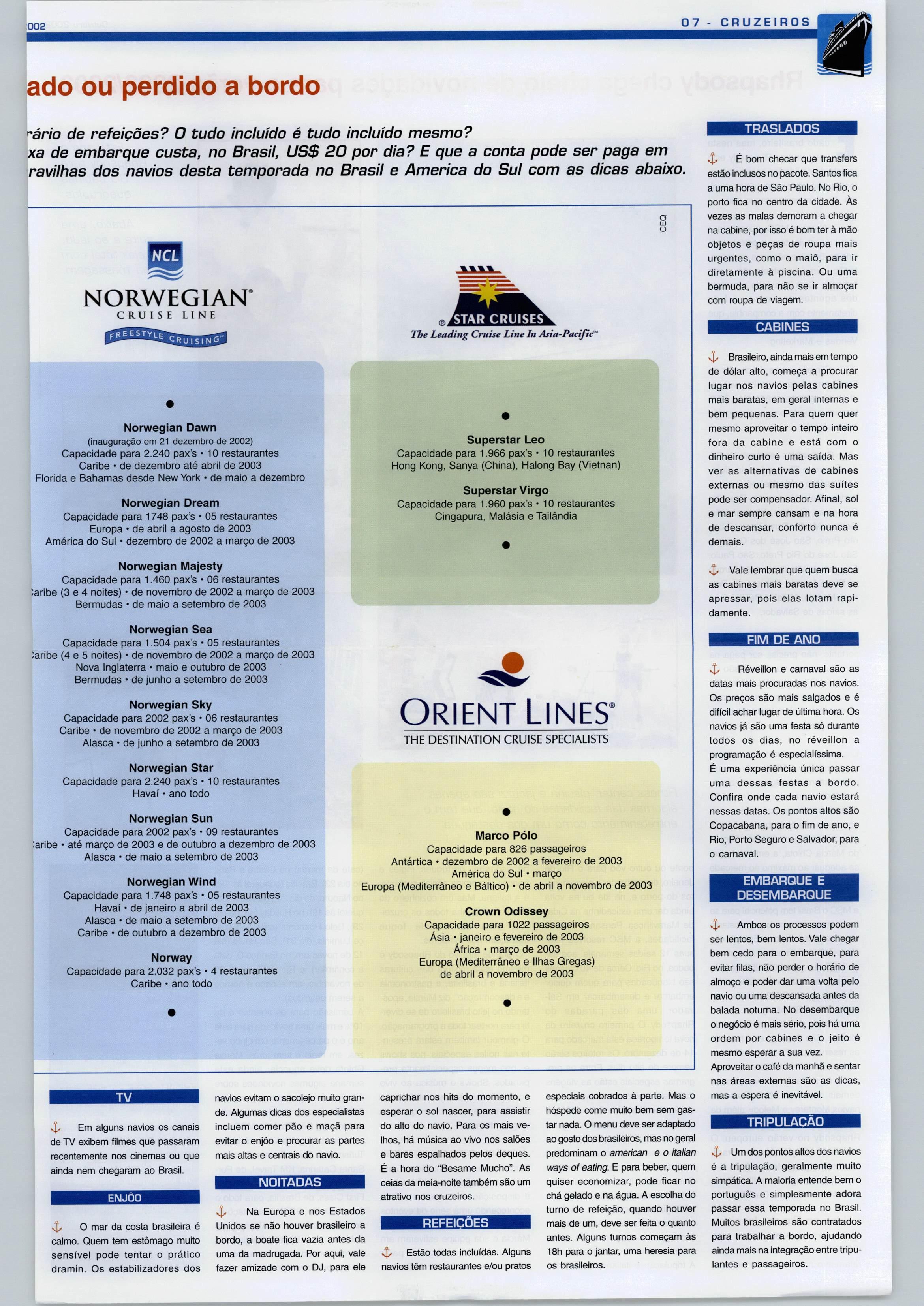 Onaviotem tudo para agradar o turista doBrasil, que assim como os outros passageiros vai poder usufruirdo programa Freestyle, im plantado pela companhia há dois anos. Ofocodo projeto éo atendi mento ao viajante, por isso a em presa aumentou o número de tri pulantes, disponibilizando uma média deum funcionário por cabine.Outra vantagem apontada por Esteia, éo número de restauran tes ea variedade de horários para