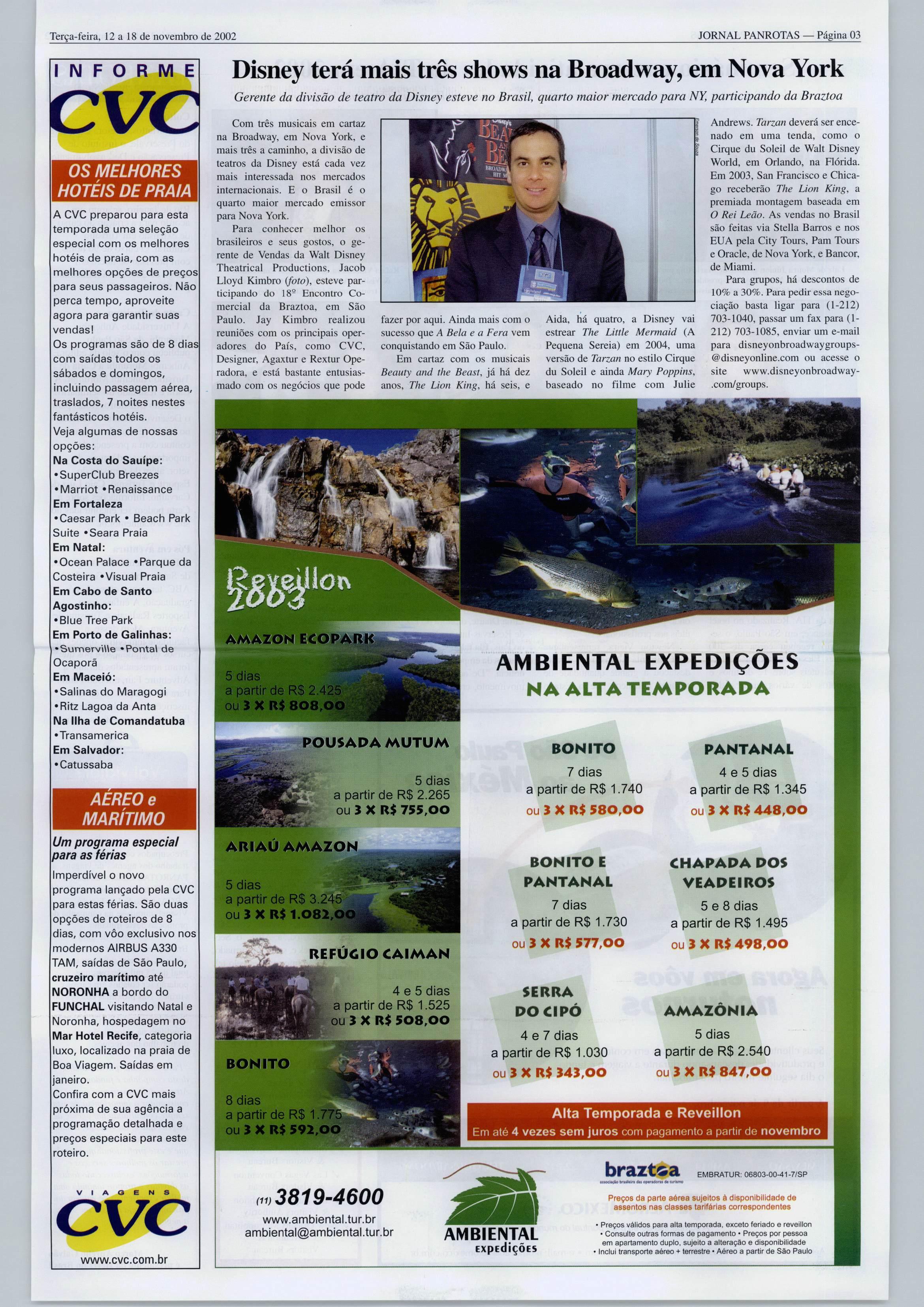 que A Bela ea Fera vem conquistando emSãoPaulo. Em cartaz com os musicais Beauty and the Beasí, já hádez anos, TheLion King, há seis, e Aida,há quatro, a Disney vai estrear The Little Mermaid (A Pequena Sereia) em 2004, uma versão de Tarzan no estilo Cirque du Soleil e ainda Mary Poppins, baseado no filme com Julie Andrews. Tarzan deverá ser ence nado em uma tenda, como o CirqueduSoleilde Walt Disney World, em Orlando, na Flórida. Em 2003, San Francisco e Chica go receberão TheLionKing,a premiada montagem baseada em O Rei Leão. As vendas no Brasil são feitas via Stella Barros e nos EUA pela City Tours,PamTours e Oracle, de Nova York, e Bancor, de Miami. Para grupos, há descontos de 10% a 30%. Para pedir essa nego ciaçãobastaligarpara(1-212) 703-1040, passar umfax para (1212) 703-1085, enviar um e-mail para disneyonbroadwaygroups@ disneyonline.com ou acesse o site www.disneyonbroadway.com/groups. 5 dias a partir de R$ 2.265 ou 3 X R$ 755.00 AMBIENTAL EXPEDIÇÕES NA ALTA TEMPORADA BONITO 7 dias apartir de R$ 1.740 ou 3 X 11$ 580,00 BONITO E PANTANAL 7 dias apartir de R$ 1.730 ou 3 X R$ 577,OO PANTANAL 4e5 dias apartir de R$ 1.345 ou 3 X R$ 448,00 CHAPADA DOS VEADEIROS 5e8 dias apartir de R$ 1.495 ou 3 X R$ 498,00 REFUCIOCAIMAN BONITO 8 dias a partir de R$1. ou3X R$ 592,0 av 3819-4600 www.anribiental.tur.br ambiental@ambiental.tur.br 4e5 dias a partir de R$ 1.525 ou 3X R$ 508,00 SERRA DOCiPO 4e7 dias apartir de R$ 1.030 ou3X R$ 343,OO AMAZÔNIA 5 dias apartir de R$ 2.540 ou3X R$ 847,00 Alta Temporada e Reveillon Em até 4 vezes sem juros com pagamento apartirde novembro AMBIEÍNTAL EXpEdíÇÕES EMBRATUR: 06803-00-41-7/SP mocucl» Bfilttfi 0u MtfMo/n tf* Preços da parte aérea sujeitos á disponibilidade de assentos nas classes tarifárias correspondentes Preços válidos para alta temporada, exceto feriado ereveillon Consulte outras formas de pagamento Preços por pessoa em apartamento duplo, sujeito a alteração e disponibilidade Inclui b'ansporte aéreo + terrestre • Aéreo apartirde São Paulo