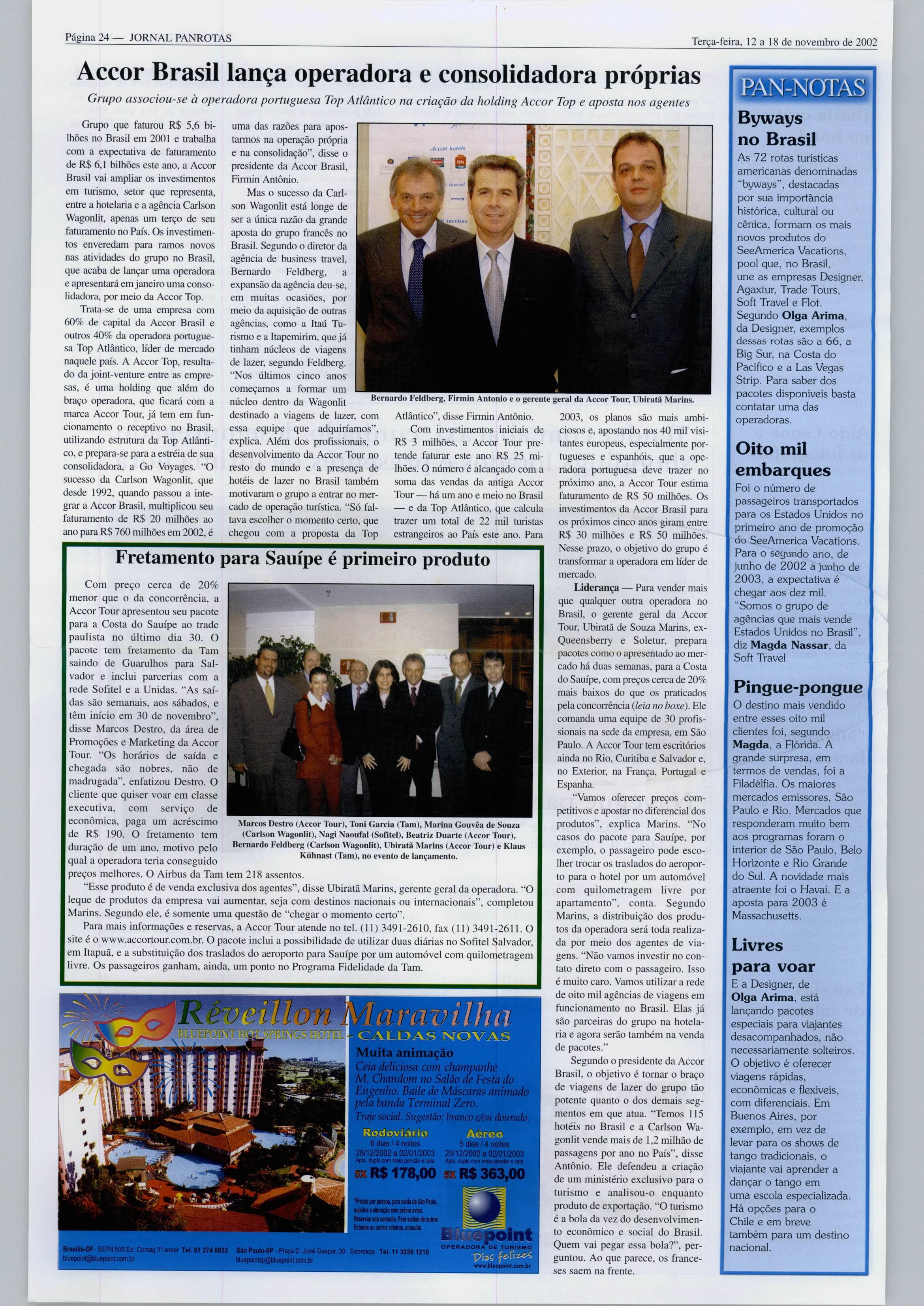 • Resewe WG: 0300-213-462 PANROTAS TRAVEL ACE INIIVNATIAMAL IMASGroup Alamo X www.panrotas.com.br PERIODICIDADE SEMANAL N® 524 12 A 18 NOVEMBRO DE 2002 ANO X EXhMPLAR avulso: RS 3.50 Accor cria operadora e consoüdadora BraztOa lailCâ SCgUrO CStC mêS I• IMIII <m 1 D,-..- « 5 Pormeiodaparceriacoma operadoraportuguesaTopAtlântico, aAccorBrasilanunciouacriaçãoda AccorTop,operadora turística do grupoquetrabalharásobamarca