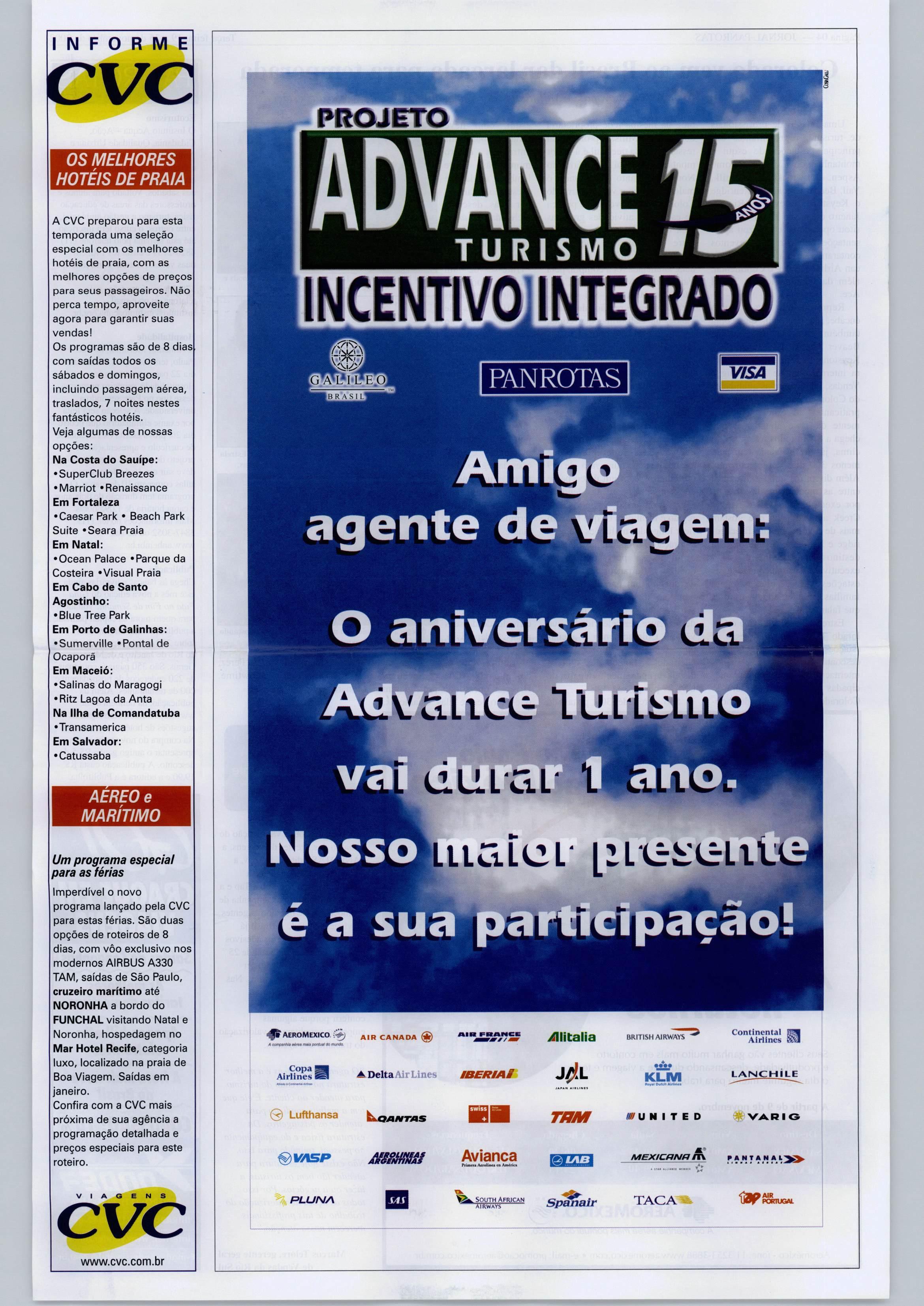 TAM, saídas de São Paulo, cruzeiro marítimo até NORONHA a bordo do FUNCHAL visitando Natal e Noronha, hospedagem no Mar Hotel Recife, categoria luxo, localizado na praia de Boa Viagem. Saídas em janeiro. Confira com a CVC mais próxima de sua agência a programação detalhada e preços especiais para este roteiro. VIAGENS CVC www.cvc.com.br PAN ROTAS agente de O aniversari lUL tllLLCiL ano Nosso ILCiLCL (cLll ea sua AEROMEXICO.AIR CANADA ^ •.Delta Air Lines ÊBERIAã A M/V* fWiJ /WKuiWJO fTH/ftOO. ^IÍt8lÍ8 BRmSHAIRWAYS Copa I Airlines I Lufthansa Loawtms V/SR Jíemm Avlanca KLM TfJM UNITED ^ ÍAB /K MEXÊCRNa PLUrsiA SpaSa/r TACAm Continental Airllnes LANCHILE VA.RIG .H»AA fonusu.