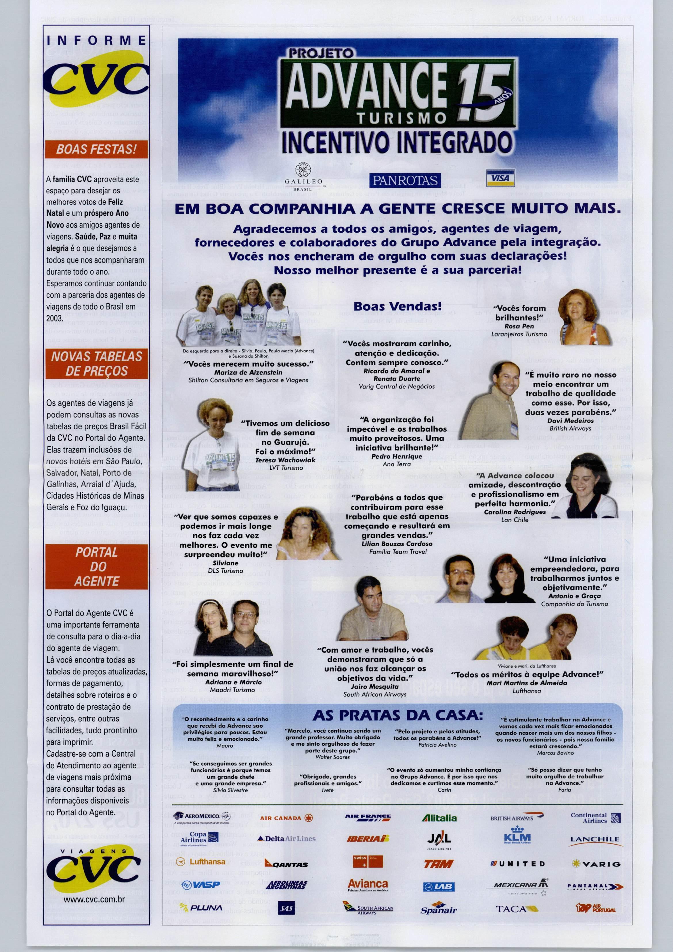 Afamília CVC aproveitaeste espaçoparadesejaros melhores votos de Feliz Natal 8 umprósperoAno Novoaosamigosagentesde viagens. Saúde,Pazemuita alegriaéoquedesejamosa todosquenosacompanharam durante todo o ano. Esperamoscontinuarcontando comaparceriadosagentesde viagens detodoo Brasil em 2003.