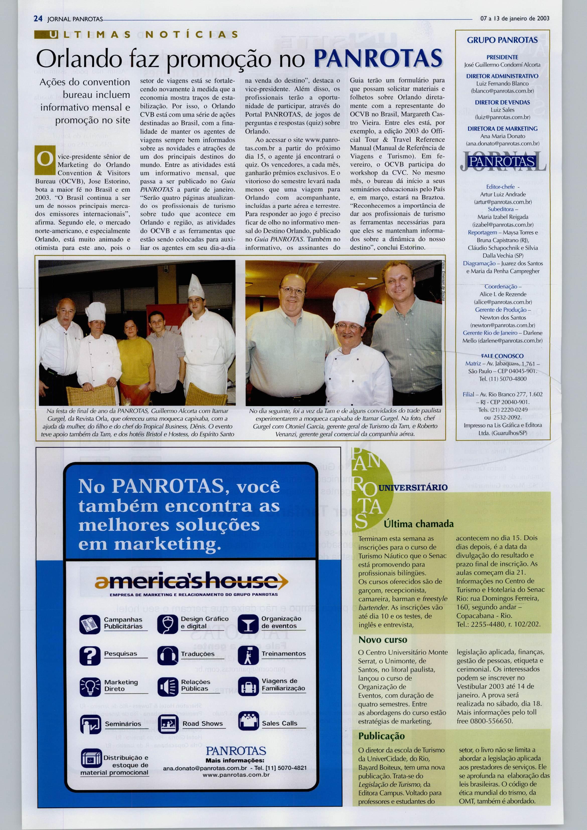 setor de viagens está se fortale cendo novamente à medida que a economia mostra traços de esta bilização. Porisso,o Orlando CVB está com uma série de ações destinadas ao Brasil, com a fina lidade de manter os agentes de viagens sempre bem informados sobre as novidades e atrações de umdos principais destinos do mundo. Entre as atividades está um informativo mensal, que passa a ser publicado no Guia PANROTASa partir de janeiro. "Serão quatro páginas atualizan do os profissionais de turismo sobre tudo que acontece em Orlando e região, as atividades do OCVB eas ferramentas que estão sendo colocadas para auxi liar os agentes emseu dia-a-dia