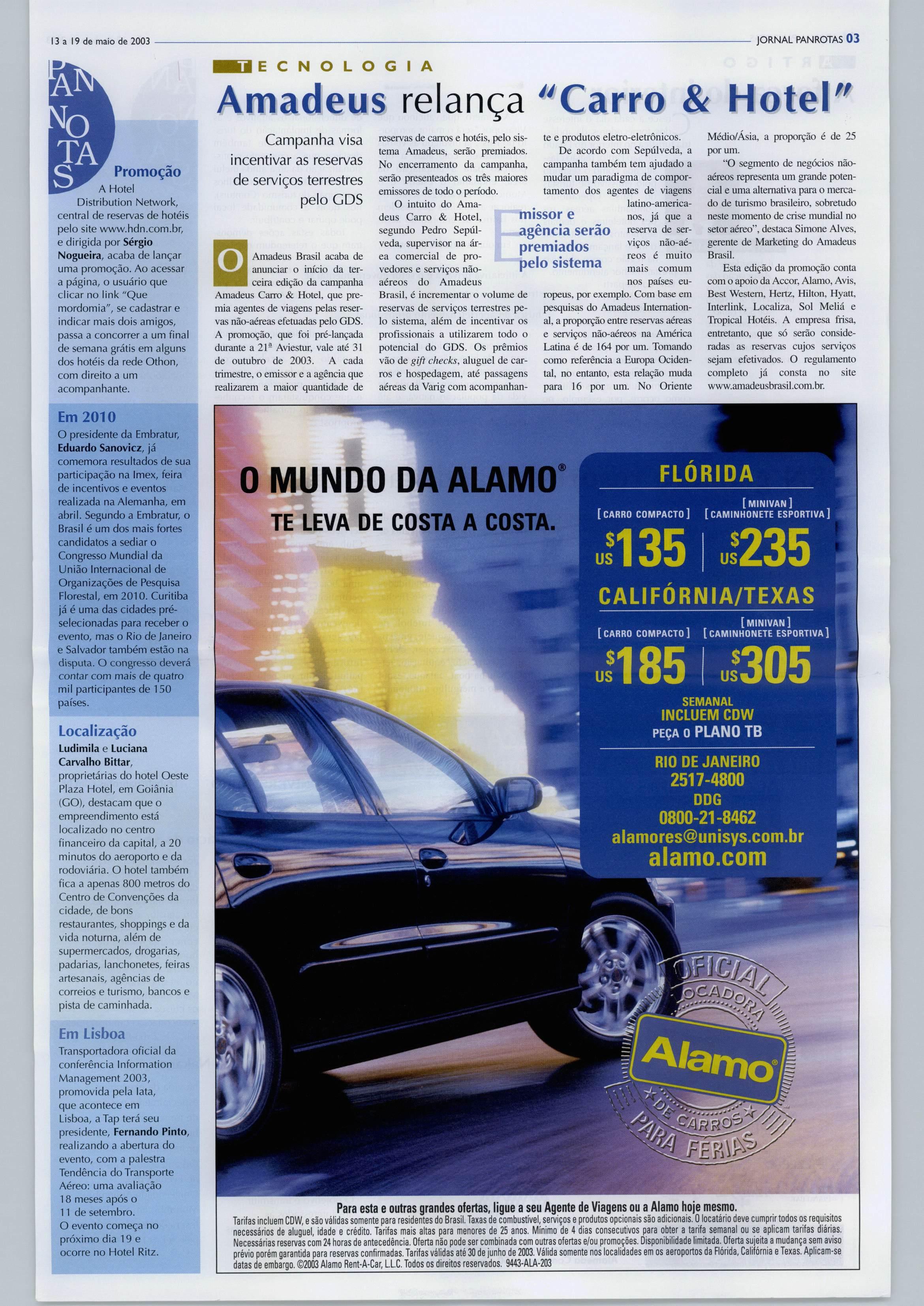 alamo.com m Para esta e outras grandes ofertas, ligue a seu Agente de Viagens ou a Alamo hoie mesmo. Tarifas incluem CDW, e são válidas somente para residentes do Brasil. Taxas de combustível, serviços e produtos opcionais são adicionais, Olocatário deve cumprirtodos os requisitos necessários de aluguel, idade e crédito. Tarifas mais altas para menores de 25 anos. Mínimo de 4 dias consecutivos para obter a tarifa semanal ou se aplicam tarifas diárias. Necessárias reservas com 24 horas de antecedência. Oferta não pode ser combinada com outras ofertas e/ou promoções, Disponibilidade limitada, Oferta sujeita a mudança sem aviso prévio porém garantida para reservas confirmadas. Tarifas válidas até 30 de junho de 2003, Válida somente nos localidades em os aeroportos da Flórida, Califórnia eTexas. Aplicam-se datas de embargo, ©2003 Alamo Rent-A-Car, LLC. Todos os direitos reservados, 9443-ALA-203
