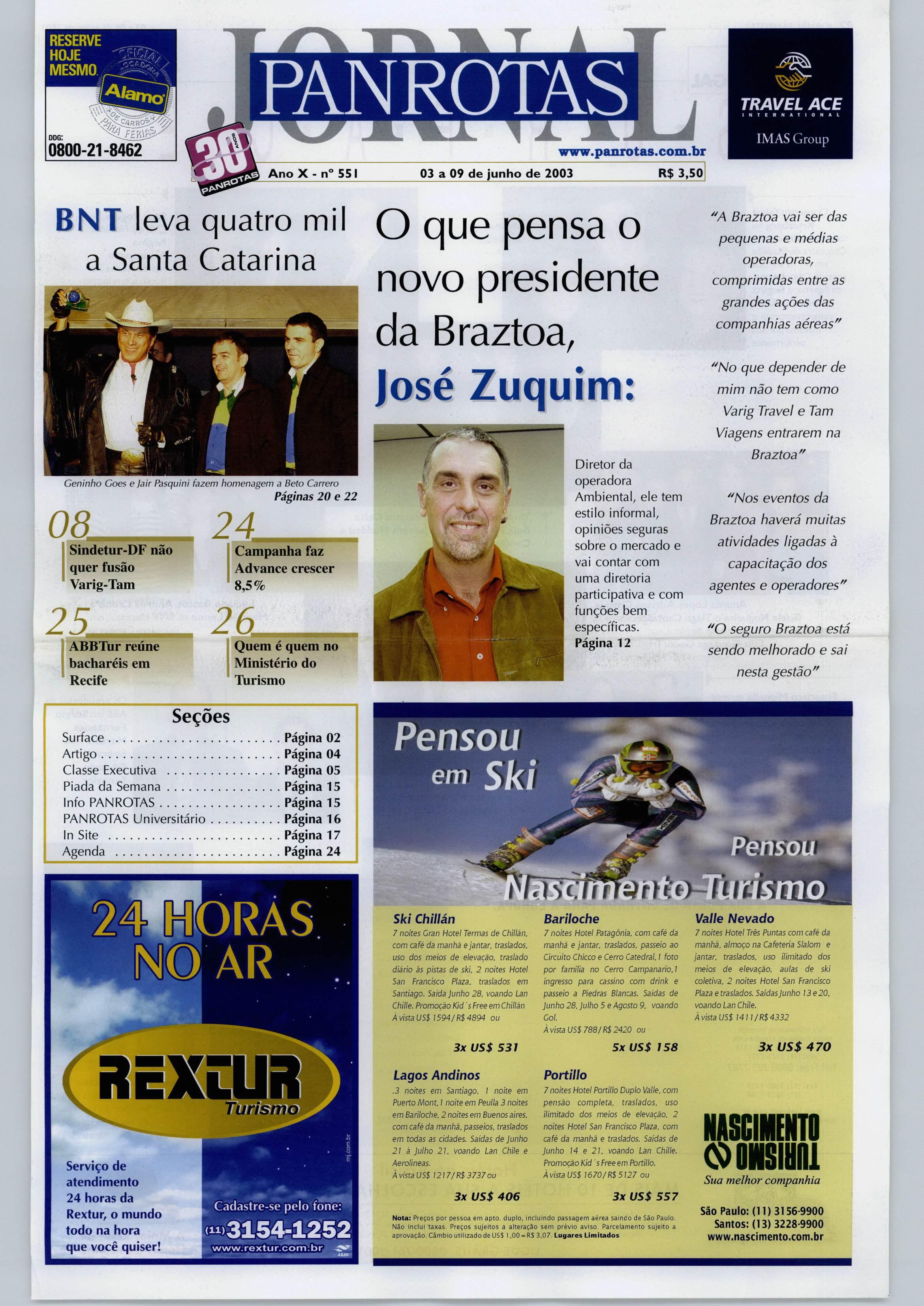 i RESERVE HOJE MESMO -APí-tiO ddg; fry.Vr^ PANROTAS 0800-21-8462 www.panTOtas.com.br TRAVEL ACE INTCIIHATIONAL IMAS Group AnoX-n*" 551 03 a 09 de junho de 2003 R$ 3,50 BNT leva quatro mil Q que pensaO a Santa Catarina „ „ • j novo presidente da Braztoa, José Zuquim: Geninho GoeseJair f^squini fazem homenagem aBetoCarrero Páginas 20 e 22 08. Sindetur-DF não quer fusão Varig-Tam 25 ABBl\ir reúne bacharéis em Recife 24 Campanha faz Advance crescer 8,5% 26 Quem é quem no Ministério do Tiirismo Seções Surface Página02 Artigo Página04 Classe Executiva Página05 PiadadaSemana Página 15 Info PANROTAS Página15 PANROTAS Universitário Página16 InSite Página 17 Agenda Página24 AR REXlUR Serviço de atendimento 24 horas da Rextur, o mundo todo na hora que você quiser! Turismo Ski Chillán 7 noites Cran Hotel Termas de Chillán. comcaféda manhà ejantar, traslados, usodosmeiosde elevação, traslado diárioàspistasdeski.2noitesHotel SanFrancisco Plaza. traslados em Santiago.SaldaJunho28.voandoLan Chille. PromoçãoKid 'sFreeem Chillán ÀvistaUSS 1594/R$4894 ou 3x U5$ 531 Lagos Andinos .3noitesemSantiago.Inoiteem Puerto Mont. 1 noite em Peulia 3 noites em Bariloche. 2 noites em Buenos aires. comcaféda manhã, passeios,traslados emtodasascidades.SaidasdeJunho 21 à Julho21.voandoLanChilee Aerolineas. ÀvistaUSS 12}7/R$3737ou