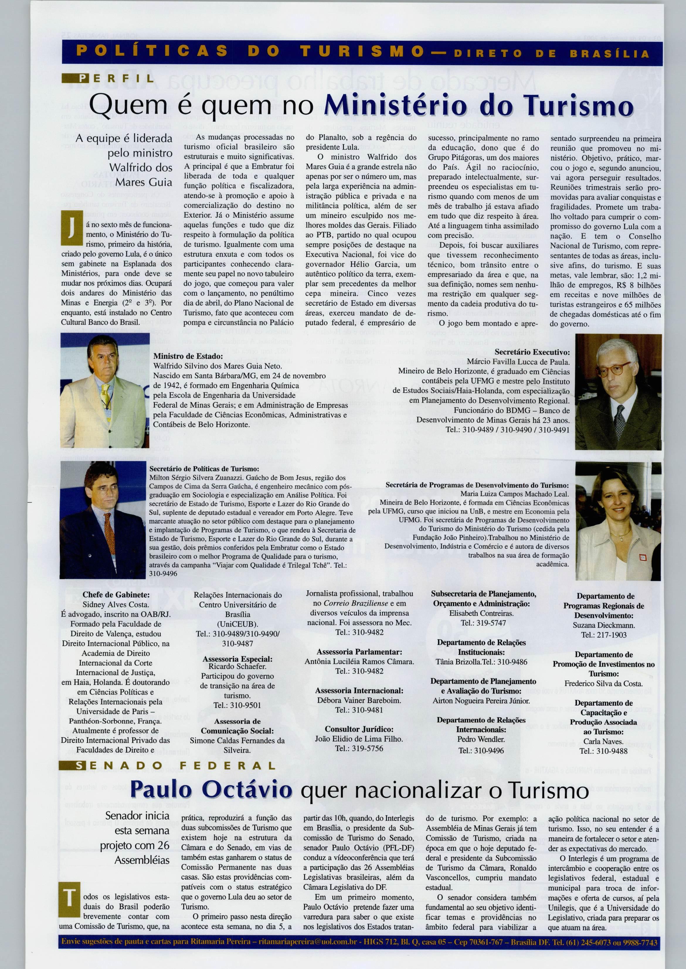 Assessoria Especial: Ricardo Schaefer. Participou do governo de transição na área de turismo. Tel.: 310-9501