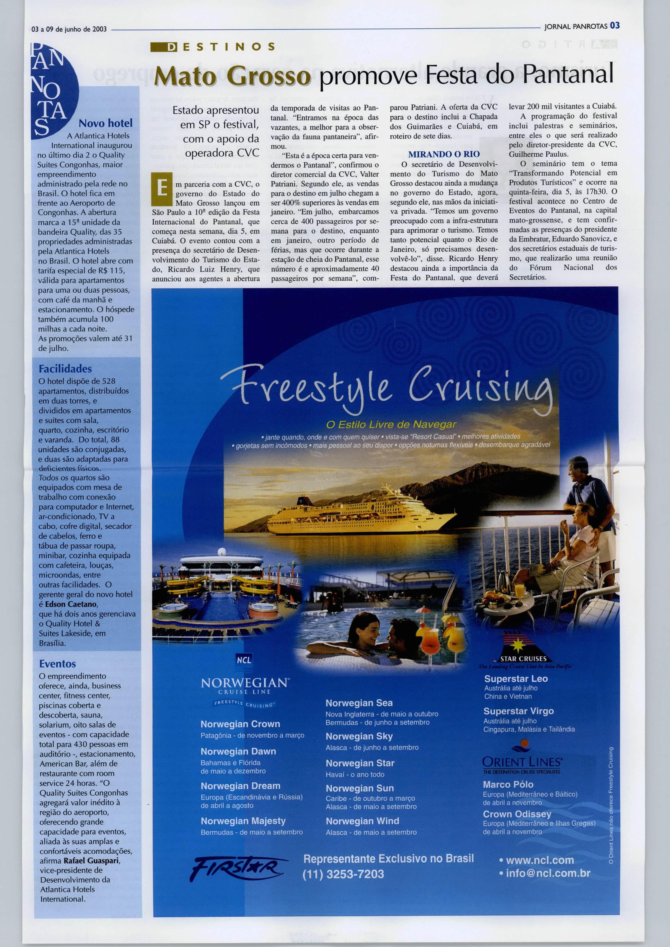 m parceria com aCVC,o governo do Estado do Mato Grosso lançou em São Paulo a10- edição da Festa Internacional do Pantanal, que começa nesta semana, dia5,em Cuiabá, o evento contou com a presença do secretário de Desen volvimento do Turismo do Esta do, Ricardo Luiz Henry, que anunciou aos agentes a abertura