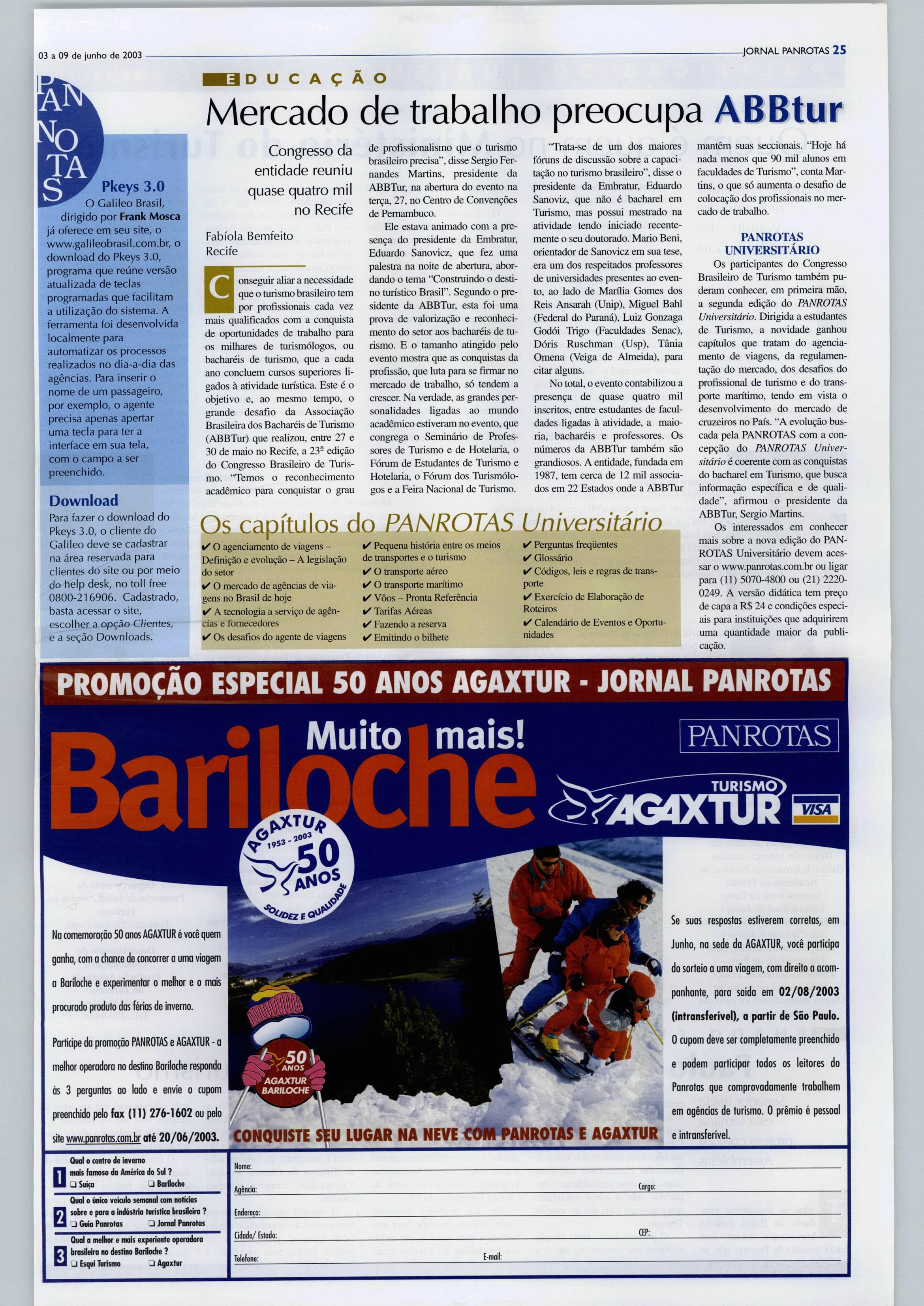 Participe da promoção PANROTAS e AGAXTUR -a melhor operadora no destino Bariloche responda os 3 perguntas ao lodo e envie o cupom preenchido pelo fax (11) 276-1602 ou pelo site www.Danrotas.com.br até20/06/2003.