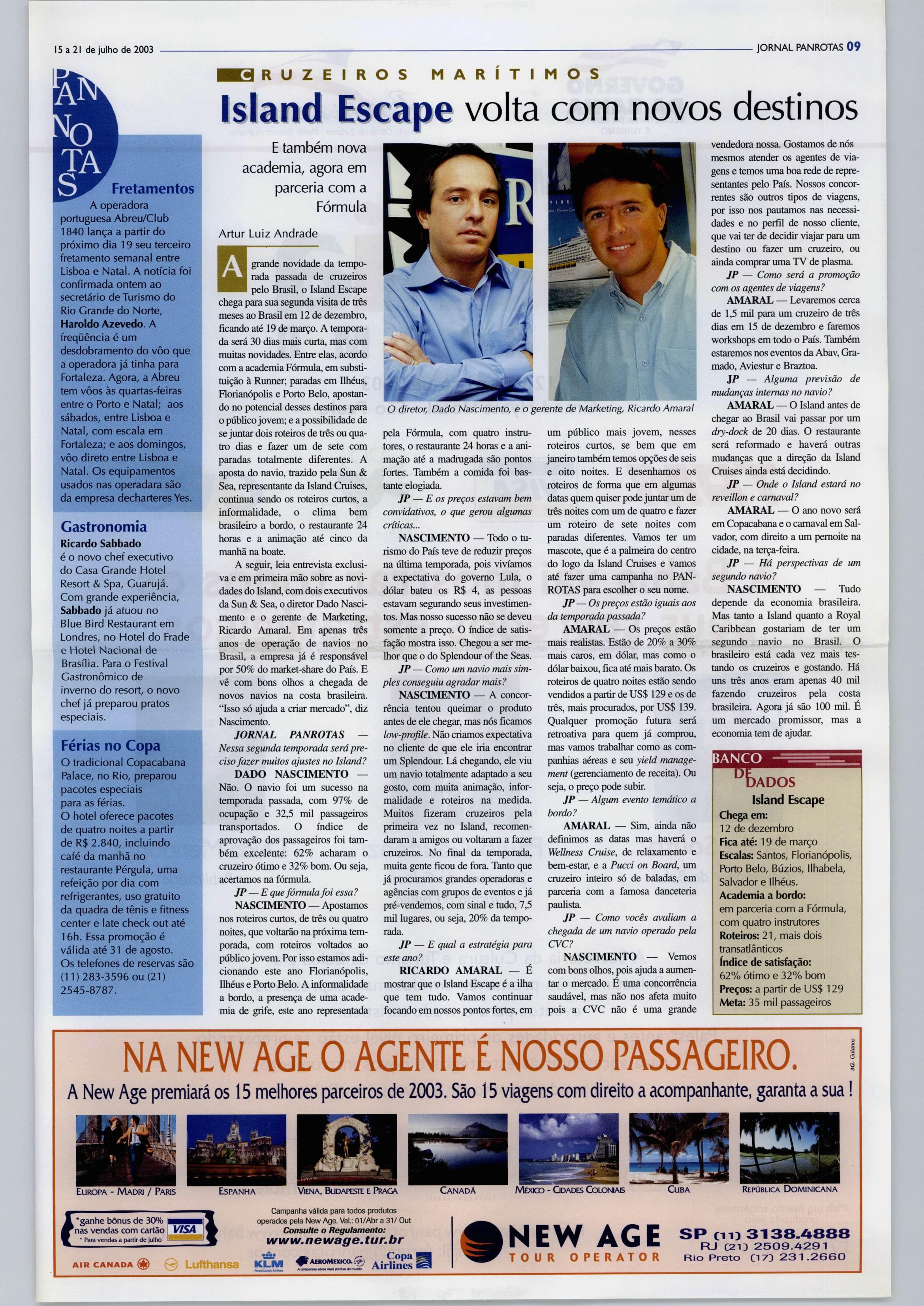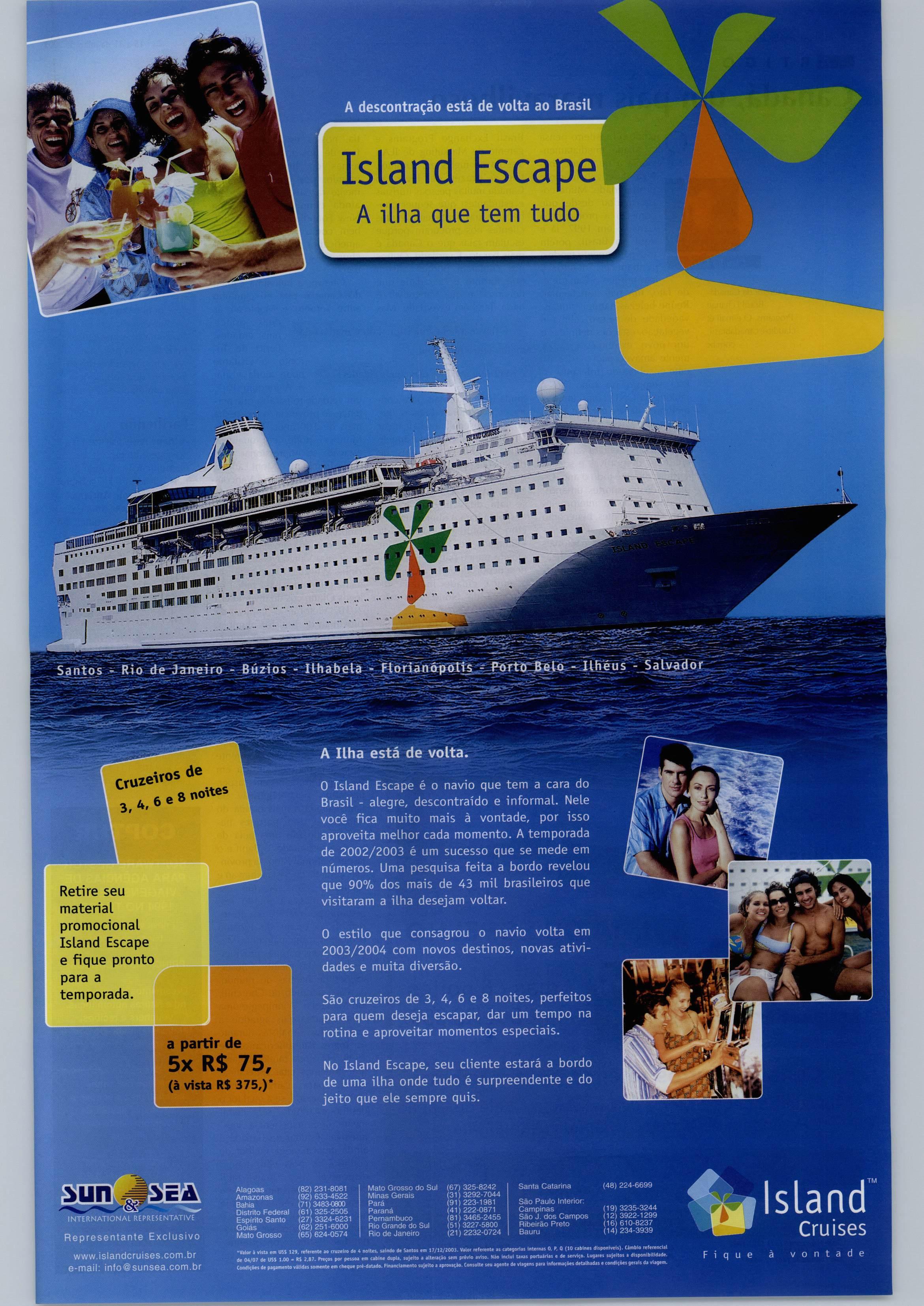 O IsLand Escape éonavioquetemacarado Brasil-alegre,descontraídoeinformal. Nele você fica muito mais à vontade, por isso aproveita melhor cada momento, A temporada de 2002/2003 é um sucessoquesemedeem números. Uma pesquisa feita abordorevelou que 907o dos mais de43 mil brasileiros que visitaram a ilha desejam voltar.