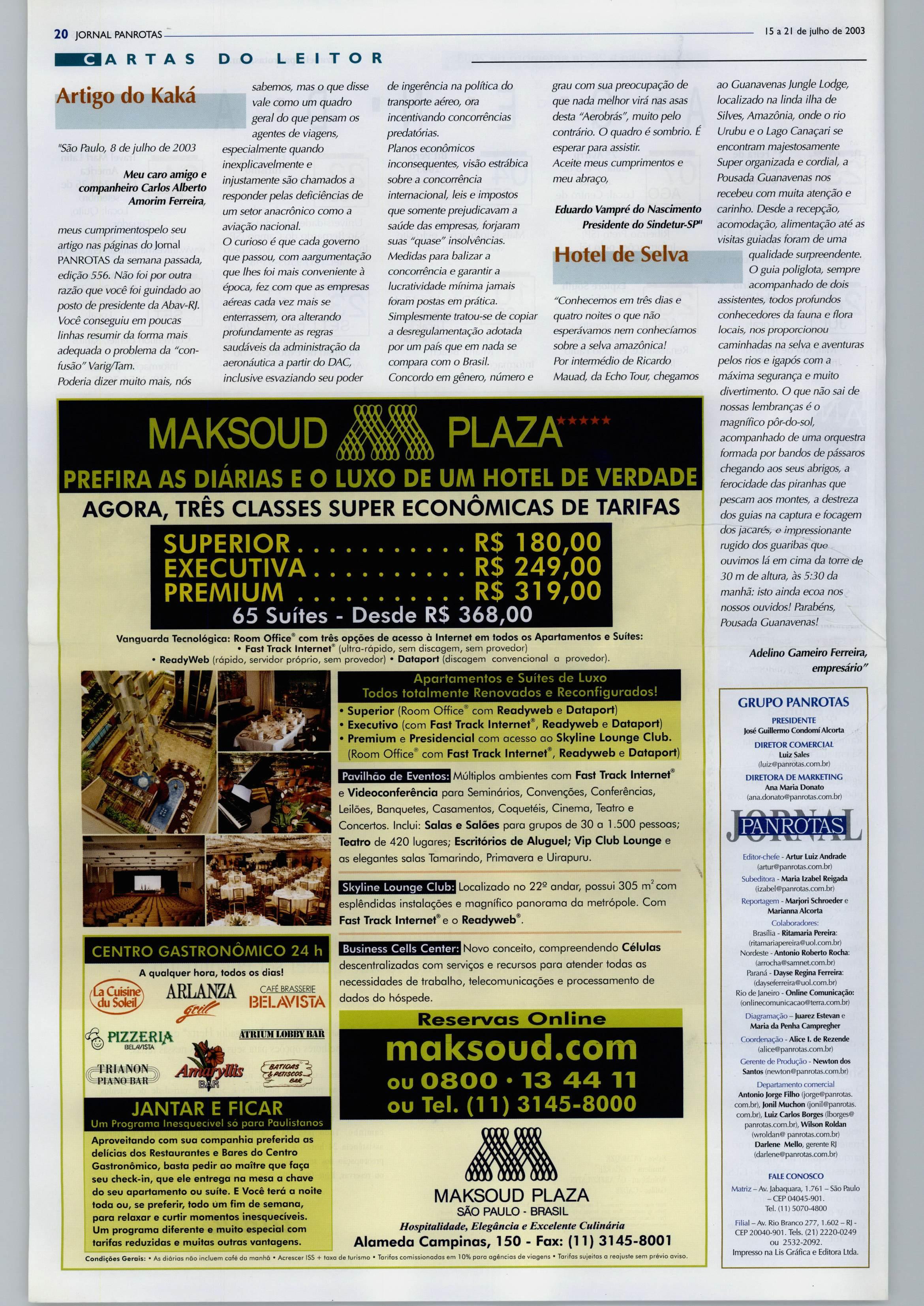 3145-8000 MAKSOUD PLAZA SÃO PAULO -BRASIL Hospitalidade, Elegância e Excelente Culinária Alameda Campinas, 150 -Fax: (11) 3145-8001 15 a 21 dejulhode2003
