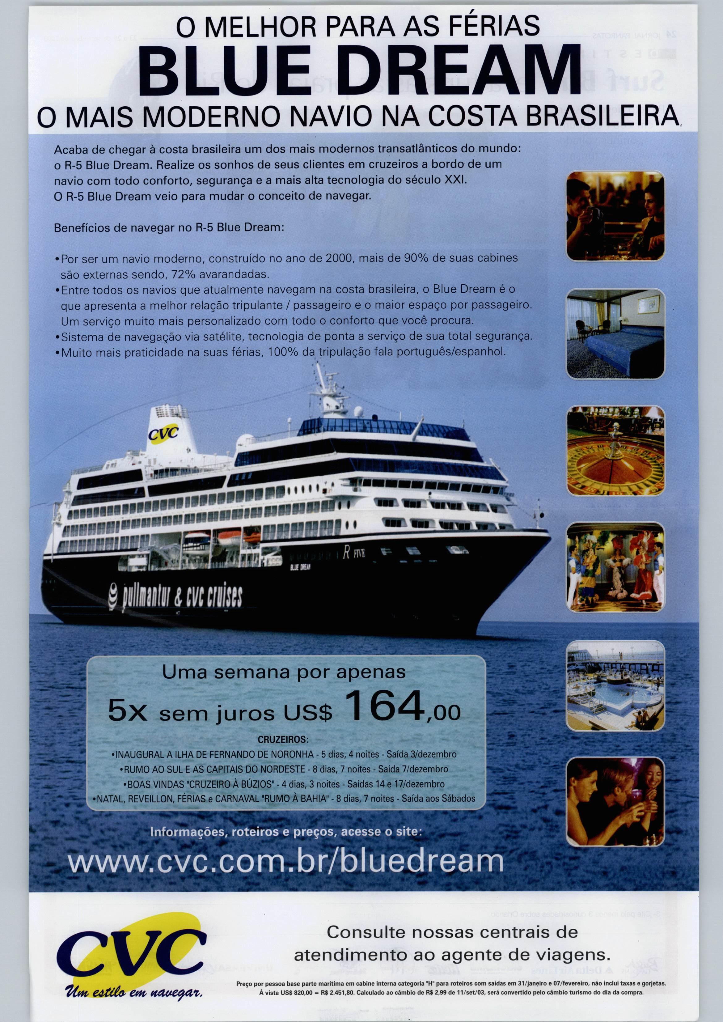 INFINITY ^ AMÉRICA DO SUL. Mnoices- 18/01/04 Fort Lauderdale. Oranjestad. Canal do Panamá. Manta,Uma,Arica.Valparaíso. a partir de3x R$ 2.687* US$ 2.723 , cat. externa 4 t^RNATtONAL RIPRC^ÍNTATIVI, «ictutJvo BratM ínlo9«un8«a.coin.br www.royaleirlbbean.coni.br www.eelcbrIlycruUes.com.&r Tel: (11)3156-5600 Destinos perfeitos para nossos navios. NAVIGATOR OFTHE SEAS CARIBE LESTE > 7 noites 25/10/03 Miami. Nassau. St.Thom3S. San Juan, Labadee, Mtami. apartirde 3x R$ >.829, US$ 1.853.cat interna M Os programas incluem: Passagem aérea" e parcelamento em 3x sem juros. *Pn;wpD<pei*iis<>mcaAinii(K«ii.iidiiiiusuBaot,ivdci!-iiiT'(i'ovMnAo Nionauiuui luítlsid»s«rvi(C. Lugaieseé<K> a rauDimotuwiios oCílnlxi raIsnnaBida tSQSm d* U9S 100 > F<$ 793 snmartts sm ctagM Ftfwflcuimenii 9 acravaçto 'e$»nasecomwnniUiisMcf<icm