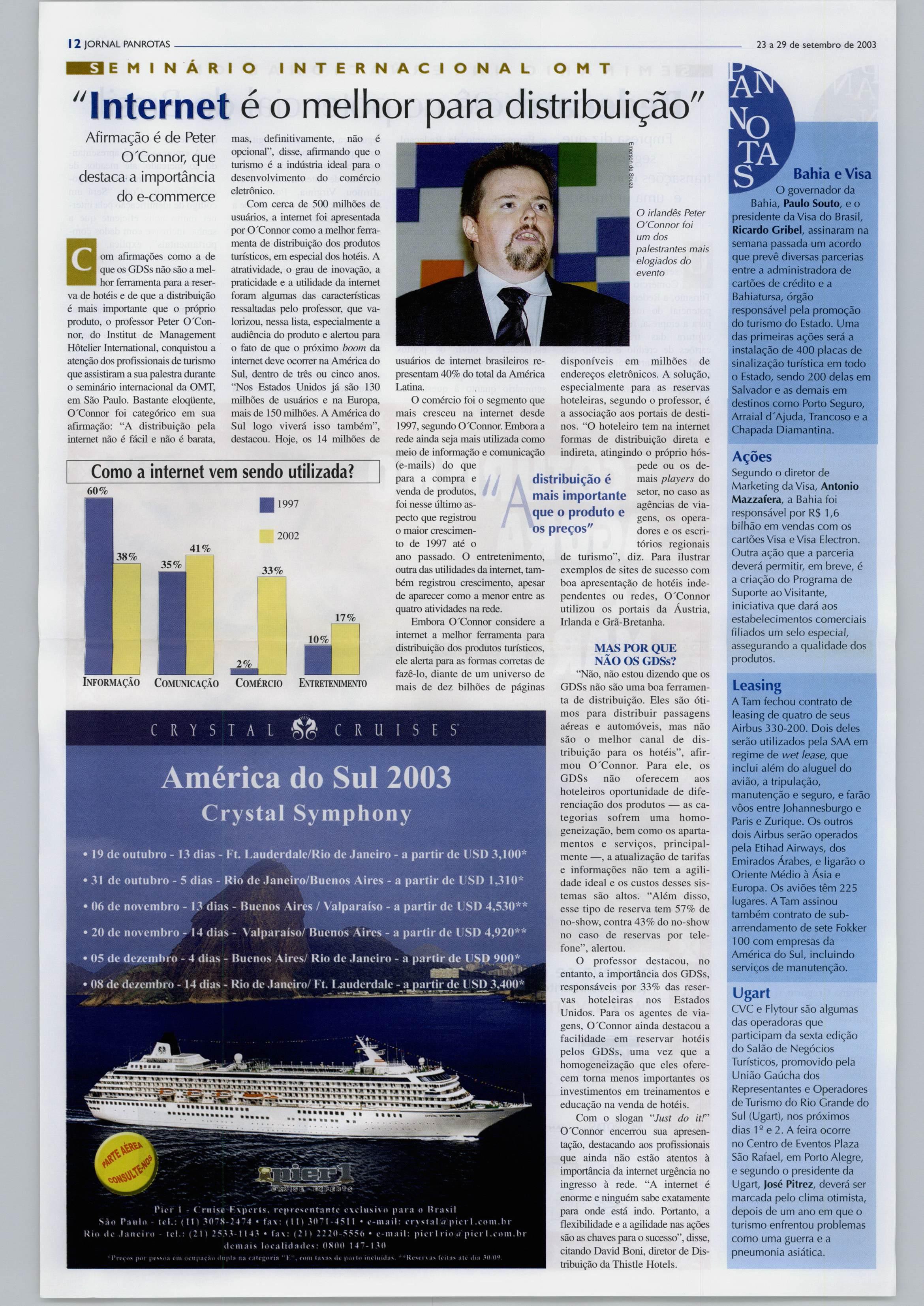 Como usara internet para aumentarasvendas,aforçadoemail e dos GDSs, como o Brasil está aplicandoasnovastecnologias,qual NacioS Hotei Similc® Norton Lenhart, da FNHRBS, e José Antonio Ferreiro, da OMT opapelde fornecedores edis tribuidores,comoa tecnologia transformaosdiversossegmentos denossaindústriasãoperguntasque tentaram ser elucidadas nas