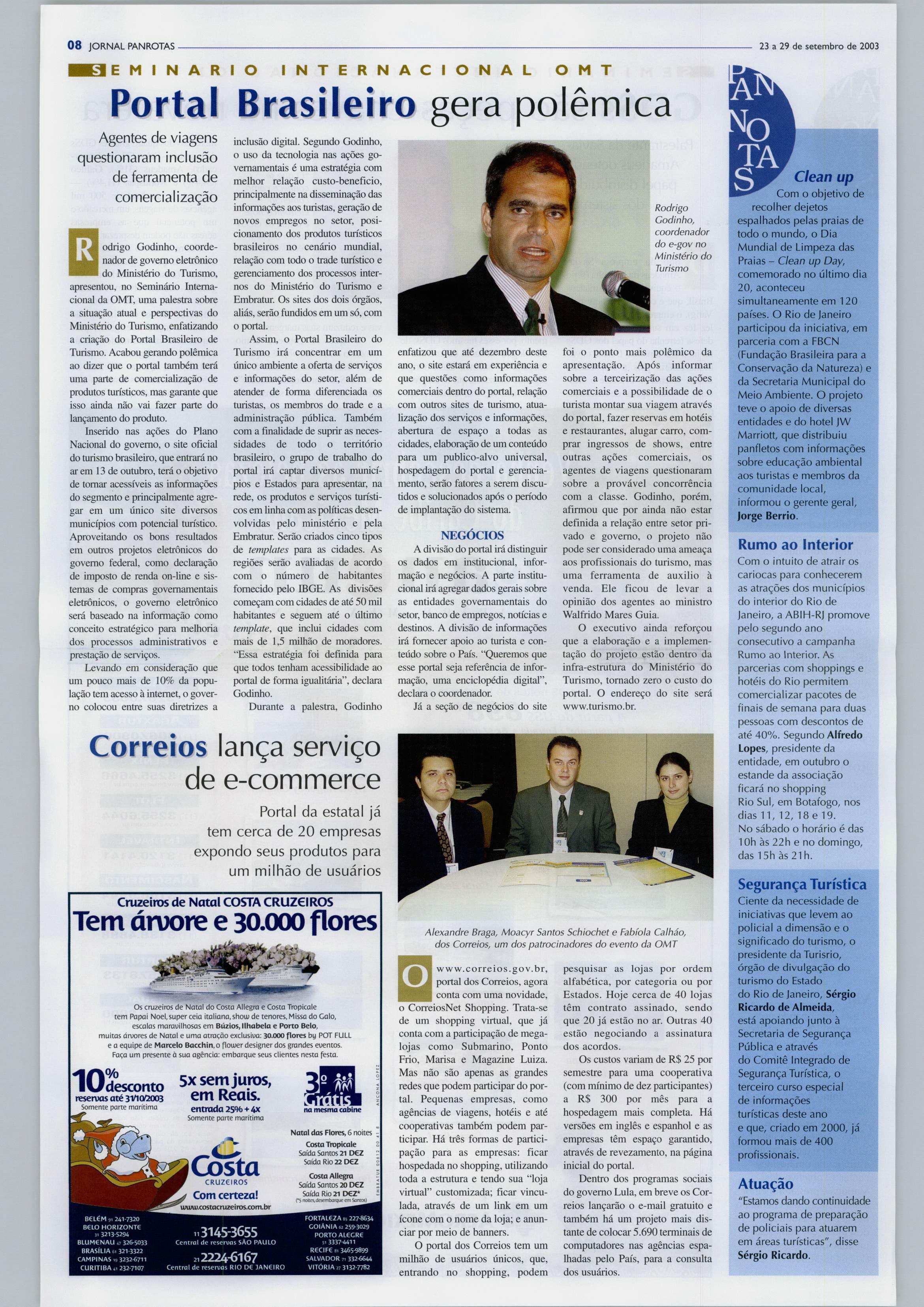Informação, comomuitosefalou durante o evento, e este seminário temporobjetivoproverosprofis sionais com informações impor tantes sobre o comércio eletrôni co.Ele já éuma realidade notu rismo e queremos que os agentes deviagensedemais players dessa indústria estejamintegradosatal realidade e não assustados com ela. A idéia é mostrar como surgiuo e-commerce, quaisas ferramentas que oferece hoje para osetorturísticoequaisosproble masquepodeacarretar.Maseste seminário tem outra função tam bém. Queremos que venham àluz temas importantes equedevem ser considerados tanto pela inicia tivaprivadaquantopelaadminis tração pública.