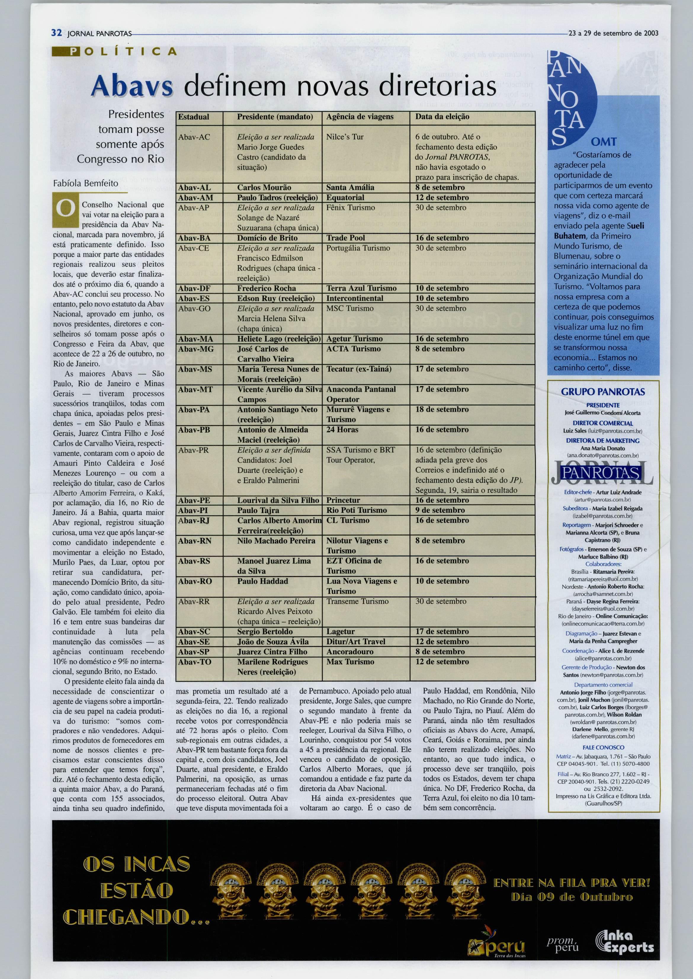 Conselho Nacional que vaivotarnaeleiçãoparaa presidênciadaAbavNa cional,marcadaparanovembro,já está praticamente definido. Isso porqueamaiorpartedasentidades regionais realizou seus pleitos locais,quedeverãoestarfinaliza dosatéopróximodia6,quandoa Abav-AC conclui seu processo. No entanto,pelonovoestatutodaAbav Nacional,aprovadoemjunho,os novospresidentes,diretoresecon selheirossótomamposseapóso CongressoeFeiradaAbav,que acontece de22a 26 de outubro, no Rio de Janeiro.