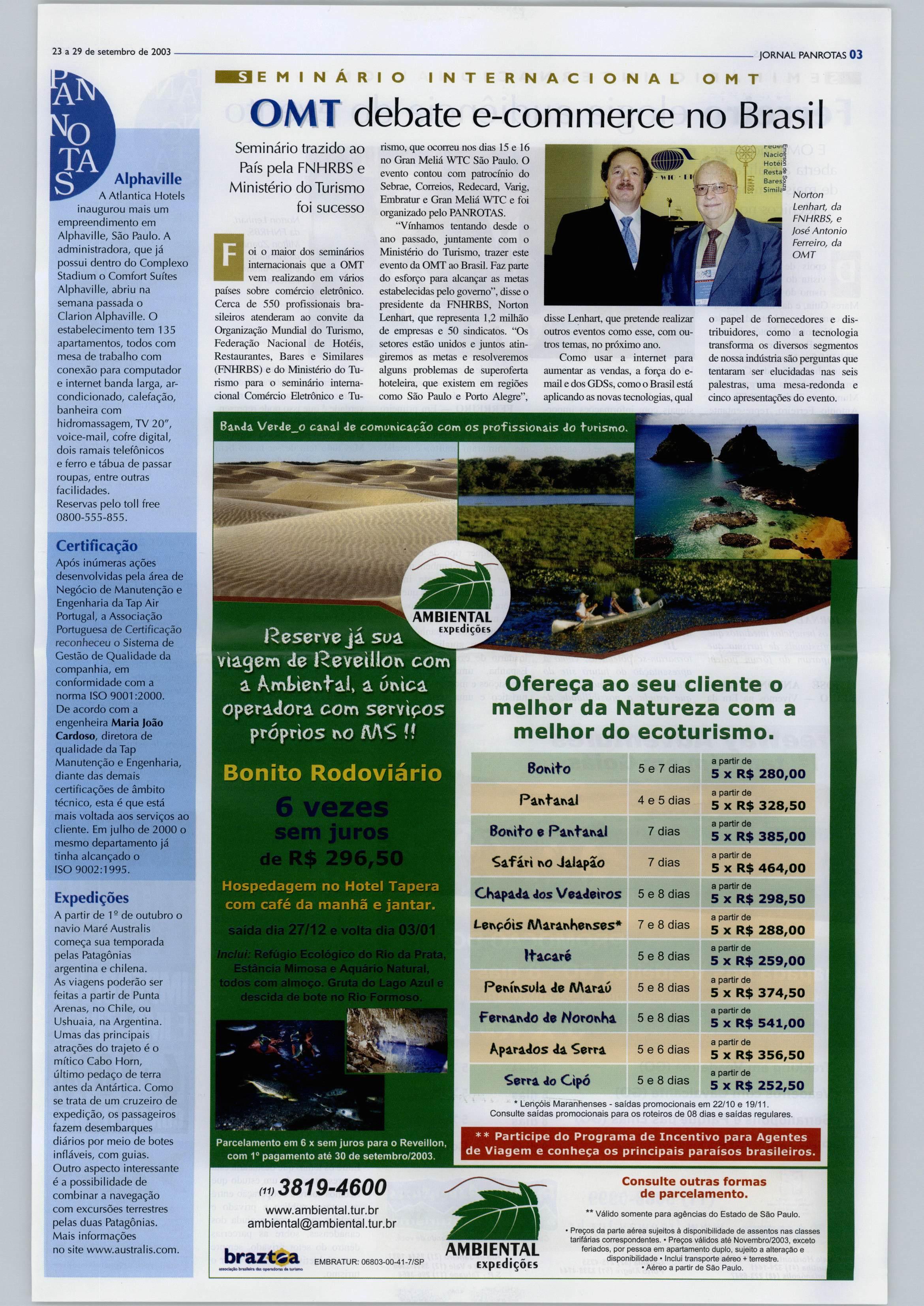 Mares Guia, e das muitas conver sascomo presidente da Fede raçãoNacionaldeHotéis,Restau rantes, Bares e Similares (FNHRBS), Norton Lenhart, o diretor honorário do Conselho Empresarial da Organização Mundial do Turismo (OMT), José Antonio Ferreiro, representante do secretário geraldaOMT,ani mou-se com a idéia de realizar no Brasil um seminário de e-commerce. Deu certo ea OMT apre sentou em São Paulo, na semana passada, oseminário Comércio Eletrônico e Turismo - Guia Prático para Destinos e Empresas. SegundoFerreiro,desde1999a