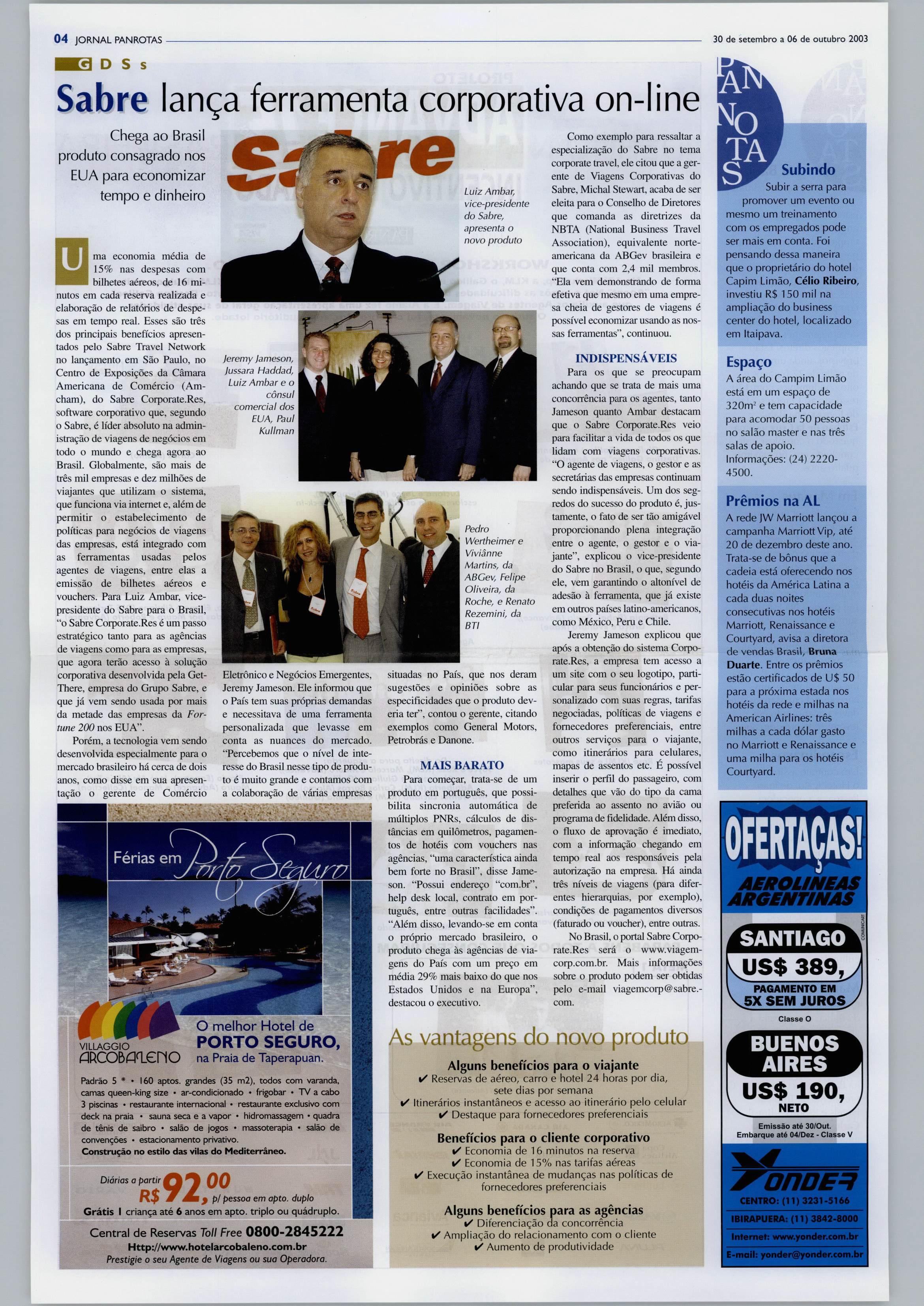 ma economia média de 15% nas despesas com bilhetes aéreos, de 16 mi nutos em cada reserva realizada e elaboração derelatóriosdedespe sasemtemporeal.Essessãotrês dos principais benefíciosapresen tados pelo Sabre Travei Network no lançamento em São Paulo, no Centro de Exposições da Câmara Americana de Comércio (Amcham), do Sabre Corporate.Res, software corporativo que, segundo o Sabre, é líder absoluto na admin istração de viagens de negócios em todo o mundo e chega agora ao Brasil. Globalmente, são mais de trêsmil empresas edezmilhõesde viajantesqueutilizamosistema, quefuncionavia intemet e,alémde permitir o estabelecimento de pob'ticas paranegóciosdeviagens das empresas, está integrado com as ferramentas usadas pelos agentesdeviagens,entreelasa emissão de bilhetes aéreos e vouchers. Para Luiz Âmbar, vicepresidentedoSabreparaoBrasil, "o Sabre Corporate.Res éum passo estratégico tanto para as agências de viagens como para as empresas, que agora terão acesso à solução corporativa desenvolvida pelaGetThere, empresa do Grupo Sabre, e que já vem sendo usada por mais da metade das empresas da Fortune 200 nos EUA".