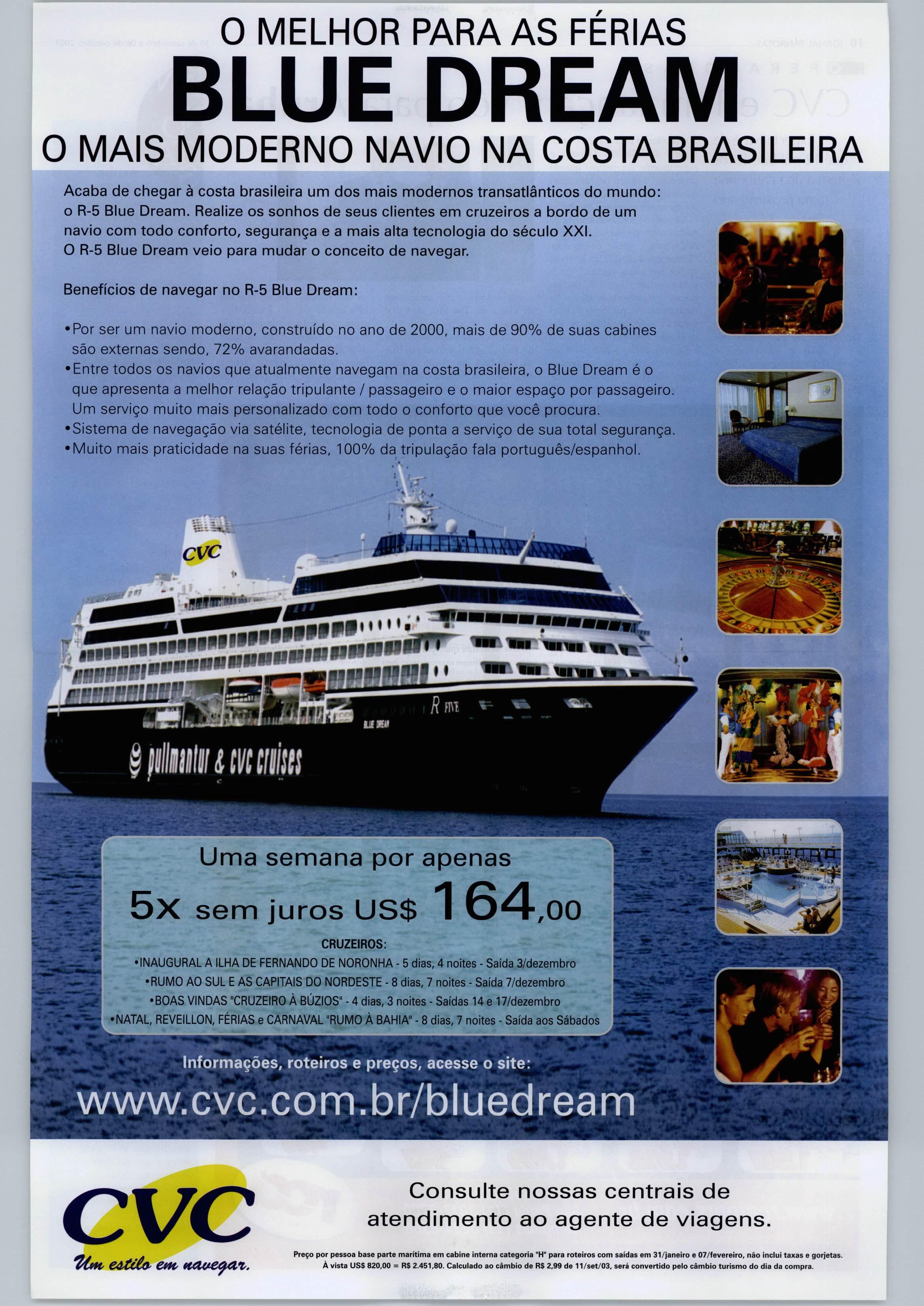 questiona modelo de Bonito Página06 Portal Brasileiro é adiado para odia 20/10 Página 14 e />reci'sa l Cspaddsda' i 750hâsp«(lM Ttlpulaçia: USoesoas Dedi«:10 Cabliw<:746 Rt5Uur>nl«:3 T»rwlag6in:40 132 Capaddad«: 1.422 Ittspedn Tilpdafáo: MOpesso» Dficfcs: 8 Calilms:S10 RastauraMn: 3 Tonelagani:3S 144 C^paadada: 624 nóspeded Tripdaçâo: 373pes5oa! D(Ck>: tl CaUt>es:34â Reftauranitt T^nelagem 30 200 ?Ui!i33RIbC citfsei 088:Piefoi|»(p«»ao«icabne<Mila Ntenelucm laxís portiuriascde miviço. Financiamenío suinlo a aprovação ranfassuteiasaalefaçàotsemríévioaviso C.nmRto(flfcroncial de 22rti9 aRS2.93 Consulte seu agentedeviagens. Xsknet iscApt 4 noites Santos,Ilhabela, Búzios, Santos emcategoriainterna deck Qcom 5refeições diárias. Saída26de Janeiro.ApartirR$557ou 5x us$ 38 '.^suK^nos sobie traslados SP I Santos / SP. :jí5 C.as4'cl 'í?Af>ícal€ 3 noites Santos, PortoBelo,Ilhabela, Santosemcategoriaintemadeck 1com5 refeições diárias. Saída 6de Março. A partir de R$ 850 5x uss 58 Blvt lírtAU/y 3 noites Santos. Búzios, Santos em categoria intemadecks 4,6,7 ou 8com5 refeições diárias. Saída 18de Fevereiro.A partirdeR$996 ou 5x us$ 68 Sio Paulo: (11) 3156*9900 santo. (13) 3228-9900 mm MHIIM Smmelhorcompanhia