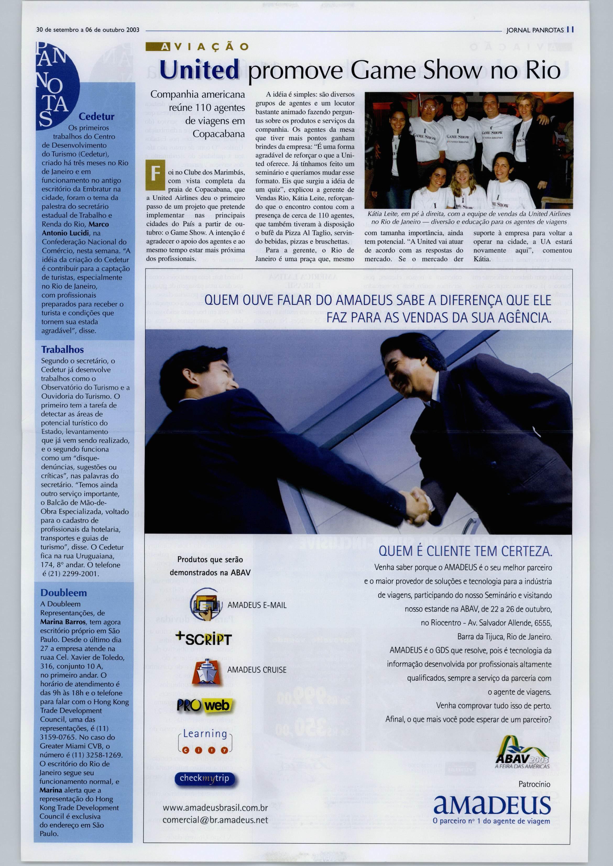 ddg: 0800-21-8462 PANROTAS TRAVEL ACE INTCONATIONAL IMAS Group www.paiirotas.com.br Ano XI - n" 568 30 de setembro a 06 de outubro de 2003 R$ 3,50