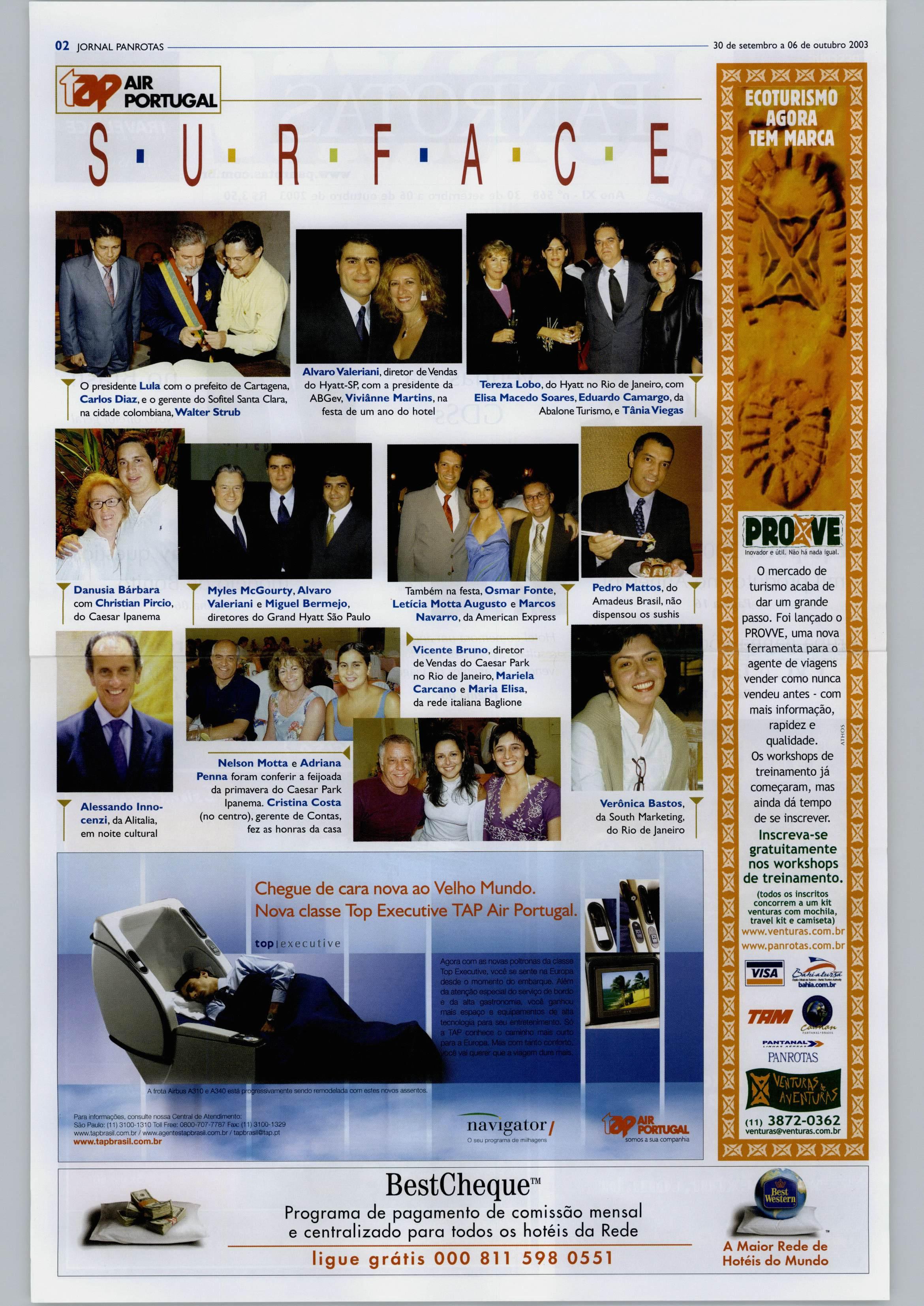 Chegue decaranovaao Velho Mundo. NovaclasseTopExecutiva TAP Air Portugal. •toplexecut» ve Afrotn Pâralnfonriações, consulte nossa Centra)de Atendimento: SàbPaJo; (11)3100-13l0Toll Free: 0800-707-7787Fax;{11)3100-1329 www.tapbraal.com.br / www,açientestapbrasil.com.br / taobrasi!@tEí>.p! www.tapbrasii.com.br sendo remodelaija com estes novos assentos ^©(©cutive moTWtto e^seçial cip gasirQOónM navigator/ o seu programa tíe milhagens Pedro Mattos, do Amadeus Brasil, não dispensouossushis Verônica Bastos, da South Marketing, doRiode Janeiro suaoirrpsiha BestCheque™ Programa de pagamento de comissão mensa ecentralizado para todos os hotéis da Rede ligue grátis 000 811 598 0551 30 de setembro a 06 de outubro 2003 r Inovador e util. Não hâ nadd icual. o mercado de turismo acaba de dar um grande passo.Foilançadoo PROWE, uma nova ferramenta para o agente deviagens vender como nunca vendeu antes - com mais informação, rapideze ^ qualidade. 1 Os workshops de treinamento já começaram, mas (todos os inscritos concorrem a um kit venturas com mochila, travei kit e camiseta) v/w. venturas.com.br www.panrotas.com.br V/SA (11) 3872-0362 venturas®venturas.com.br m m m A Maior Rede de Hoféis do Mundo