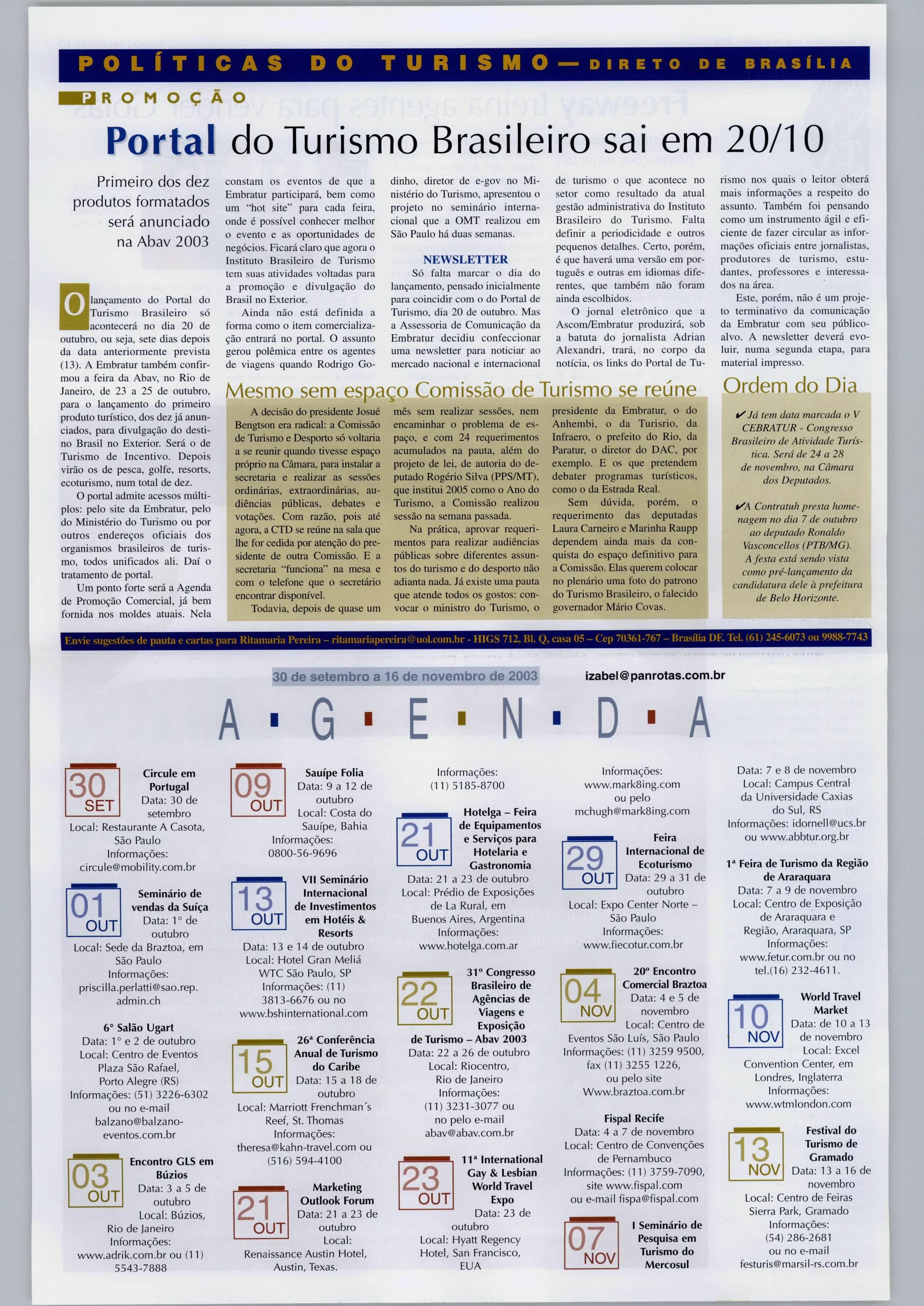 Envie sugestões de pauta e cartas para Ritamaria Pereira - ritamariapereira@uol.com.br - HIGS 712, BI. Q, casa 05 - Cep 70361-767 - Brasília DF. Tel. (61) 245-6073 ou 9988-7743 30 SET 30 de setembro a 16 de novembro de 2003 izabel@panrotas.com.br A•G - I N•D•A Circule em Portugal Data: 30 de setembro Local: Restaurante A Casota, São Paulo Informações: circule@mobility.com.br 0^ Seminário de vendas da Suíça f-v j-r Data: 1° de outubro Local: Sede da Braztoa, em São Paulo Informações: prisciila.perlatti@sao.rep. admin.ch 6°SalãoUgart Data: 1 ° e2 de outubro Local: Centro de Eventos Plaza São Rafael, PortoAlegre (RS) Informações: (51) 3226-6302 ou no e-mail balzano@balzanoeventos.com.br ^ Encontro GLS em ÍJ Búzios Data: 3a5 de ' I outubro Local: Búzios, Rio de Janeiro Informações: www.adrik.com.br ou (11) 5543-7888 OUT OUT Sauípe Folia Data: 9a