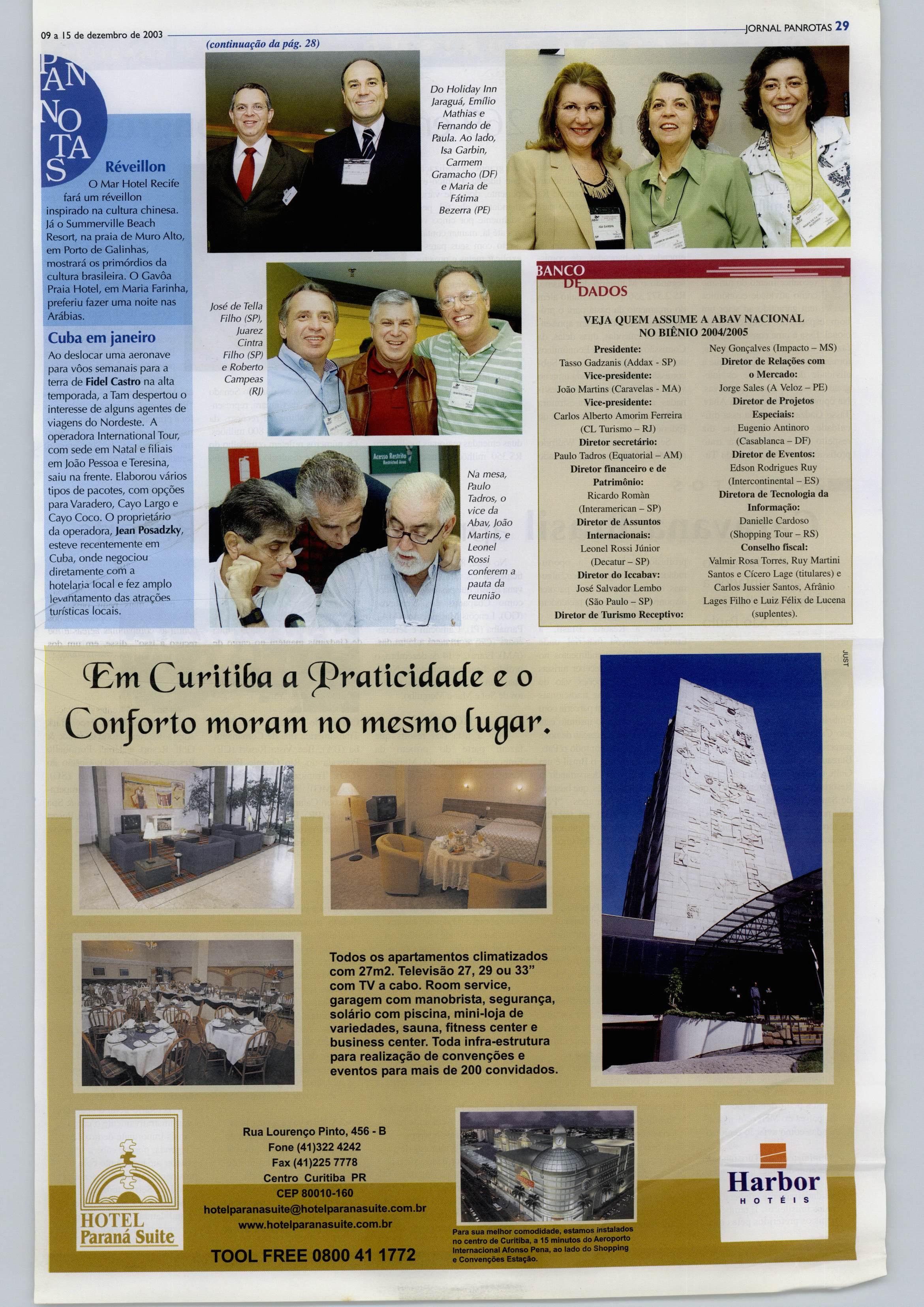 DoHoliday/nn Jaraguá, Emílio Mathias e Fernando de F^ula. Ao lado, Isa Garbin, Carmem Cramacho (DF) e Maria de Fátima Bezerra (PE) Na mesa, Paulo Tadros,o vice da Abav, João Martins, e Leonel Rossi conferem a pautada reunião ANCO ^"dados VEJA QUEM ASSUME NO BIÊNIO Presidente: Tasso Gadzanis (Addax - SP) Vice-presidente: João Martins (Caravelas - MA) Vice-presidente: Carlos Alberto Amorim Ferreira (CL Turismo -RJ) Diretor secretário: PauloTadros(Equatorial-AM) Diretor financeiro e de Patrimônio: Ricardo Romàn (Interamerican -SP) Diretor de Assuntos Internacionais: Leonel Rossi Júiüor (Decatur -SP) Diretor do Iccabay: José Salvador Lembo (SãoPaulo-SP) Diretor de Ibrismo Receptivo: Curitiba a ^raüciáadc co Conforto moram no mesmo fugar» HOTEL Paraná Suite Todos os apartamentos climatizados com 27m2. Televisão 27, 29 ou 33" com TV a cabo. Room service, garagem com manobrista, segurança, solário com piscina, miní-loja de variedades, sauna, fitness center e business center. Toda infra-estrutura para realização de convenções e eventos para mais de 200 convidados. Rua Lourenço Pinto, 456 -B Fone (41)322 4242 Fax (41)225 7778 Centro Curitiba PR CEP 80010-160 hotelparanasuite@hotelparanasuite.com.br www.hoteiparanasuite.com.br OOLFREE 0800 41 1772 Para sua melhor comodidade, estamos instalados nocentrodeCuritiba,a 15 minutosdoAeroporto Internacional AfonsoPena,aoladodo Shopping e Convenções Estação. -JORNAL PANROTAS 29 A ABAV NACIONAL 2004/2005 NeyGonçalves(Impacto-MS) Diretor de Relaçõ^ com o Mercado: JorgeSales(AVeloz-PE) Diretor de Projetos Especiais: Eugênio Antinoro (Casablanca - DF) Diretor de Eventos: EdsonRodriguesRuy (Intercontinental - ES) Diretora de Tecnologia da Informação: Danielle Cardoso (Shopping Tour-RS) Conselho fiscal: Valmir Rosa Torres, Ruy Martini Santos e Cícero Lage (titulares) e Carlos Jussier Santos, Afrânio Lages FiUio eLuiz Félix deLucena (suplentes). Harbor HOTÉIS