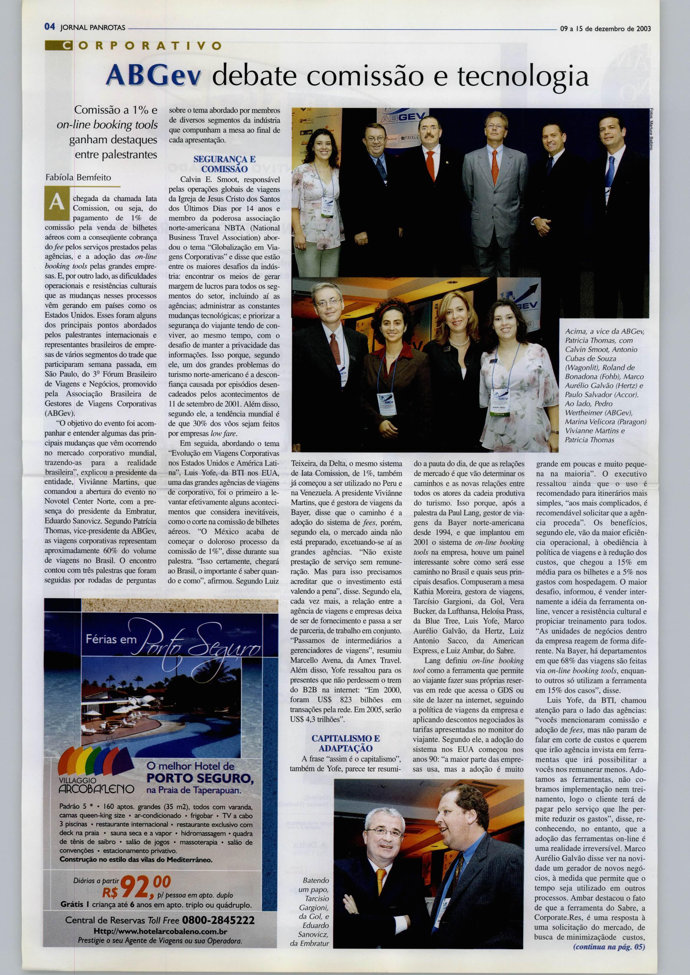 Bchegada da chamada lata Comission, ou seja, do pagamento de1%de comissão pela venda de bilhetes aéreoscoma conseqüente cobrança do fee pelosserviços prestados pelas agências,eaadoçãodason-line bookingtoolspelasgrandesempre sas. E, poroutrolado,asdificuldades operacionaiseresistênciasculturais queasmudançasnessesprocessos vêmgerandoempaísescomoos EstadosUnidos.Essesforamalguns dos principais pontos abordados pelos palestrantes internacionais e representantes brasileirosde empre sasdeváriossegmentosdotradeque participaramsemanapassada,em São Paulo, do 3- Fórum Brasileiro deViagenseNegócios,promovido pela Associação Brasileira de GestoresdeViagensCorporativas (ABGev).
