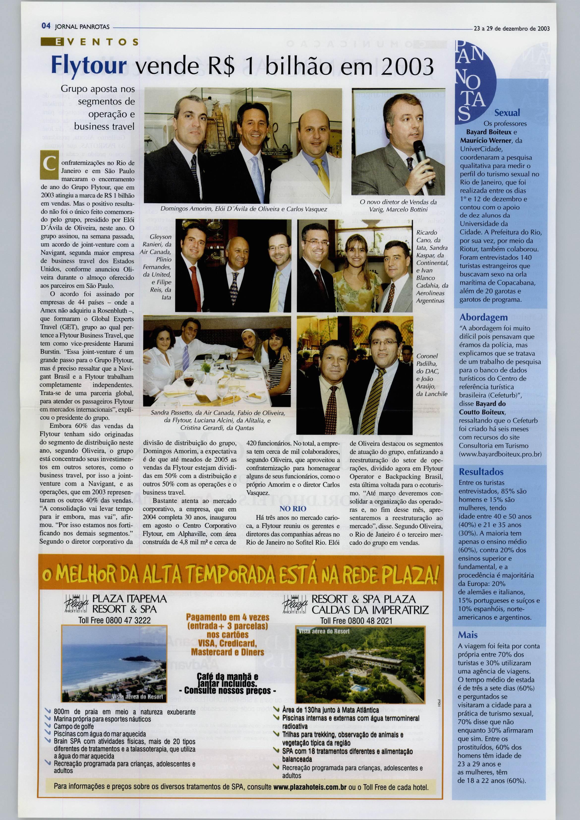 Grupo aposta nos segmentos de operação e business travei onfrateraizações noRiode Janeiro e em São Paulo marcaram o encerramento deanodoGrupoFlytour,queem 2003atingiua marca deR$1 bilhão emvendas.Masopositivoresulta do não foio único feito comemora dopelogrupo,presididopor Elói D'Ávilade Oliveira, neste ano. O grupoassinou,nasemanapassada, umacordode joint-venture coma Navigant,segundamaiorempresa de business travei dos Estados Unidos, conforme anunciou Oli veiraduranteoalmoçooferecido aosparceirosemSãoPaulo.