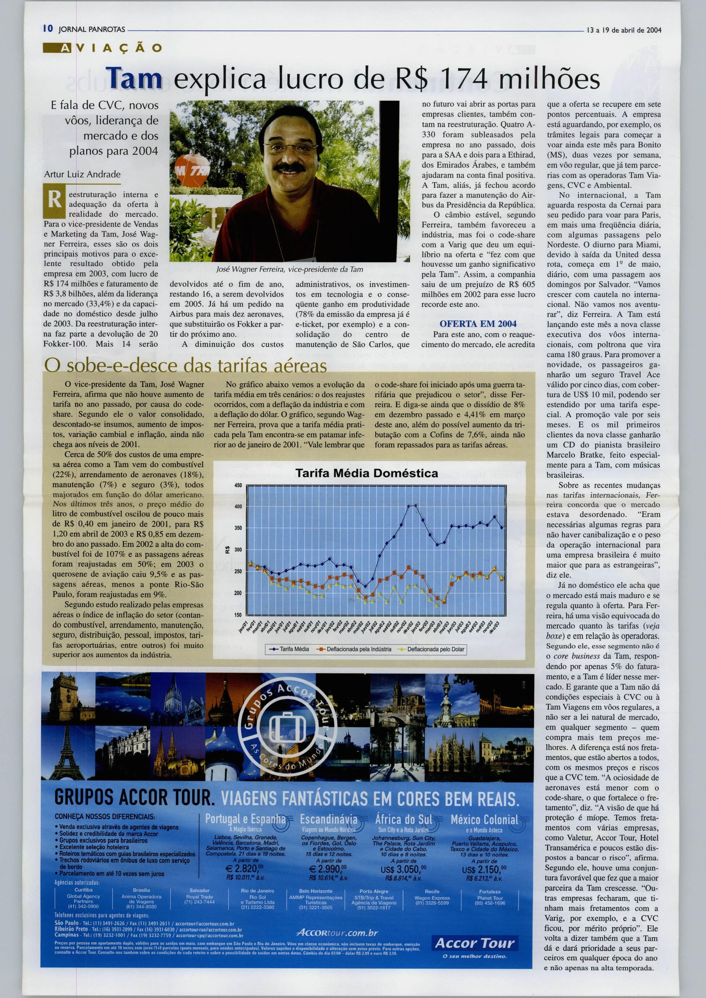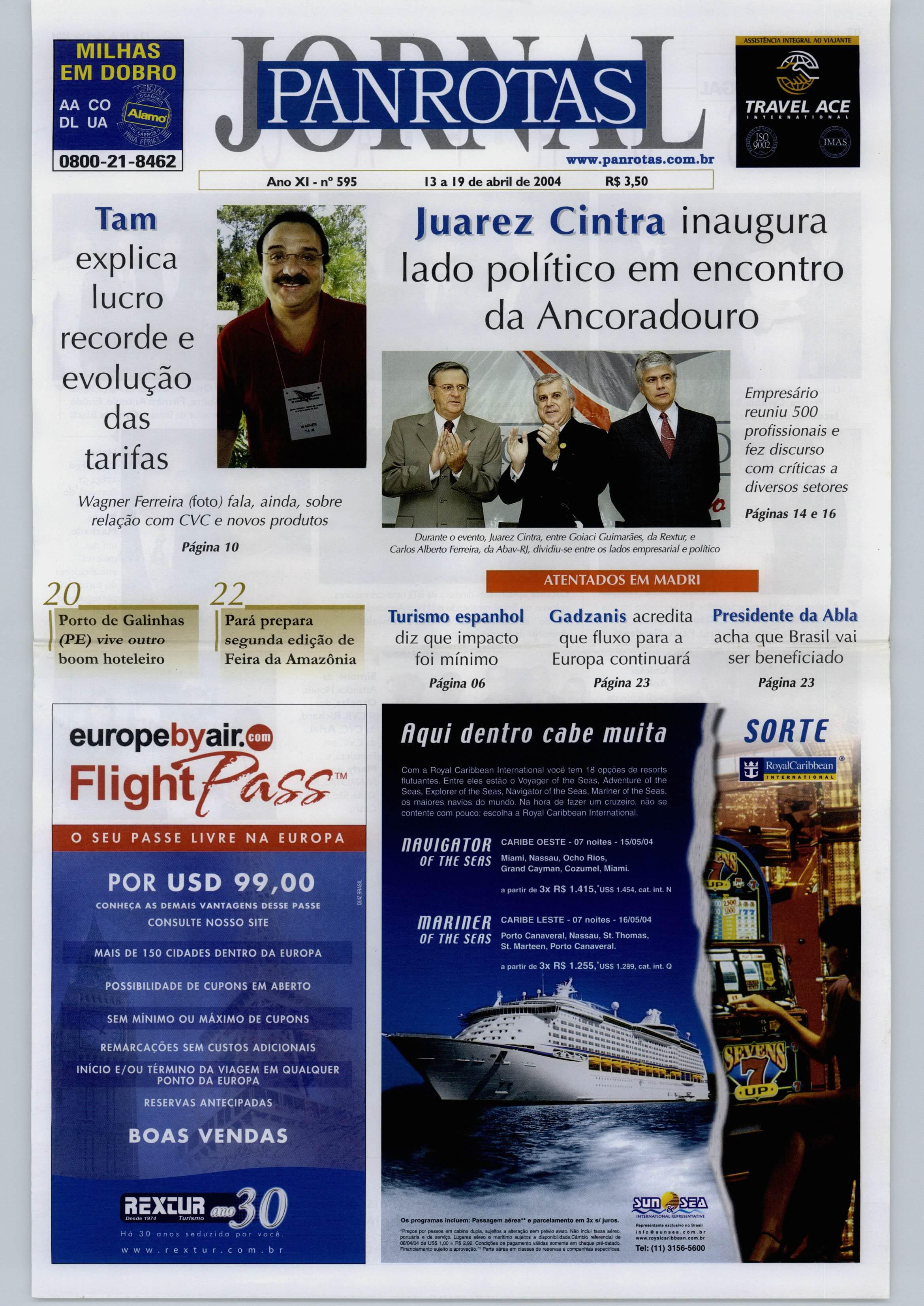 TÁ ASSISTtNC)VlNn;dH/<í. ÃÒ VIXKnII MILHAS EM DOBRO AA CO DL UA PANROTAS TRAVELACE 0800-21 -8462 Ano XI - n"" 595 Tam explica lucro recorde e evolução das tarifas WagnerFerreira ffotoj fala, ainda, sobre relação com CVCenovos produtos 20 Página 10 Porto de Galinhas (PJS) vive outro boom hoteleiro 22 Pará prepara segunda edição de Feira da Amazônia europebyair.®! mglí^gS: TM O SEU PASSE LIVRE NA EUROPA POR USD 99,00 CONHEÇA AS DEMAIS VANTAGENS DESSE PASSE CONSULTE NOSSO SITE MAiS DE 150 CIDADES DENTRO DA EUROPA POSSIBILIDADE DE CUPONS EM ABERTO SEM MÍNIMO OU MÁXIMO DE CUPONS REMARCAÇÕES SEM CUSTOS ADICIONAIS INÍCIOE/OU TÉRMINO DA VIAGEM EM QUALQUER PONTO DA EUROPA RESERVAS ANTECIPADAS BOAS VENDAS OasdB 1974 Turismc Há 30 anos seduzida por você www.paxirotas.com.br 13a 19 de abril de 2004 R$ 3,50 Juarez Cintra inaugura ado político em encontro da Ancoradouro Empresário reuniu 500 profissionaise fez discurso com críticas a diversos setores Páginas14e16 Durante oevento, juarez Cintra, entre Goiad Guimarães, daRextur,e CarlosAlberto Ferreira, da Abav-RJ, dividiu-seentreosladosempresarialepolítico