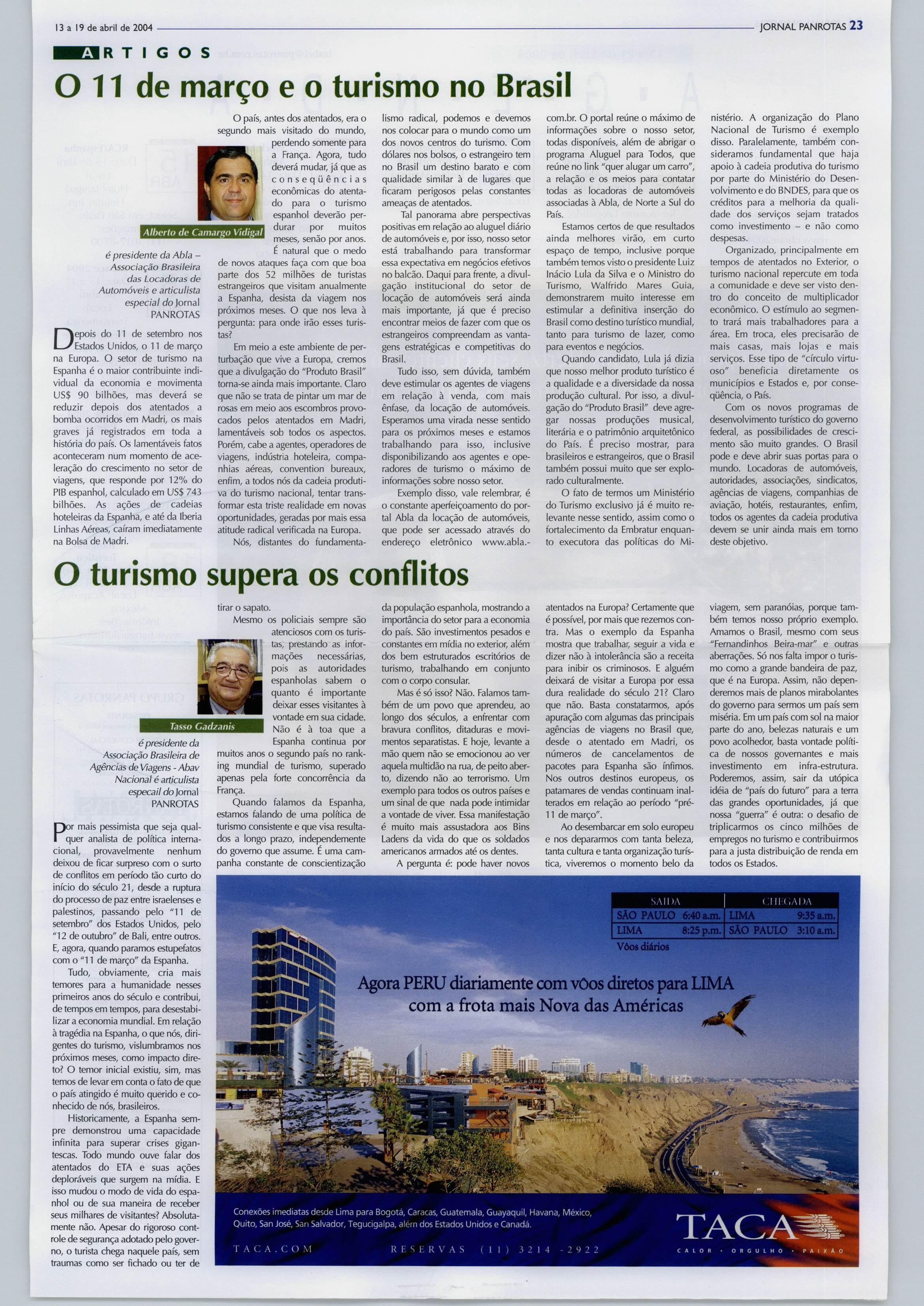 E, agora, quando paramos estupefatos como "11 de março" da Espanha. Tudo, obviamente, criamais temoresparaahumanidadenesses primeiros anosdoséculoe contribui, de tempos em tempos, para desestabilizar aeconomiamundial. Em relação à tragédia na Espanha, oque nós, diri gentesdo turismo, vislumbramos nos próximos meses, como impacto dire to?O temor inicialexistiu,sim,mas temosde levar emcontaofatodeque opaís atingido é muito querido eco nhecido denós,brasileiros.