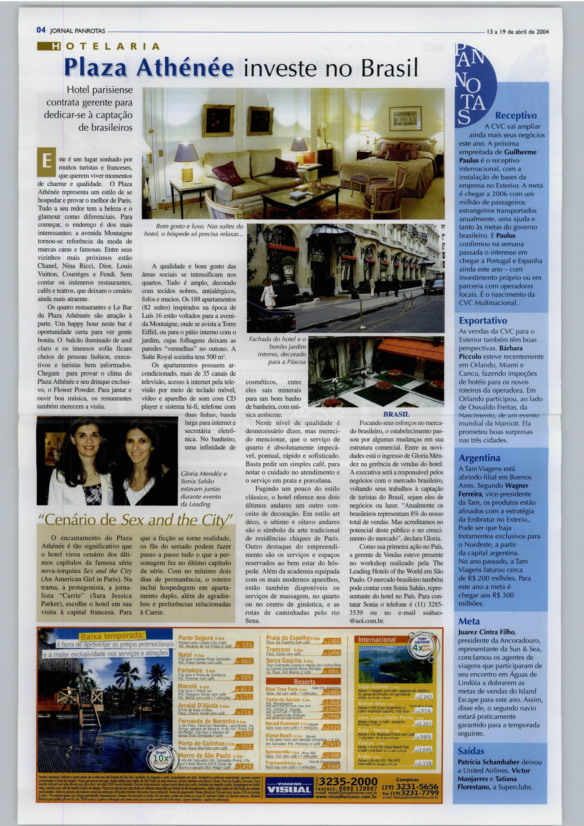 Focando seus esforços no merca dobrasileiro,oestabelecimentopas souporalgumasmudançasemsua estrutura comercial. Entre as novi dadesestáoingressodeGloriaMéndeznagerênciadevendasdohotel. A executiva seráa responsável pelos negócioscomo mercado brasileiro, voltandoseustrabalhosàcaptação deturistasdoBrasil,sejamelesde negóciosoulazer. "Atuahnente os brasileirosrepresentam8%donosso total de vendas. Mas acreditamos no potencialdestepúblicoenocresci mento do mercado", declara Gloria. ComosuaprimeiraaçãonoPaís, agerentedeVendasesteve presente no workshop realizado pela The Leading Hotéis ofthe World emSão Paulo. O mercado brasileiro também podecontarcom Sônia Sahão,repre sentante do hotel no País. Para con tatar Sônia o telefone é (11) 32853539 ou no e-mail ssahao@uol.com.br.