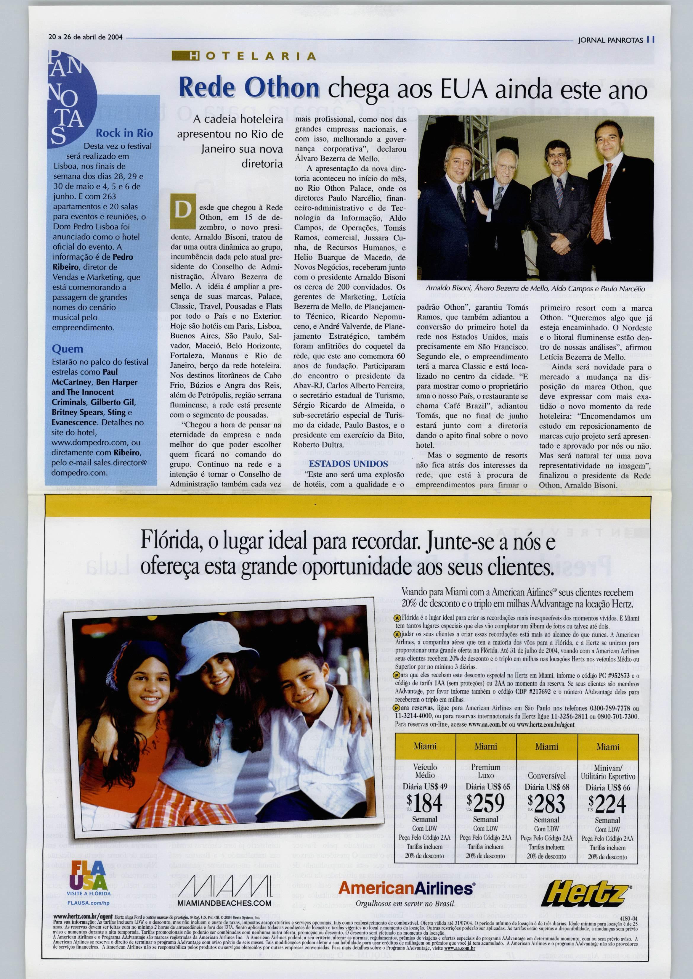 GRUPO PANROTAS PRESIDENTE |osé CuillermoCondomtAlcorta DIRETOR COMERCIAL Luiz Sales (luiz®panrolas.com.br) DIRETORA DE MARKniNG Ana Maria Donato (ana.donato@panrotas.com.br) "m. T A -w PANROTAS Editor<hefe - Artur Luiz Andrade (artur@panrotas.com.br) Subeditora -MariaIzabel Reigada (izabel@panrotas.com.br) Reportagem -Marjori Sdiroeder e Marianna Alcorta (SP),e Bruna Capistrano (RJ) Fotógrafos -EmersondeSouza(SP)e Maríuce Balbino (RJ) Colaboradores: Brasília-Marcos Agê (marcosage®superig.com.bf) Nordeste - Antonio Roberto Rocha; (arrocha@samnet.com.br) l^rartá - Dayse Regina Ferreira: (daysefefTeira@uol.com.br) Diagrsmação - juarez Estevane MariadaPenhaCampregher Coordenação -AliceI.deRezende (alice@panrotas.com-br} Cwente deProdução- Newton dos Santos (newton@panrotas.com.br) Departamentocomercial Antonio )or^ Filho (jorge@panrota5. com.br), jonil Muchon (jonil@panrotas. com.br), Luiz CarlosBorges(Iborges® panrotas.com.br), RicardoSidaras (rsidaras® panrotas.com.br), Tania Fortini Lopes (tania® panrotas.com.br) Darime Mdb, gerenteR| (darlene@panrotas.can.br) FALE CONOSCO Matriz-Av. Jattaqiiara, 1.761— Sãof^uloCEP 04045-901. Tel.(ll) 5070-4800 Filial-Av.Rio Branco 277,1.602RJ-CEP20040-901. Tels.(21)222CW)249ou 2532-2092. Impresso na Lis Gráfica e Editora Ltda. (Guarulhos/SP)