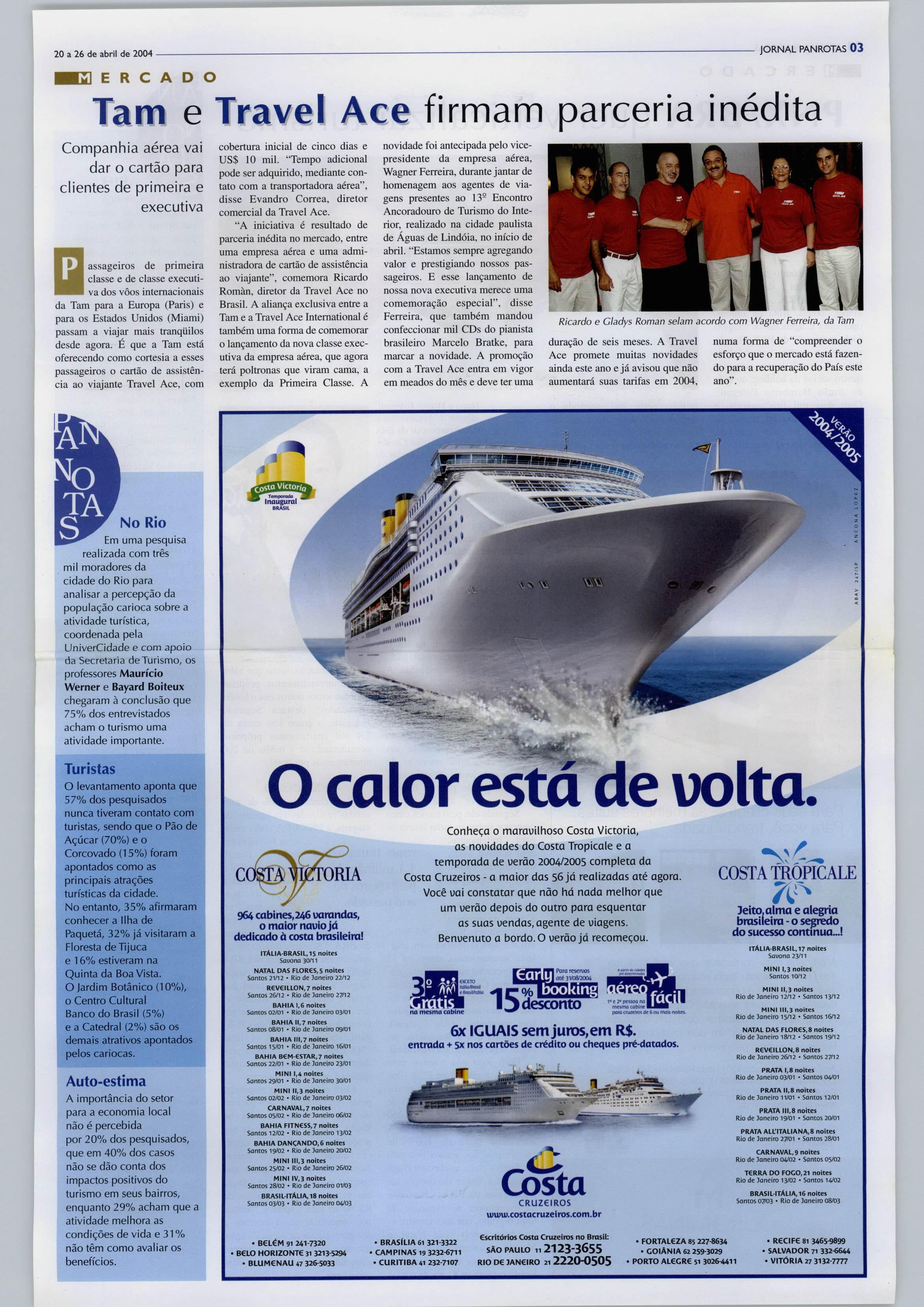 ÁFRICA doSUL RESERVE HOJE MESMO T k PANROTAS TRAVEL ACE (NritHATIONAi 0800-21-8462 www.panrotas.com.br 03 travei Ace fecha parceria com Tam Ano XI - n** 596 20 a 26 de abril de 2004 R$ 3,50 esquisa revela