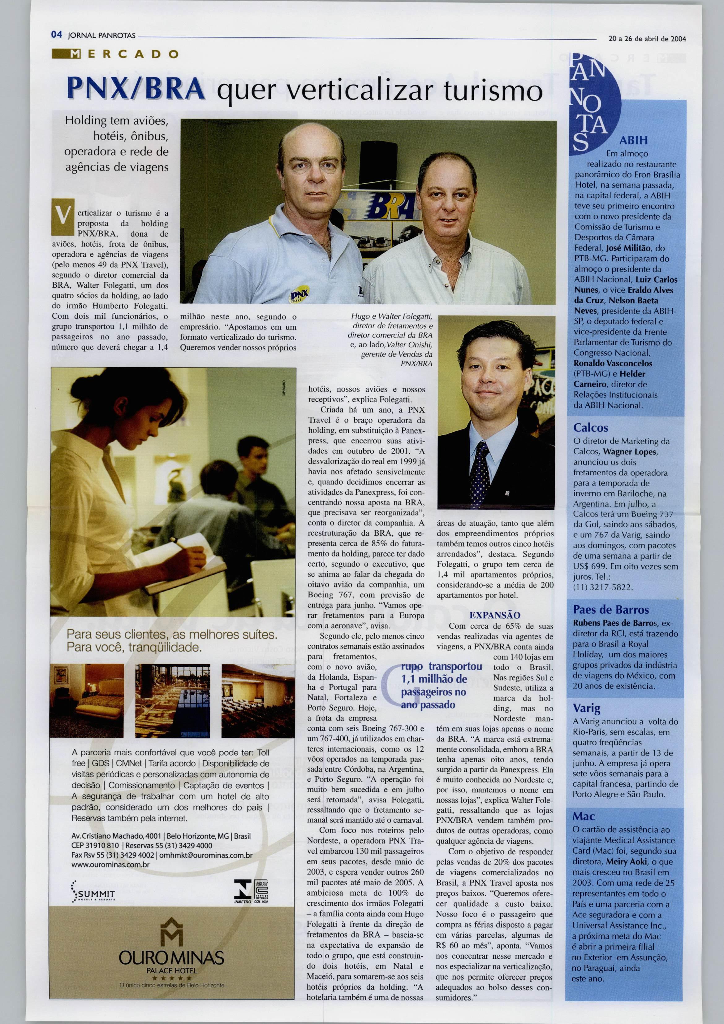 erticalizar o turismo éa proposta da holding PNX/BRA, dona de aviões, hotéis, frota de ônibus, operadora e agências de viagens (pelo menos 49da PNX Travei), segundo o diretor comercial da BRA,Walter Folegatti, umdos quatro sócios da holding, aolado do irmão Humberto Folegatti. Com dois mil funcionários, o grupo transportou 1,1 milhão de passageiros no ano passado, número que deverá chegar a1,4 milhão neste ano, segundo o empresário. "Apostamos em um formato verticalizado do turismo. Queremosvendernossospróprios Ú Para seus clientes, as melhores suítes. Para você, tranqüilidade.