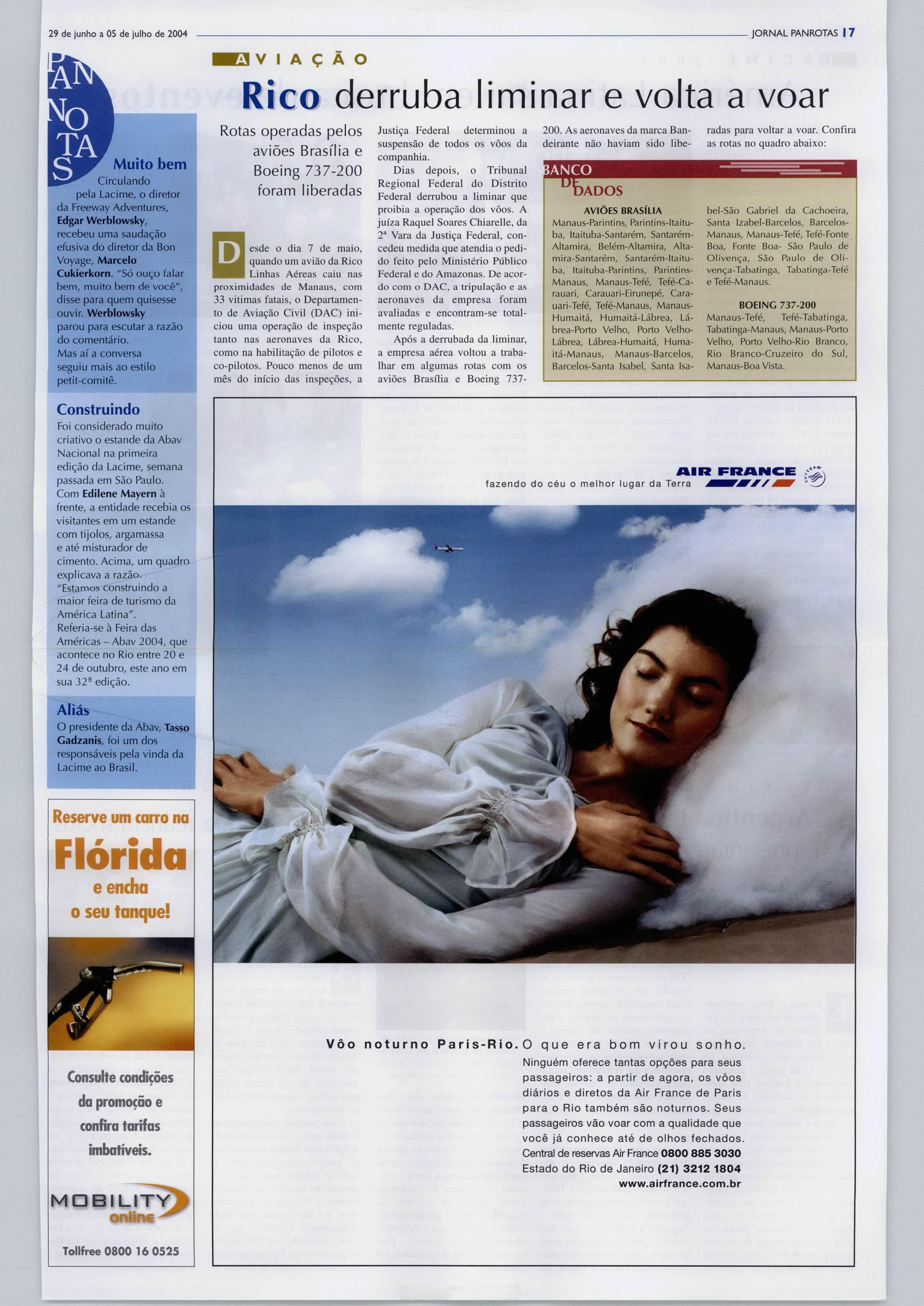 Na mesma data foi comemorada umamudança "positiva", como denominou o diretor, na rota entre Paris eo Rio de Janeiro. O vôo AF442,operadodiariamentedesde 2001,passouasernoturno,saindo doaeroportoCharlesde GauUe às 23hl5 echegandoaoTomJobimàs 5h55.Eparaatenderàcrescente demanda de passageiros, a compa nhia definiu também a troca da aeronave.Apartirde1-denovem bro,oBoeing747 substitui oatual Airbus340,emmaisumaprovada importânciadomercadocariocae nacionalparaa empresa, comoafir maadiretoraparaoRiodeJaneiro,