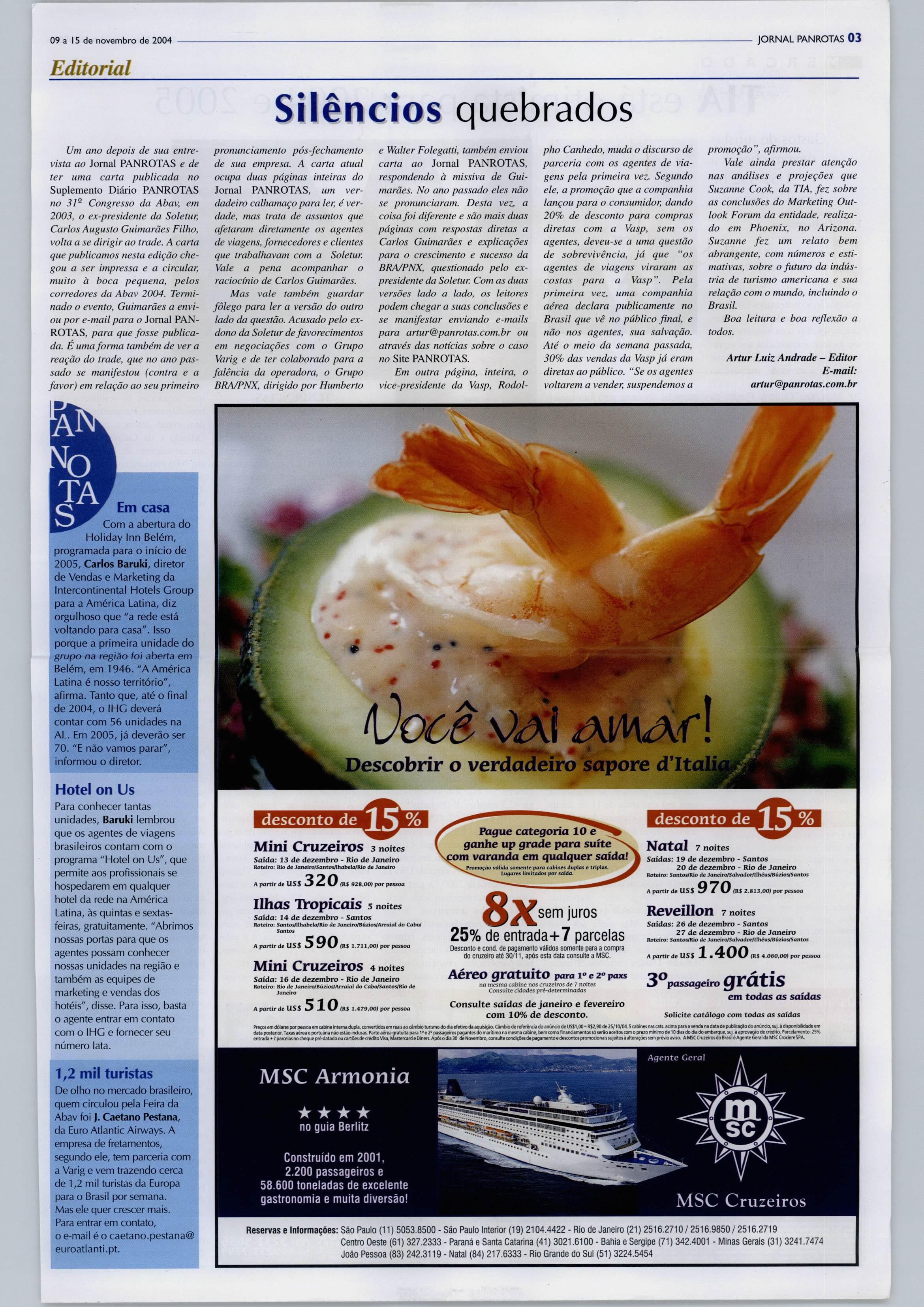 Um ano depois de sua entre vista ao Jornal PANROTAS e de ter uma carta publicada no Suplemento Diário PANROTAS no 31- Congresso da Abav,em 2003, o ex-presidente da Soletur, Carlos Augusto Guimarães Filho, volta ase dirigir ao trade. A carta que publicamos nesta edição che gou a ser impressa ea circular, muito à boca pequena, pelos corredores da Abav 2004. Termi nado o evento, Guimarães a envi ou por e-mail para o Jornal PAN ROTAS, para que fosse publica da.Éumaforma também devera reação do trade, que no ano pas sado se manifestou (contra ea favor) em relação ao seu primeiro