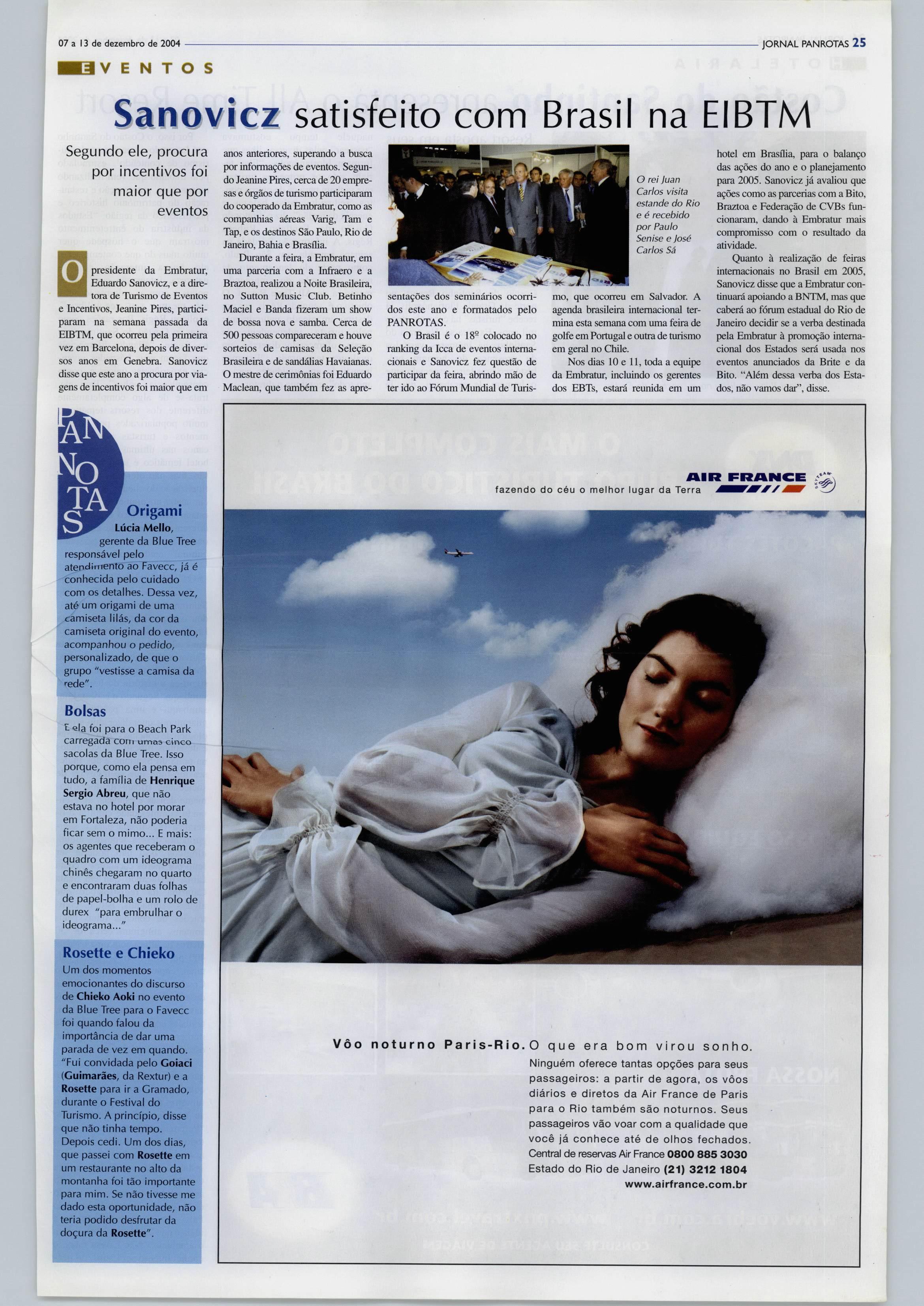 NOVO UÔO TMM ivuia smmnco do chilb BntilüHãi» um TKTem dasse Exscutiya, Mocé iã ymtmttn sua agenda cspoeãai RBXTUR/TAM SOOS.* A catia s TKVs cmMOas, Indcpentlente tia classe tfe emissão, você ganha uma ttoãsa tie viagem exclusiva REXTUll/rJUlÊ.* SENNA EXPERIENCE A retirada aos convites será feita na Av Sâo iDiz, n° 276. com a Srta Elaine, mediante apreserttaçâo das cópias dos biinetes emitidos a partir de 30 Novemixo de 2004 ••Ptomoçâo válida atéoténnino dos 1.500 convites. eatia bilhete emitiao em classe executiva, vaie S ingressos um.** cada hilhete emitido em ciasse econômica, vale f ingresso.** "SáíNTinCO MDMIRMLS CLUB" Saia y»» i»ara imssageiros tia aasse Executiva com emtfartiue no aero/»orto de Santiago do Chile. MtOs um ittsnefieão tnts fMKsageiros tmm. Localização-Asaia VlPAdmiraisCiub está iocaitzdda naárearestritade embargue dolado esquerdo da imigração- em frente ao portão 19 Horário diariamente das 05.30 às 21:30ns. Beneficfos • Serviço de txiffet. tnr, snacks. saias oe OanDo. salasparatrocade roupa, poltronas individuais, estações de traDaiho com pontos para conexão de Internet, máquinas dexeroxe fax. áreapara fumantes e acesso para passageiros com cadeira de rodas. BOAS VENDAS Ttnvi «ww.rextur.coni.br U e 14 No doméstico, as regras atuais continuam, mas na promoção internacional dos Estados, o ministro Mares Guia efetuará mudanças pedidas por Fórum de Secretários Página 18 24 o secretário Milton Zuanazzi disse que o presidente Lula assinará o documento ainda este ano. Flats terão 60 dias para se cadastrar provisoriamente Página 20 26 e 27_ Favecc altera estatuto e se desvincula da Abav Varig coloca mais corujões para o verão Costão do Santinho lança AH Time Resort