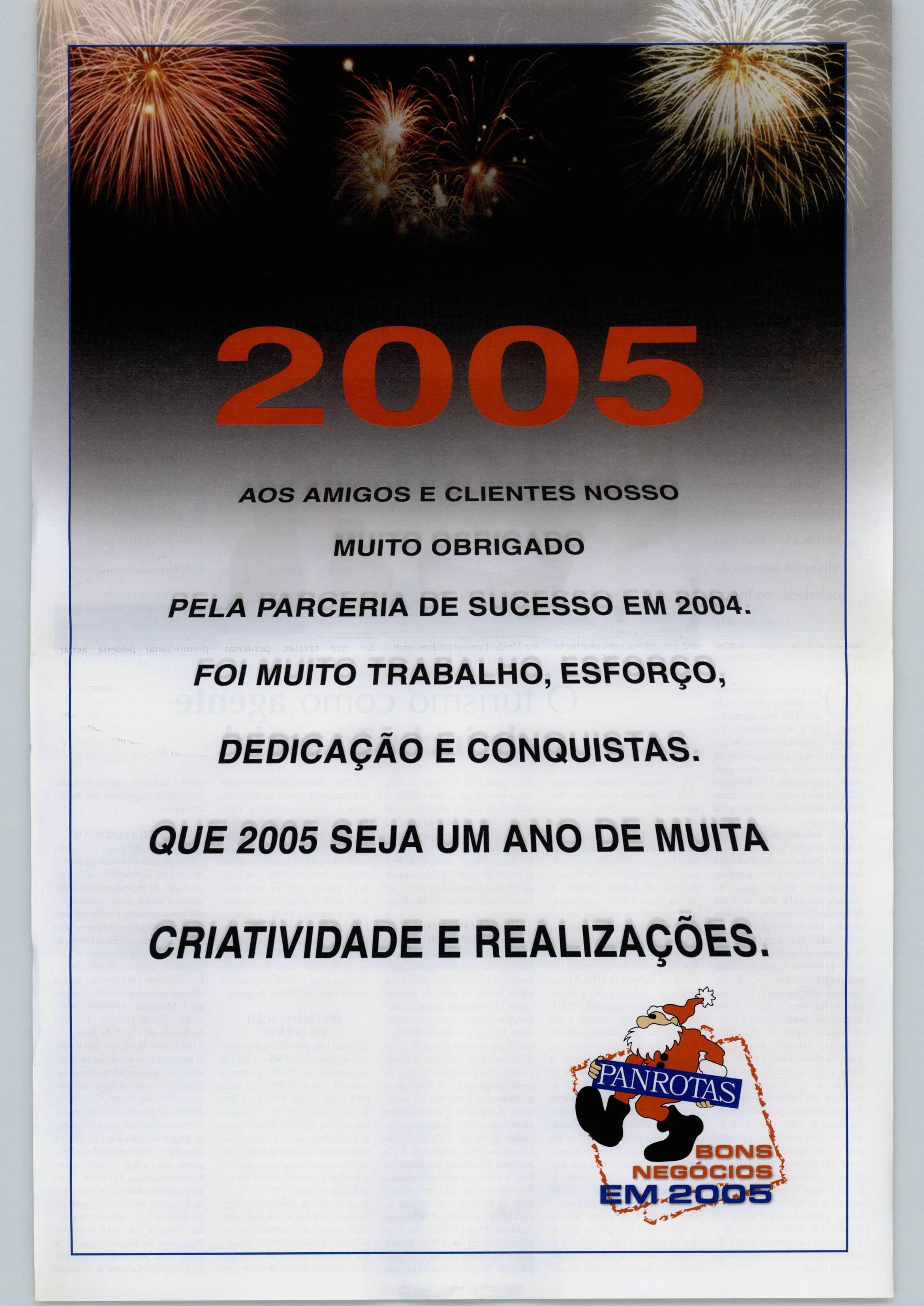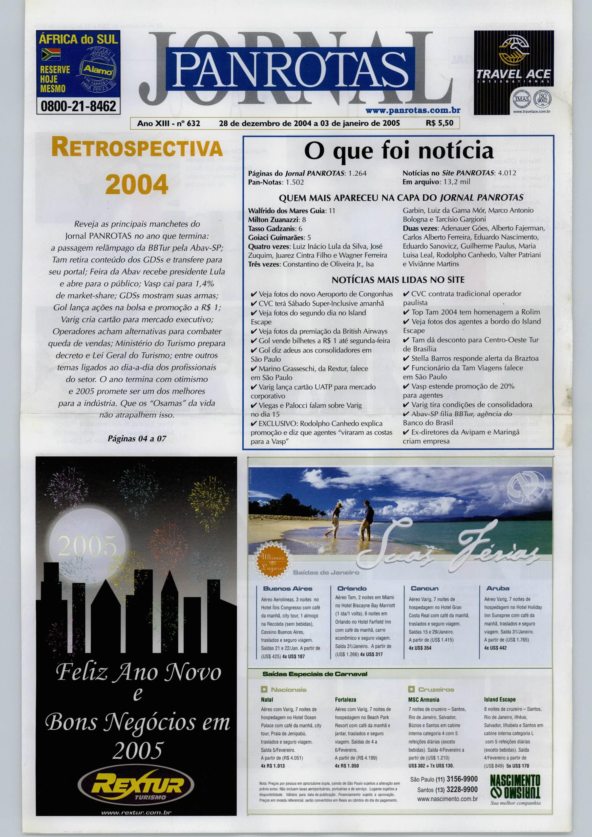 Revejaas principais manchetes do Jornal PANROTAS no ano que termina: a passagem relâmpago daBBTur pela Abav-SP; Tam retira conteúdo dos GDSs e transfere para seu portal; Feira da Abav recebe presidente Lula e abre para o público; Vasp cai para 1,4% de market-share; GDSs mostram suas armas; Gol lança ações na bolsa e promoção aR$ 1; Varig cria cartão para mercado executivo; Operadores acham alternativas para combater queda de vendas; Ministério do Turismo prepara decreto eLei Geral do Turismo; entre outros temas ligados ao dia-a-dia dos profissionais do setor. O ano termina com otimismo e 2005 promete ser um dos melhores para a indústria. Que os ''Osamas" davida não atrapalhem isso.