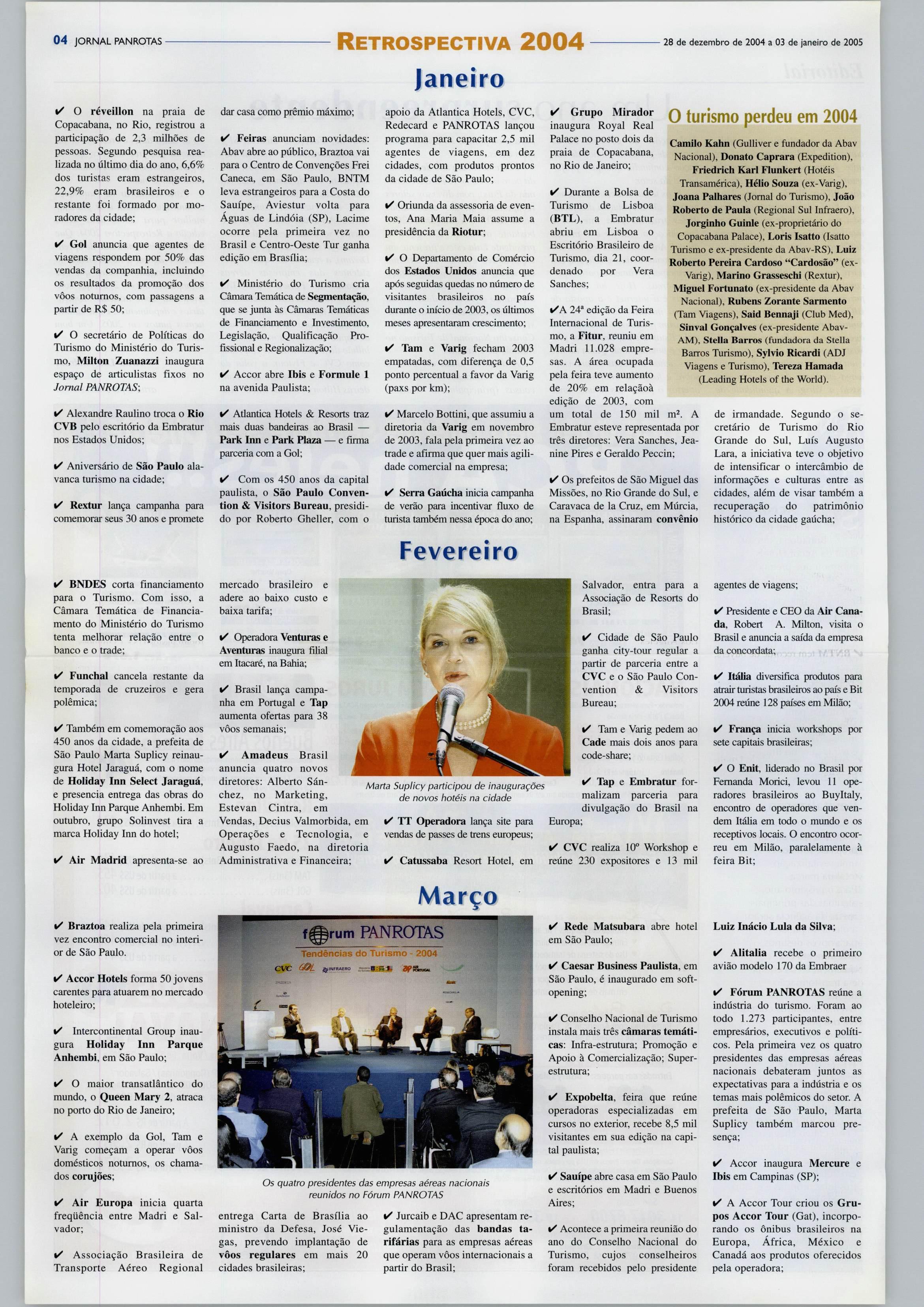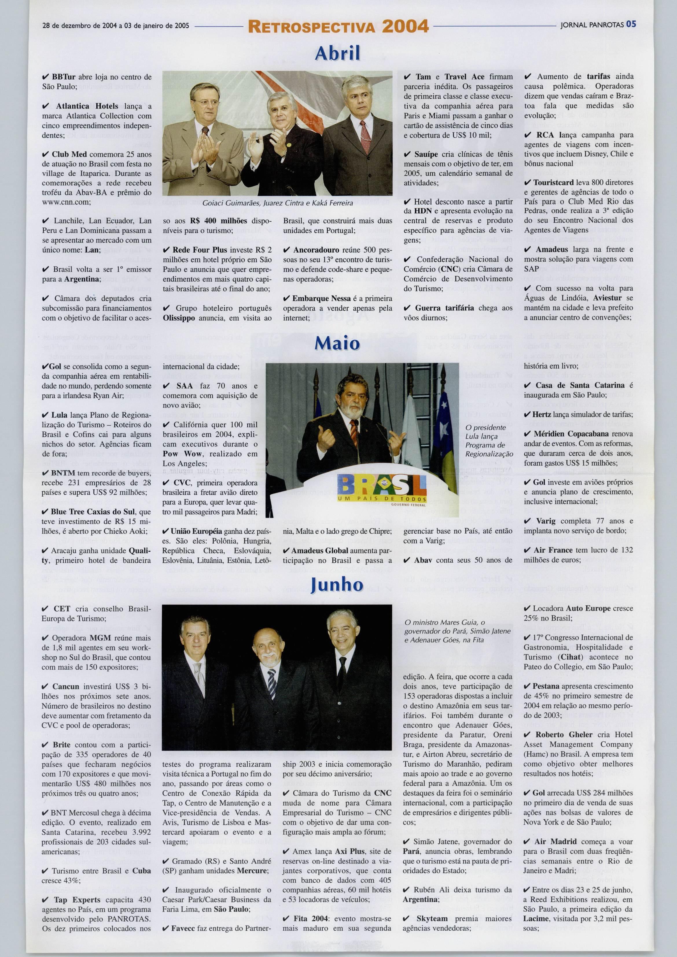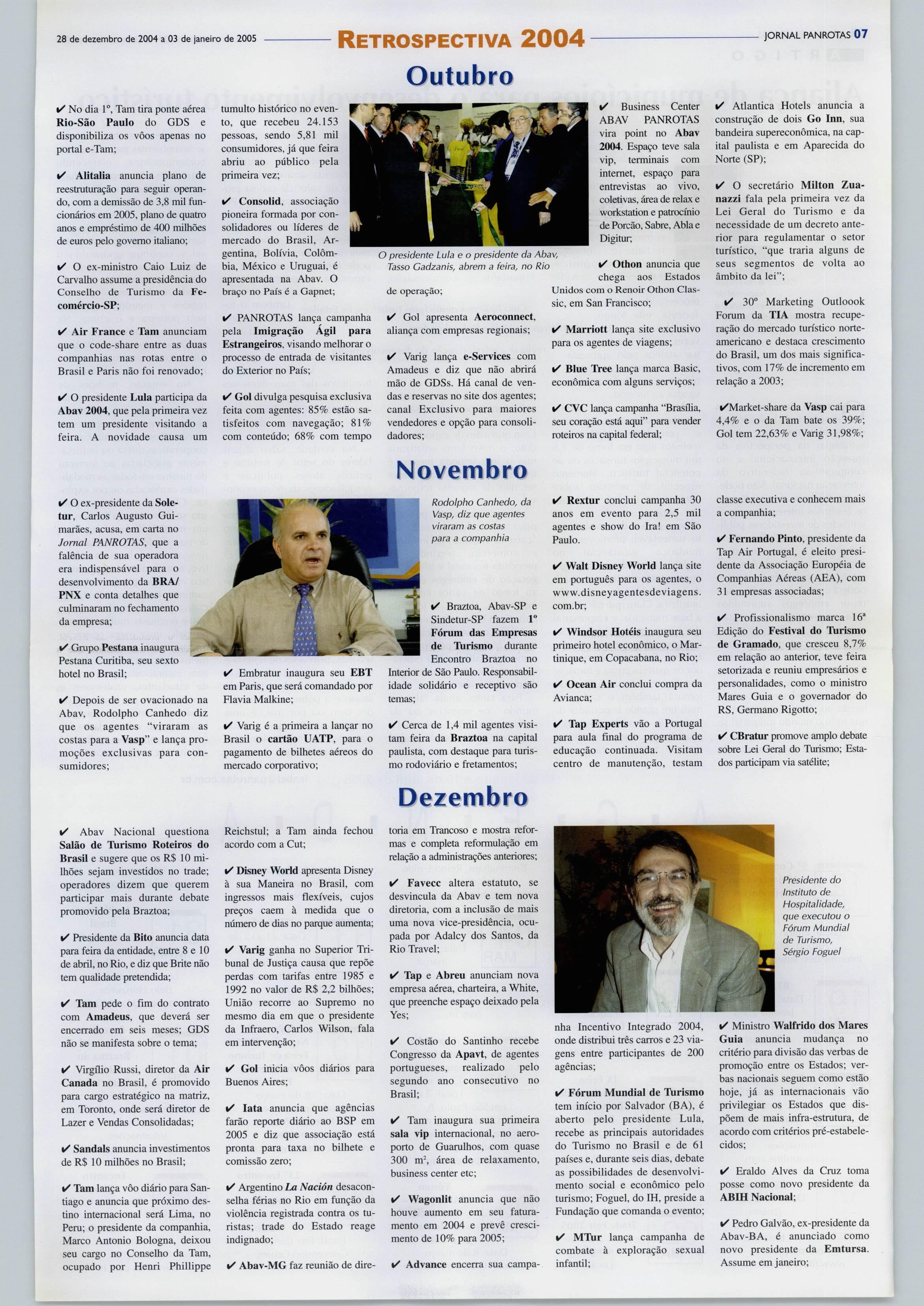 Foi também um ano de retoma da para o turismo (e para a econo mia do País), com diversos setores recuperando perdas acumuladas desde 2001e começando 2005 bastante otimistas. Em 2004, o presidente Lula esteve presente em importantes eventos de turismo, da Abav, onde sua segurança causou um tumulto histórico, atrasando a feira em duas horas, ao Fórum Mundial, tendo inclu sive recebido os membros do Conselho Nacional de Turismo no Palácio do Planalto.