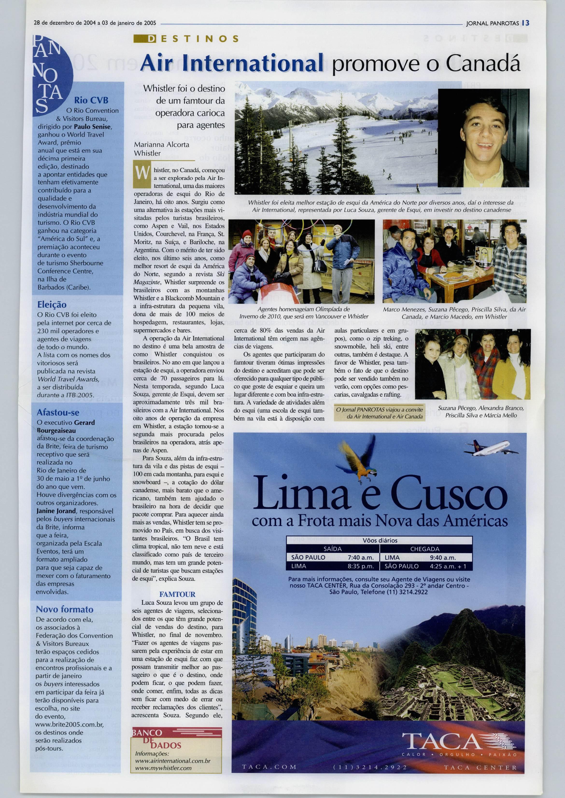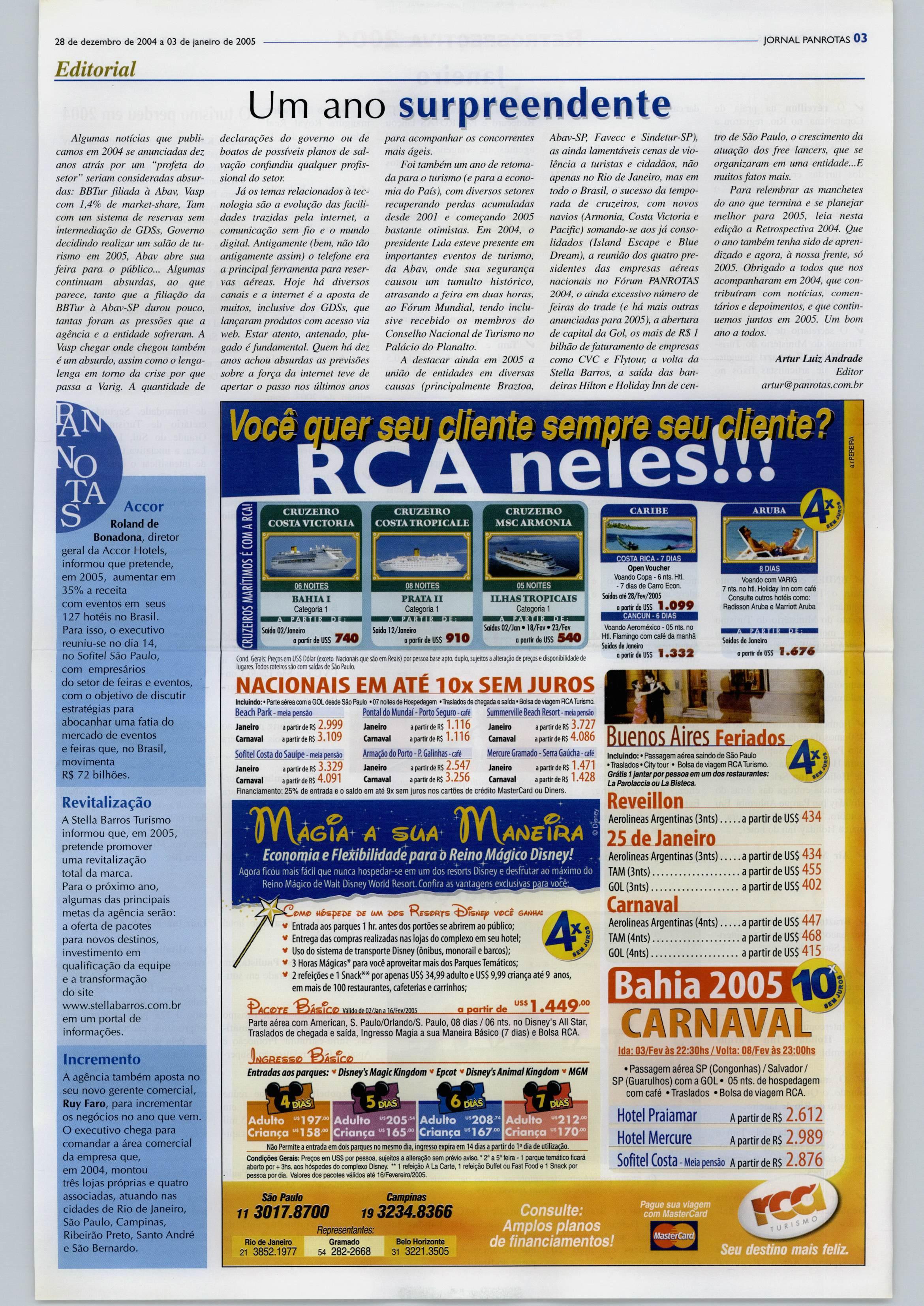 Abav-SP, Favecc e Sindetur-SP), as ainda lamentáveis cenas de vio lência a turistas e cidadãos, não apenas noRiode Janeiro, masem todoo Brasil, o sucesso datempo rada de cruzeiros, com novos navios (Armonia, Costa Victoria e Pacific) somando-se aos já conso lidados (Island Escape e Blue Dream), a reunião dos quatro pre sidentes das empresas aéreas nacionais no Fórum PANROTAS 2004, o ainda excessivo número de feiras do trade (e há mais outras anunciadas para 2005),a abertura decapitalda Gol, osmaisdeR$ 1 bilhão de faturamento de empresas como CVCeFlytour,avoltada
