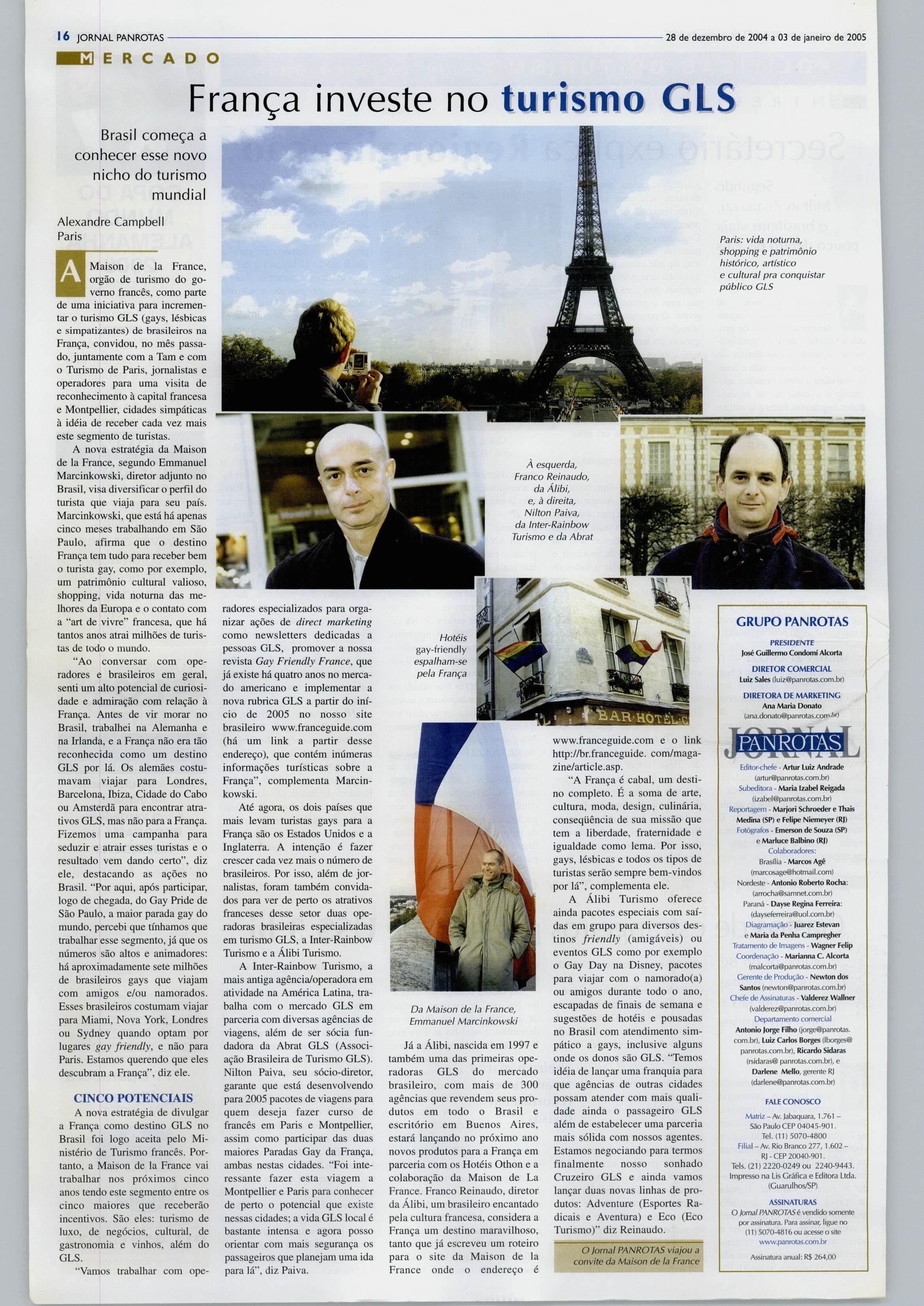 radores especializados para orga nizar açõesde direct marketing como newsletters dedicadas a pessoas GLS, promover a nossa revista Gay Friendly France, que já existe há quatro anosno merca do americano e implementar a nova rubrica GLSa partir doim'cio de 2005 no nosso site brasileiro www.franceguide.com (há um link a partir desse endereço), que contém inúmeras informações turísticas sobre a França", complementa Marcin kowski. Atéagora,osdoispaísesque maislevamturistasgaysparaa França sãoos Estados Unidos ea Inglaterra. A intenção é fazer crescer cada vez mais o número de brasileiros.Porisso,alémde jor nalistas, foram também convida dosparaverdepertoosatrativos franceses desse setor duas ope radorasbrasileiras especializadas em turismo GLS, a Inter-Rainbow Tiuismo eaÁlibiTurismo.