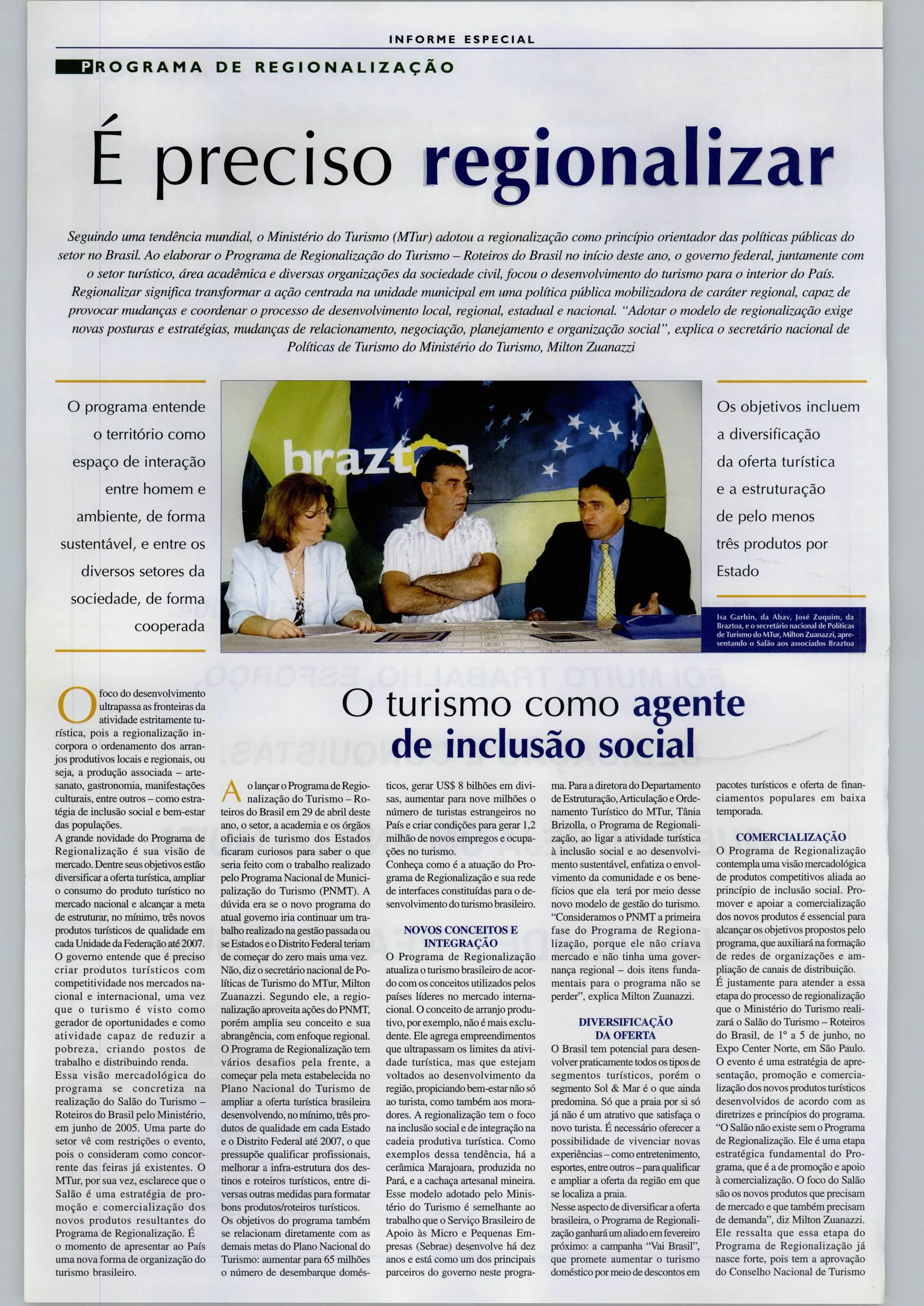 ZUANAZZI o Ministério do Turismo vai orientar as regiões na criação dos produtos, dara linha de atuação, monitorar, ver com mais profundidade osatra tivos. Vamos contratar uma in teligência para formatar e enxer gar esses destinos dentro das novas tendências. Quanto mais único, quanto mais identidade, melhor.