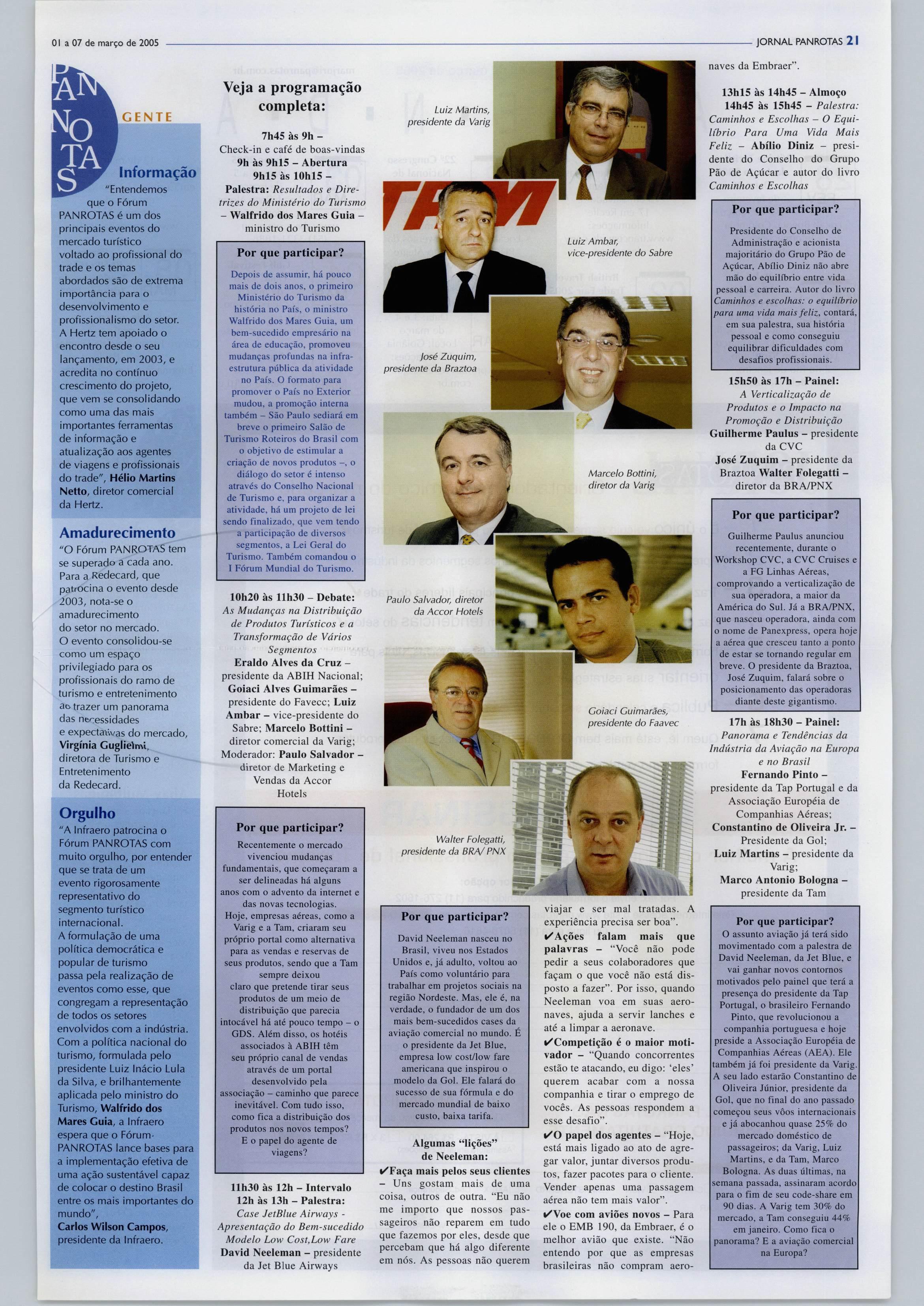 Neeleman, Guilherme Paulus, Walter Folegatti, Abílio Diniz, Marco Antonio Bologna, Luiz Martins, Constantino Jr., Fernan do Pinto, Goiaci Alves Guima rães, Marcelo Bottini, José Zuquim, Eraldo AlvesdaCruz, Paulo Salvador e Luiz Âmbar dis pensam apresentações e são os palestrantes ou debatedores do evento, que reserva muitas sur presas. As inscrições devem ser feitas pelo www.panrotas.com.br até o dia 3. Não dá para perder. Artur Luiz Andrade Editor artur@panrotas.com.br