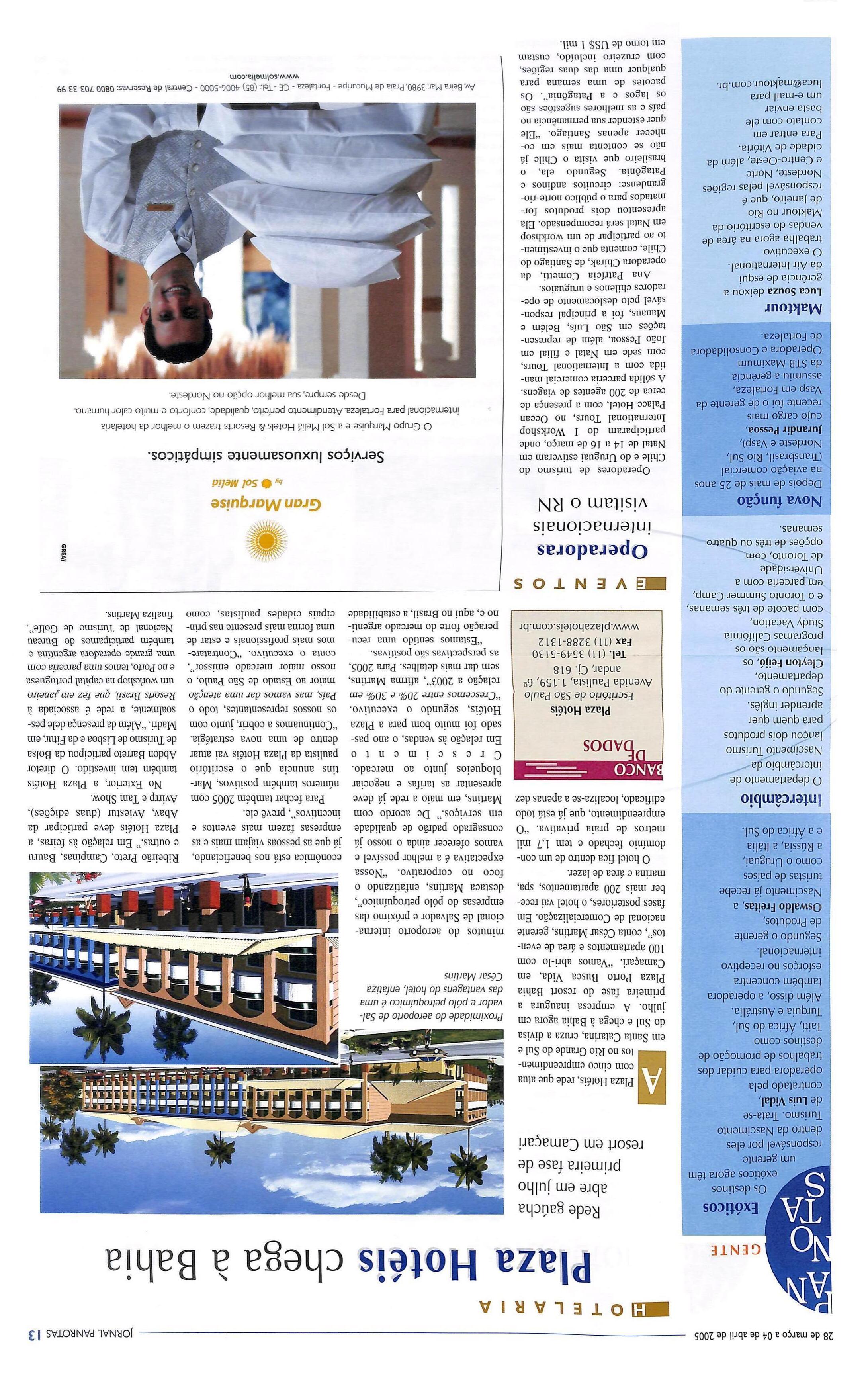 com a Costa Leste. O segundo especial nesta edição é sobre o Encontro da Nascimento Turismo, que reuniu 280 agentes de viagens em Mogi das Cmzes(SP). Veja também a pesquisa do Ministério do Turismo com 50 grandes empresas brasileiras, as novidades da Rio Quente Resorts e os planos da American Airlines no Brasil. Na próxima semana traremos os principais lançamen tos do Encontro Comercial Braztoa, que ocorre em São Paulo.