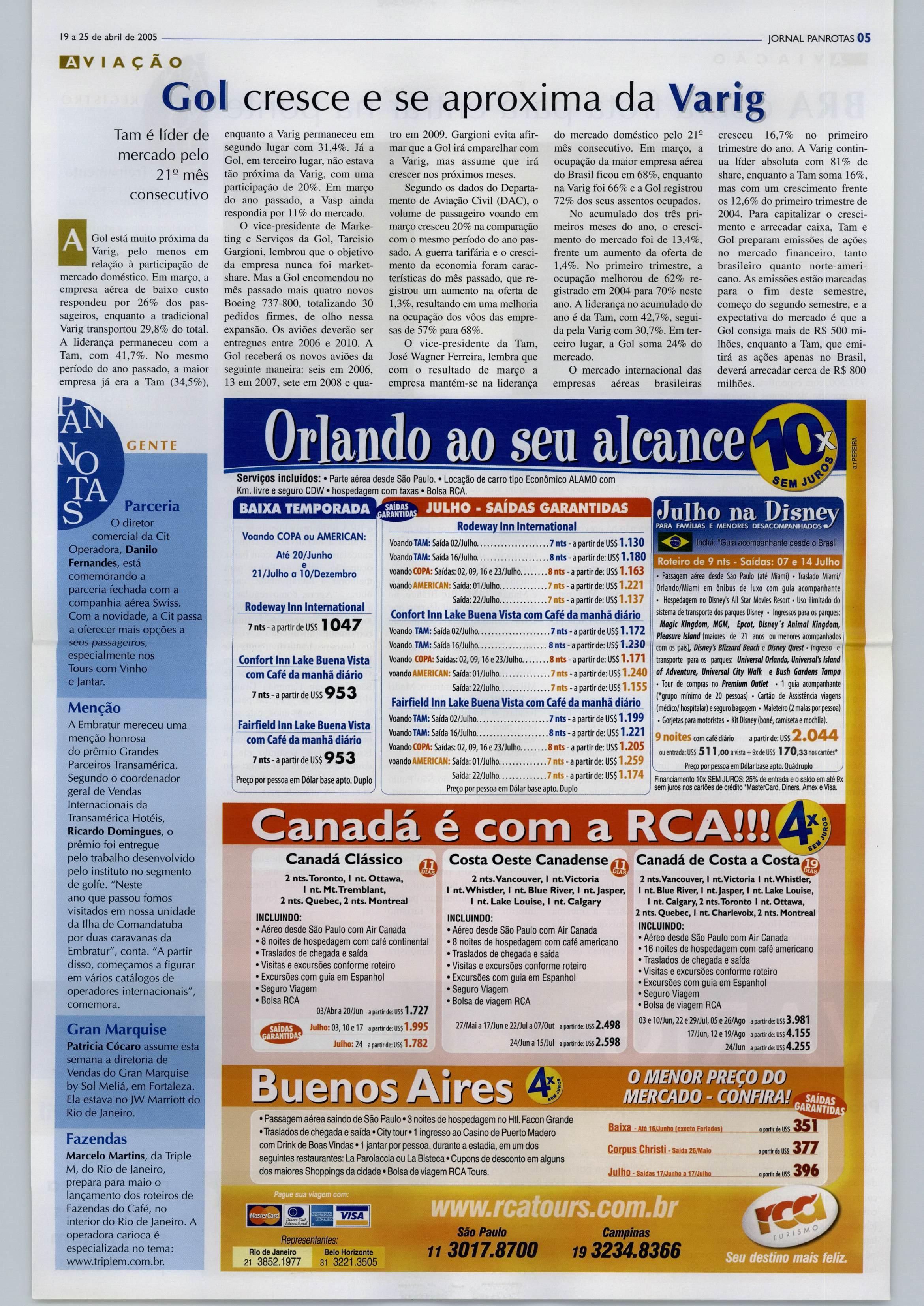 Varig, pelo menos em relação à participação de mercadodoméstico.Emmarço,a empresa aérea de baixo custo respondeu por26%dospas sageiros, enquanto a tradicional Varig transportou 29,8%dototal. A liderança permaneceu com a Tam, com 41,7%. No mesmo período doano passado, a maior empresa já era aTam (34,5%),