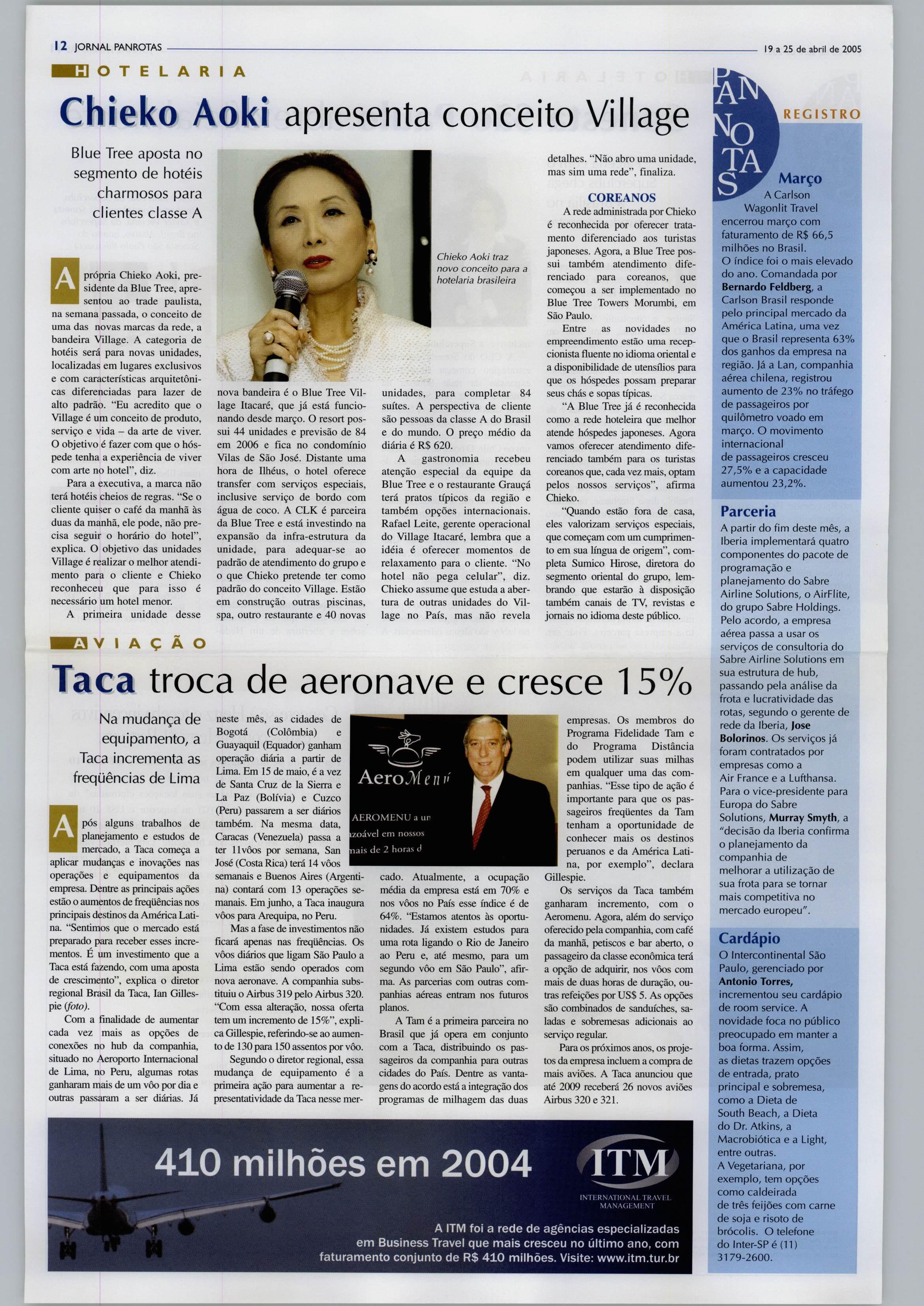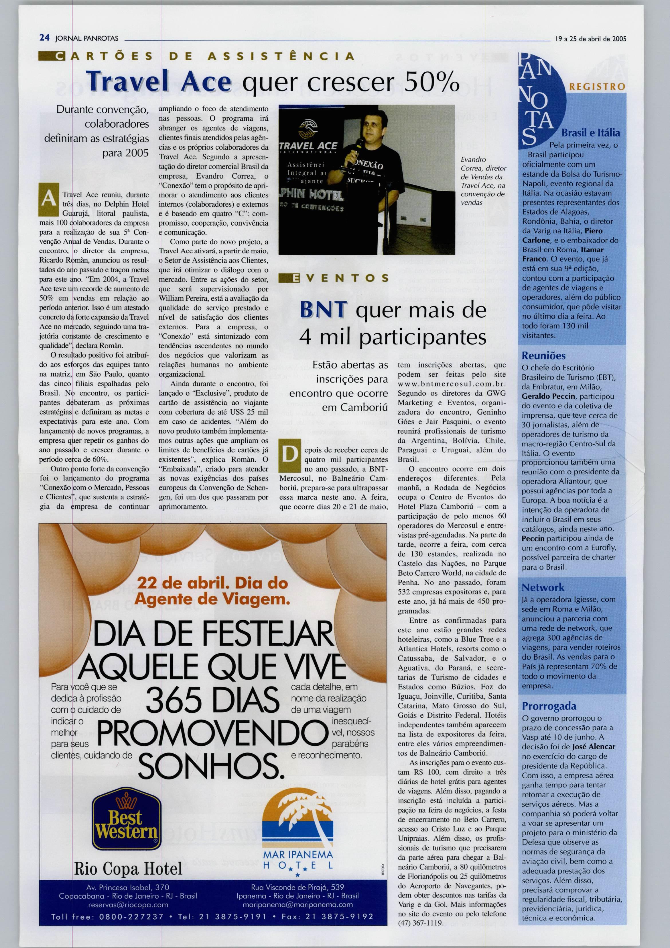 Expositores e compradores da feira daBito,que ocorreu nase mana passada, noRiode Janeiro, foram unânimes em apontar a Cidade Maravilhosa comoimpres cindível nos pacotes para turistas estrangeiros que chegam ao País. Pesquisa da Embratur já havia apontado queoRioéo grande ícone nacional noExterior, segui dodeFozdo Iguaçu edaAmazô nia, que recebem menos turistas estrangeiros. O presidente da Bito, RobertoDultra,éoprimeiroa dizer,porém,queo Brasil precisa de mais portões de entrada. A Amazônia émuito perto dos Esta dos Unidos para não ter umvôo direto, de olho em ecoturistas.
