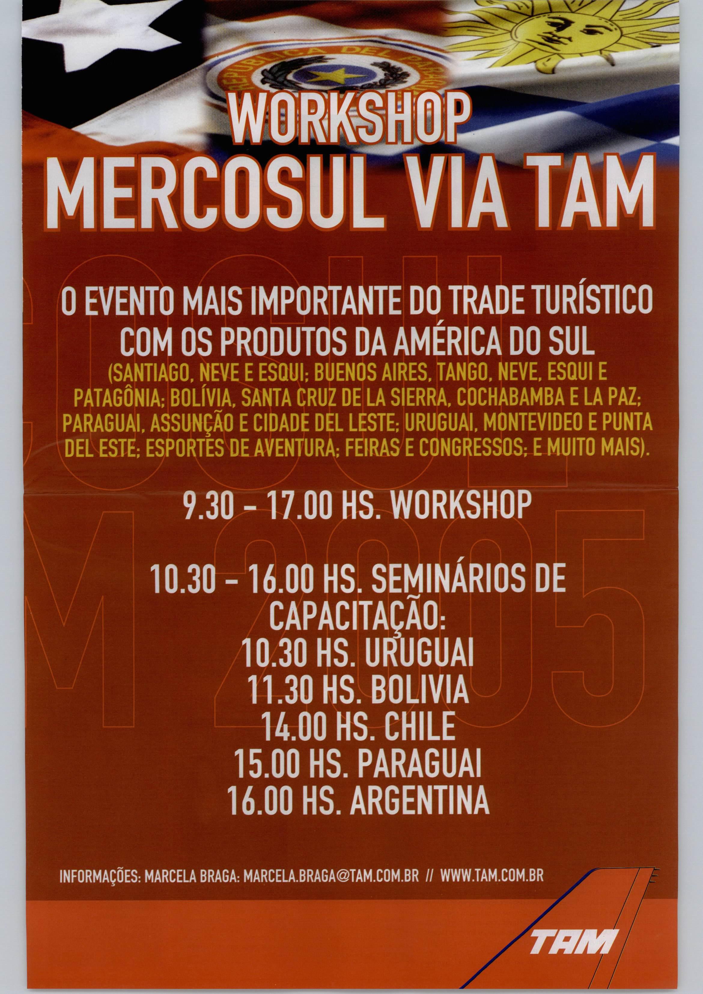 Nopróximodia27,aTamrealiza,emSãoPauloo Worfehop Mercosul ViaTam.O evento, que espera cerca dedois miJ profissionais,tem como objetivo promover ainteraçãodosagentes deviagensdoBrasilcom provedores deserviçosda América doSul. Naocasião,haveráencontrosde comercializações, semináriosde capacitação para agentes e operadores, alémde ações de fidelização e incentivo devendas.Nastrês edições anteriores do evento, a intenção foimostrarosprodutos turísticos doBrasilparaprofissionaisde cidade como Buenos Aires, Assunção, Santa Cruz deIa Sierra, SantiagodoChilee Montevidéu. Agora,comoeventoemSão Paulo, pela primeira vez outros países da América doSul divulgarão seusprodutosdentrodoBrasil.Agrandenovidadedoencontroéque atéadatado evento estará dispomVelao público uma ferramenta virtualquepermitiráoacessoon-lineao workshop, pormeiodosite www.mercosulviatam.com.br.