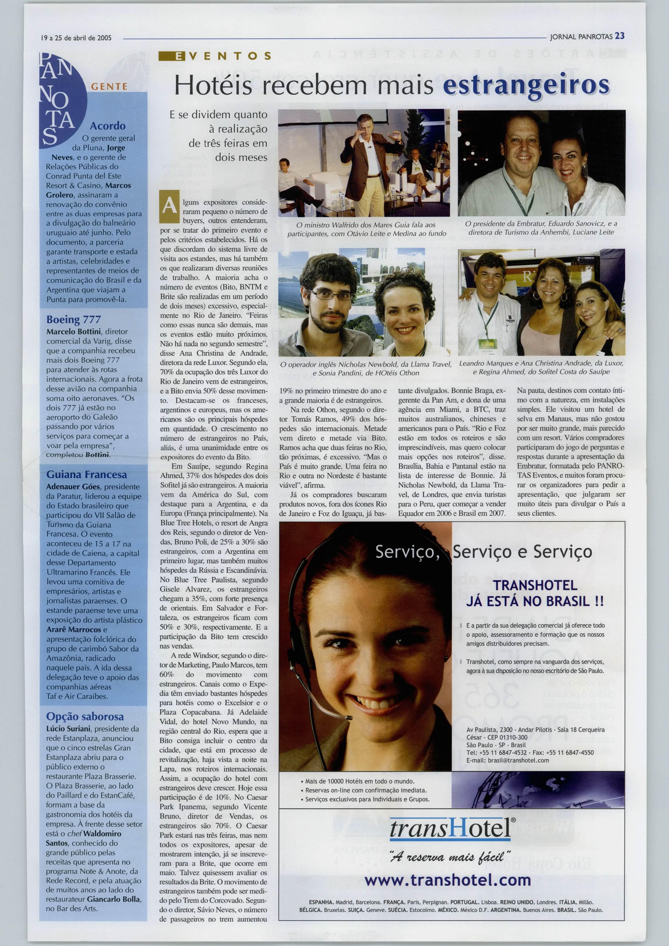 sul. O projeto de integração da aviação intra-regional no Mercosul, que o Ministério doTurismo está incentivando, é vital nesse sentido. "O Brasil é um País muito grande. Acho natural haver uma feira de receptivo noRioe outra no Nordeste disse Tomás Ramos, diretor da Hotéis Othon. As boas relações entre aBitoea Braztoa, apadrinhadas pelo MTur, mostram que o receptivo brasileiro viveum novo momento. E isso é bom.