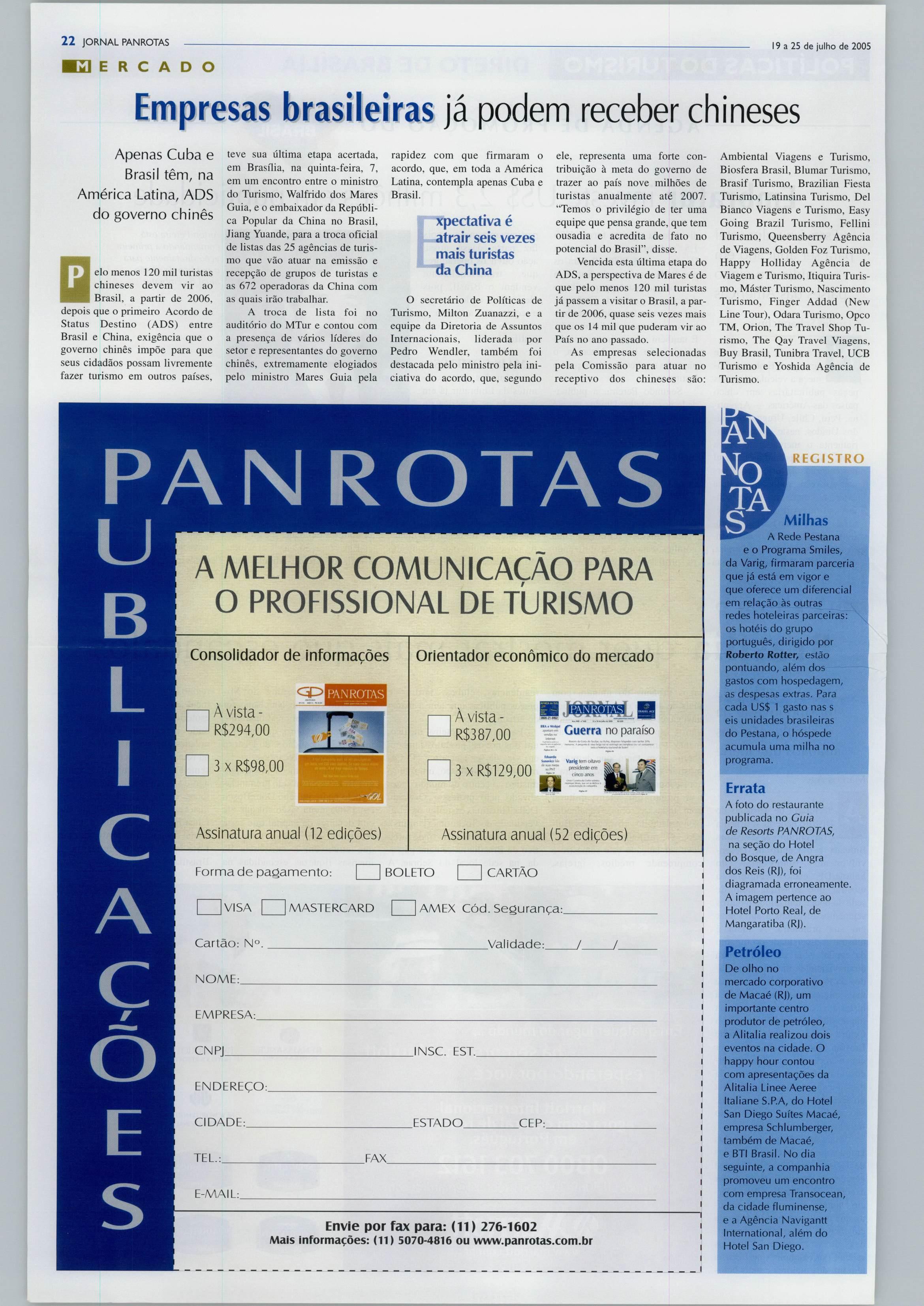 ÍVlatriz - Av.Jabaquara, 1.761 -SãoPaulo CEP 04045-901 - Tel. (11) 5070-4800 Filial - Av. RioBranco277,sala 1.508 RJ-CEP 20040-901. leis. (21) 2220-0249 ou 2240-9443. ImpressonaLisGráficaeEditoraLtda. (CuarulhoiíP) ASSINATURAS OJornal PANROTAS évendidosomentepor assinatura.Paraassinar,ligueno (11) 5070-4816 ou acesse osite wvvw.panrotas.com.br Assinatura anuai: RS 387,00