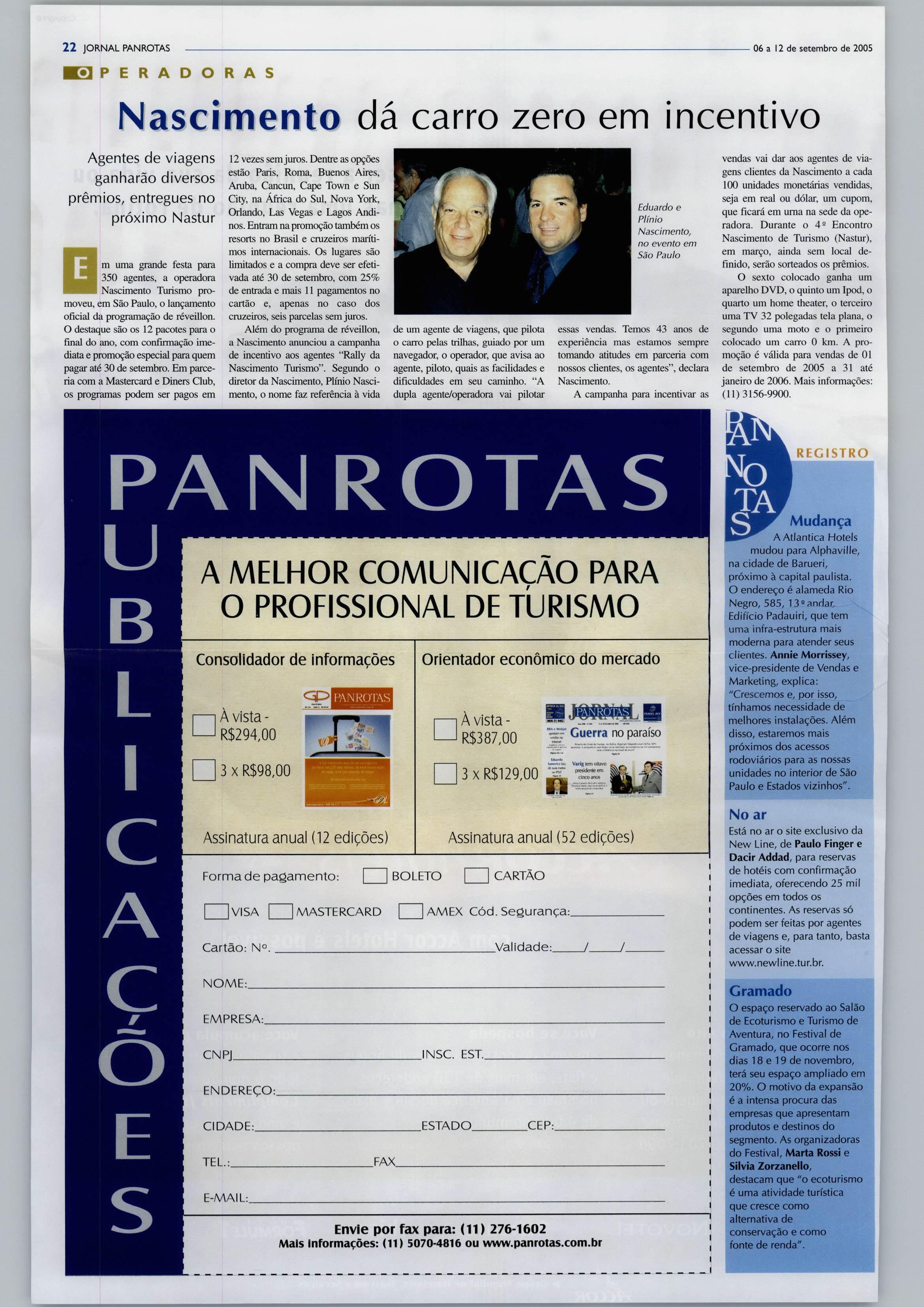 vendasvaidaraosagentesdevia gens clientes da Nascimento acada 100 unidades monetárias vendidas, sejaemrealoudólar,umcupom, queficaráemumanasededaope radora. Durante o 4= Encontro Nascimento de Turismo (Nastur), em março, ainda semlocalde finido, serão sorteados os prêmios. O sexto colocado ganha um aparelho DVD, o quinto um Ipod, o quartoumhometheater,oterceiro uma TV 32 polegadas tela plana, o segundo uma motoeo primeiro colocado um carro Okm.A pro moção é válida para vendas de01 de setembro de 2005 a31 até janeiro de2006.Maisinformações: (11)3156-9900.