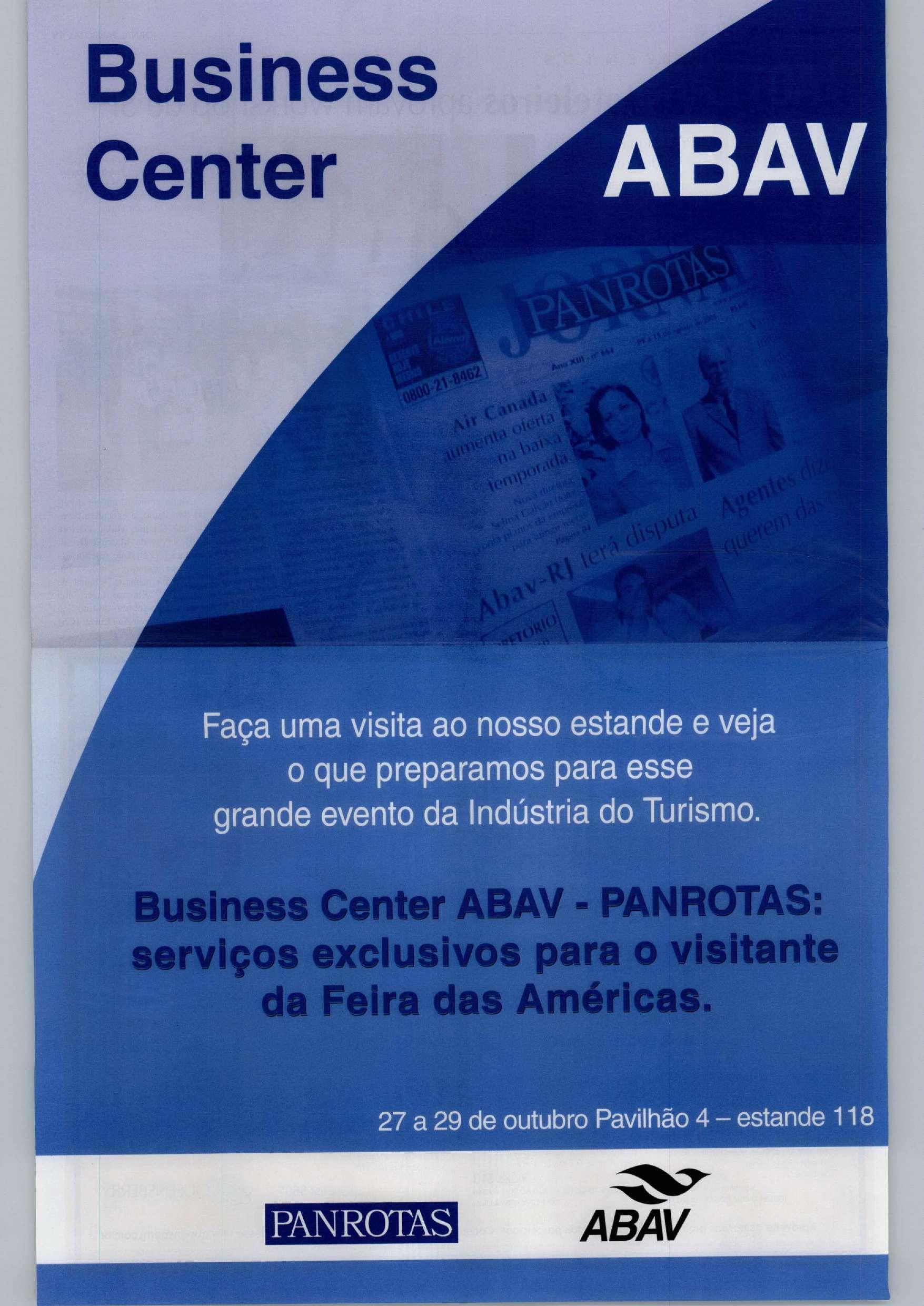herdada do Salão do Turismo. O PANROTAS mais uma vez se une à Abav e estará oferecen do, no Business Center ABAV PANROTAS. serviços de e-mail, Internet, relaxamento, comes e bebes, salas de reunião (diversas coletivas de imprensa aconte cerão lá) e também terá um estú dio para transmissões ao vivoda TV PANROTAS. Como faz desde J977, ininterruptamente, o PANROTAS também produzirá na feira o Suplemento Diário PANROTAS na Abav, com edições na quinta-feira, 27, sexta-feira. 28,e sábado, 29.Eo Site PANROTAS trará a cober
